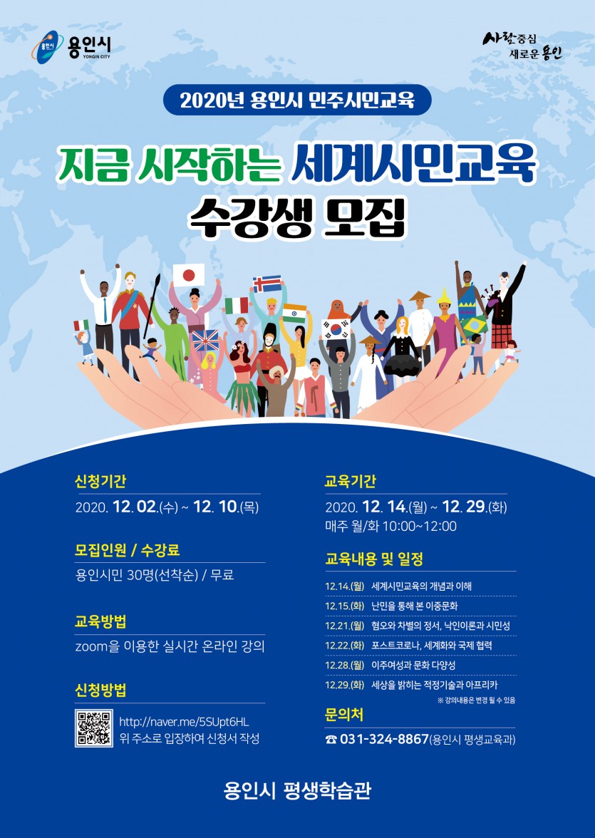 세계시민성 함양 위한 온라인 강좌 참가자 30명 모집 용인시, 10일까지…‘지금 시작하는 세계시민 교육’ 주제 6회 강의 - 김경순 기자 2020-12-08 21:28 가 본문내용 확대/축소 본문 세계시민성 함양 위한 온라인 강좌 참가자 30명 모집 용인시는 10일까지 세계시민성 함양을 위한 용인민주교육 온라인 강좌에 참여할 시민 30명을 모집한다고 밝혔다. 교육은 14일부터 29일까지 매주 월․화요일 오전 10~12시 PC나 모바일 기기에서 실시간 화상회의 앱인 Zoom을 통해 진행된다. 14일엔 ‘세계시민교육의 개념과 이해’를 시작으로 15일엔 ‘난민을 통해 본 이중문화’, 21일엔 ‘혐오와 차별의 정서; 낙인이론과 시민성’을 주제로 실시간 강좌가 열린다. 또 22일엔 ‘포스트 코로나, 세계화와 국제협력’에 대해, 28일엔 ‘이주여성과 문화 다양성’을, 29일엔 ‘세상을 밝히는 적정 기술과 아프리카’등 6회에 걸쳐 지구촌 속 세계시민성을 키울 수 있는 다양한 강좌가 진행된다. 강의에 참여하려면 신청 링크(http://naver.me/5SUpt6HL)에 통해 온라인으로 간편하게 접수하면 된다. 시민 누구나 무료로 강의에 참여할 수 있다. 시 관계자는 “세계시민 교육은 보다 포용적이고 정의롭고 평화로운 세상을 만드는데 이바지할 수 있는 지식과 태도를 기르기 위한 것”이라며 “이번 교육은 세계시민의 역할에 대한 방향성을 모색해 보는 시간이 될 것”이라고 말했다. 좋아요 0 싫어요 0 김경순 기자 기자의 다른기사 보기 목록 댓글목록 이전글 처인구, 포곡읍 삼계1지구 지적재조사 완료 20.12.08 다음글 용인시, 동백호수공원 야외무대 비가림막 설치 20.12.08
