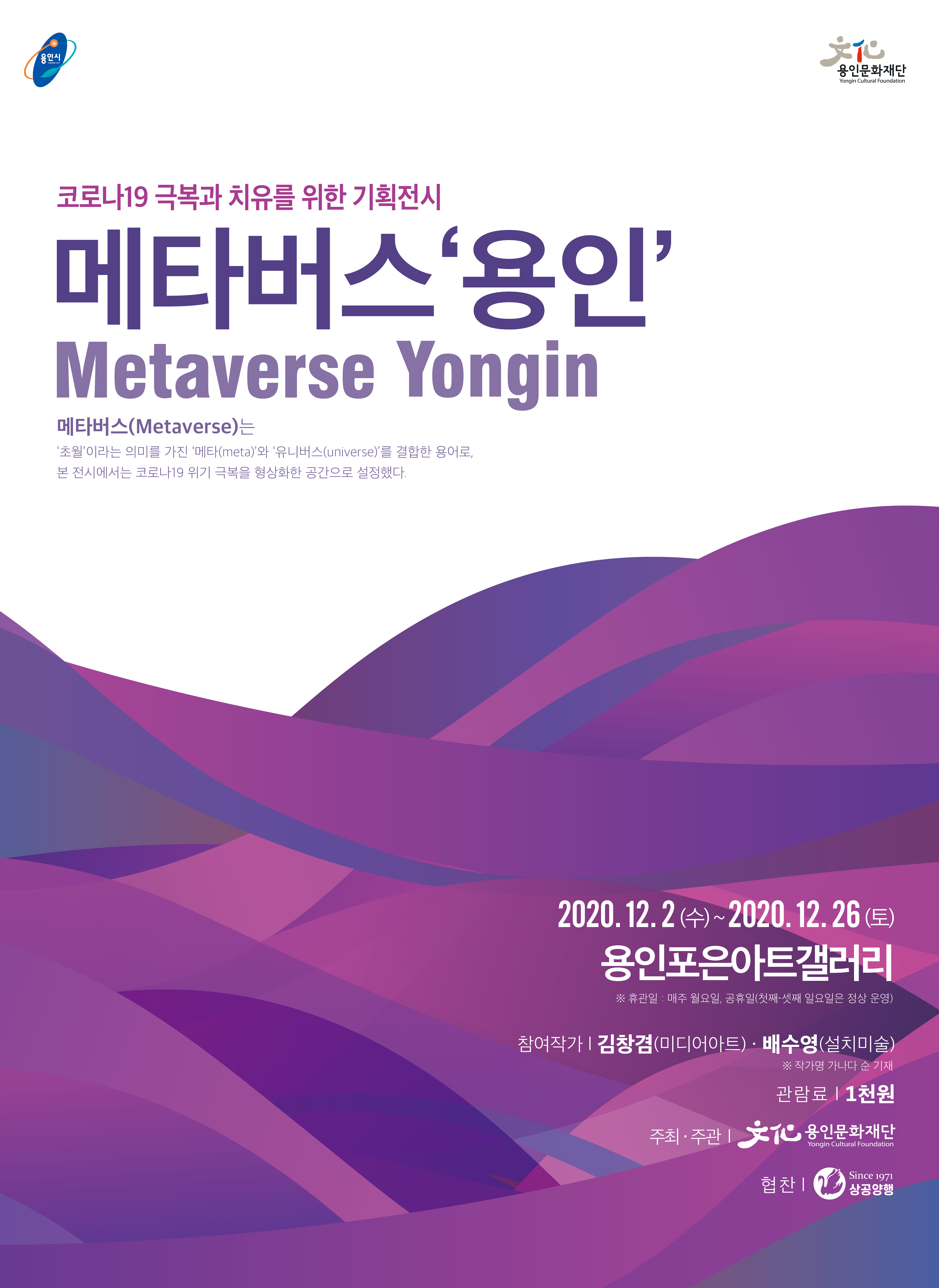 <메타버스(Metaverse) ‘용인’> - 코로나19 극복과 치유를 위한 기획전시 김경순 기자 2020-12-10 22:52 가 본문내용 확대/축소 본문 <메타버스(Metaverse) ‘용인’> (재)용인문화재단(이사장 백군기)은 오는 12월 2일(수)부터 26일(토)까지 용인포은아트갤러리에서 코로나19 극복과 치유를 위한 기획전시 <메타버스 ‘용인’>을 개최한다. 이번 전시에서 ‘메타버스’는 우리에게 곧 다가올 ‘코로나19 극복과 치유’를 상징한다. <메타버스 ‘용인’>은 코로나19 극복을 위해 한마음으로 노력하는 용인의 시민의식을 담아내고자 했다. 전시장을 찾는 관람객은 희망적 미래와 마주하며 마음의 안식을 얻을 수 있을 것이다. 배수영 작가의 설치미술은 폐기물에 빛과 자연의 생명감을 불어 넣는 작업을 통해 상생과 희망의 메시지를 전한다. 특히, 전시 작품 중 배수영 작가의 <가감승제(加減乘除)>는 용인 어린이들의 참여로 완성되어 코로나19 극복을 향한 시민의 염원을 담아낸다. 또한 ‘조화’와 ‘치유’에 주목하는 김창겸 작가의 미디어아트 작업은 인류가 겪는 현재의 혼란 속에서 대중을 위로하고 희망을 전한다. 김창겸 작가의 <봄이 오는 이유>는 윤회하듯 필연적으로 다시 돌아오는 봄을 표현했다. 본 전시 티켓을 구매하면 ㈜상공양행에서 생산한 마스크가 자동으로 기부된다. 기부될 마스크 총 2,000장은 나눔 캠페인의 일환으로 용인 지역사회 시설에 전할 계획이다. ㈜상공양행은 1971년에 설립하여 국민의 건강한 삶의 질 향상을 위해 노력해온 기업으로 코로나19 극복을 염원하며 지역사회를 위한 기부의 뜻을 밝혔다. 용인문화재단은 코로나19 감염 예방을 위해 전시관람객 분산을 위한 사전예약제 운영, 인원 수 제한, 체온측정, 손 소독, 마스크 착용 확인, 문진표 작성 등을 실시하여 안전한 운영에 최선을 다할 예정이다. 전시 관람 사전예약은 용인문화재단 홈페이지(www.yicf.or.kr)에서 가능하며 결제는 현장에서만 가능하다. 본 전시는 전체관람가로 티켓 가격은 1천원이다. 좋아요 0 싫어요 0 김경순 기자 기자의 다른기사 보기 목록 댓글목록 이전글 용인시의회, 지방자치법 전부개정안 국회 통과 환영 20.12.10 다음글 용인문화재단, <용인 컬러맵핑> 온·오프라인 전시회 개최 20.12.10