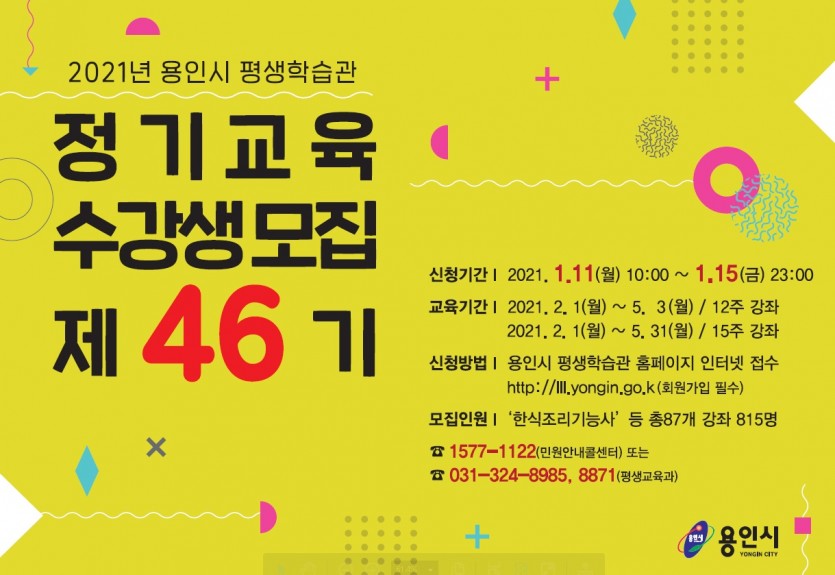 용인시는 수지구 풍덕천동 평생학습관에서 제46기 정기교육에 참여할 수강생 815명을 11일부터 15일까지 모집한다고 밝혔다.