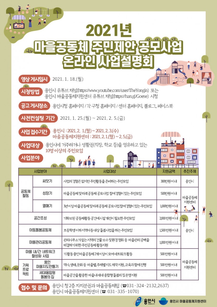 아울러 시는 사업의 이해를 돕기 위해 제작한 사업설명회 영상을 18일부터 시 및 용인시 마을공동체지원센터 유튜브 채널에 연중 게시해 놓을 계획이다.