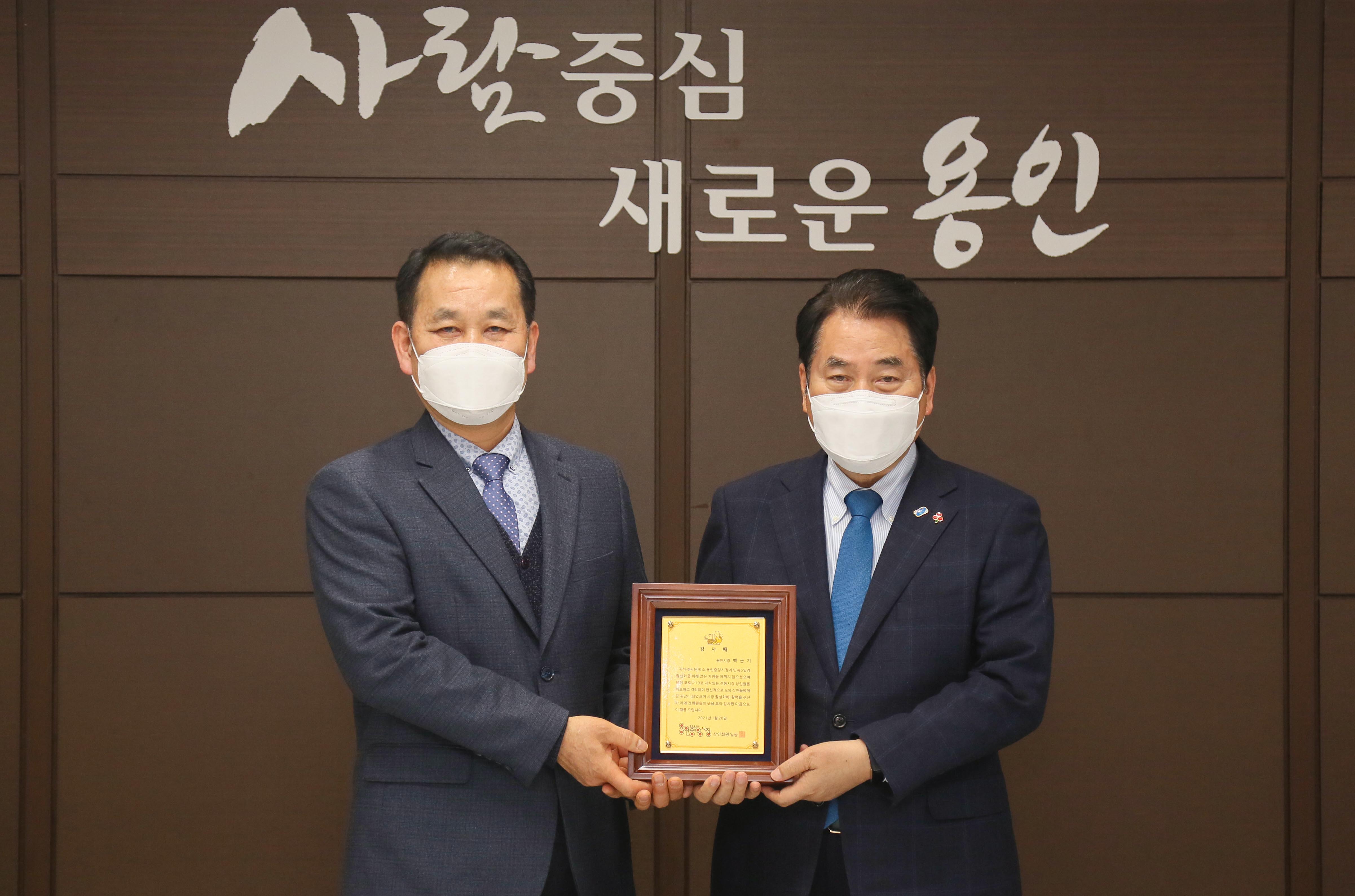 백군기 용인시장, 용인중앙시장 상인회 감사패 받아 김경순 기자 2021-01-28 22:00 가 본문내용 확대/축소 본문 백군기 용인시장, 용인중앙시장 상인회 감사패 받아백군기 용인시장, 용인중앙시장 상인회 감사패 받아 백군기 용인시장은 27일 시청 시장실에서 전통시장 활성화에 기여한 공로로 용인중앙시장 상인회로부터 감사패를 받았다고 밝혔다. 코로나19 위기로 시장을 찾는 시민 발길이 줄어 어려움이 큰 가운데 시가 시장에 활력을 불어넣기 위해 다양한 노력을 기울인 데 대한 감사의 뜻에서다. 시는 지난해 ‘나도 가수다’, ‘Human 김량장 축제’ 등 다양한 행사를 지원하고 주차환경 개선을 위해 제2공영주차장 증설 공사를 추진하고 있다. 김진건 상인회장은 “용인중앙시장과 민속5일장에 생기가 넘치도록 다양한 지원과 관심을 보여준 시에 보답하고 싶어 감사패를 준비했다”고 말했다. 백 시장은 “용인중앙시장 상인회로부터 뜻깊은 감사패를 받아 매우 기쁘다”며 “오랜 전통의 용인중앙시장이 명맥을 이어가도록 실질적인 지원을 해 시장 활성화에 적극 노력할 것”이라고 말했다. 좋아요 0 싫어요 0 김경순 기자 기자의 다른기사 보기 목록 댓글목록 이전글 4개 특례시 시장, 특례 권한 확보 본격 착수 21.01.28 다음글 코로나19 백신 접종 위한 사전 준비 돌입 21.01.28
