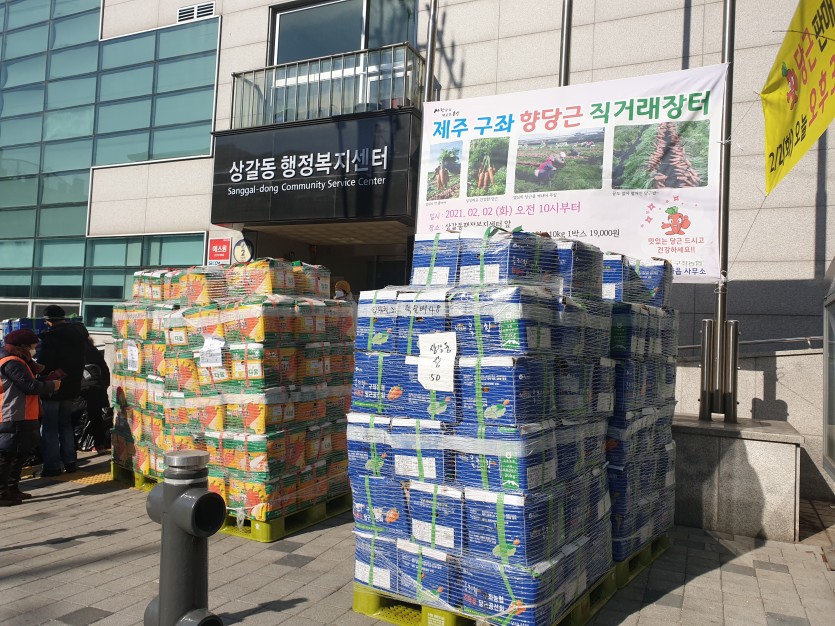 상갈동, 주민자치위원회서 제주 구좌 향당근 직거래장터 운영 김경순 기자 2021-02-02 18:02 가 본문내용 확대/축소 본문 상갈동, 주민자치위원회서 제주 구좌 향당근 직거래장터 운영상갈동, 주민자치위원회서 제주 구좌 향당근 직거래장터 운영 용인시 기흥구 상갈동은 2일 주민자치위원회가 행정복지센터 앞에서 구좌향당근 직거래장터를 열었다고 밝혔다. 이는 지난 2013년 위원회가 제주 구좌읍 주민자치위원화와 맺은 자매 결연의 일환으로 매년 운영하는 것이다. 이날 장터에선 주민들의 성원으로 준비한 향당근 약 500박스가 모두 판매됐다. 수익금은 관내 어려운 이웃을 돕는데 전액 기부할 예정이다. 김성태 위원장은 “앞으로도 구좌읍 주민자치위원회와 상부상조하여 양 지역의 특산물을 홍보하고 어려운 이웃과 더불어 사는 따뜻한 나눔을 실천해나갈 것”이라고 말했다. 한편, 동은 지난해 11월 구좌읍에서 용인시 백옥쌀 직거래 장터를 열어 수익금 전액을 시의 이웃돕기 운동인 ‘사랑의 열차 이어달리기’에 기탁한 바 있다. 좋아요 0 싫어요 0 김경순 기자 기자의 다른기사 보기 목록 댓글목록 이전글 기흥구 신갈동, 홀로 어르신 60가구에 명절 선물 전달 21.02.02 다음글 [용인시수지노인복지관, 2021년 동계 청소년자원봉사학교 진행] 21.02.02
