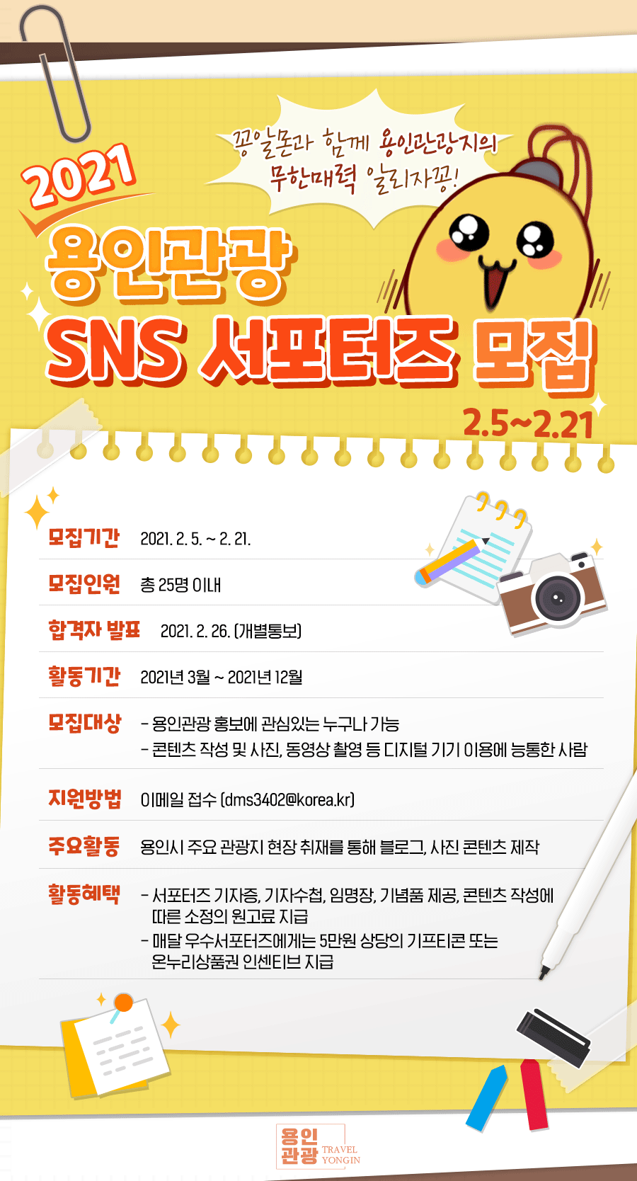 SNS로 용인 관광 홍보할 서포터즈 25명 모집 용인시, 3~12월 관광지 ‧ 축제 등 현장 취재해 블로그 등에 홍보 - 김경순 기자 2021-02-08 21:17 가 본문내용 확대/축소 본문 SNS로 용인 관광 홍보할 서포터즈 25명 모집 용인시는 지난 5일부터 21일까지 SNS‧블로그를 통해 관내 관광지와 축제 등을 홍보할 용인 관광 SNS 서포터즈 25명을 모집한다고 밝혔다. 용인시와 관광홍보 분야에 관심이 있고 정기적인 SNS 활동은 물론 컨텐츠 작성에 능통한 사람이라면 누구나 신청할 수 있다. 서포터즈로 선발되면 3~12월 매월 주제에 맞는 관내 관광지를 방문해 현장 취재한 후 용인관광 공식 블로그 또는 개인 블로그에 관련 기사나 영상 등 컨텐츠를 게시하게 된다. 시는 서포터즈 활동에 따라 소정의 원고료를 지급하며 월별 우수 활동자 2명에겐 5만원 상당의 온누리상품권 등 인센티브를 제공할 방침이다. 아울러 역량강화를 위한 워크숍과 간담회 등도 진행되며 연말엔 우수 활동자에게 표창을 수여할 계획이다. 지원을 하려면 시 홈페이지에서 지원서를 내려받아 이메일(dms3402@korea.kr)로 제출하면 된다. 선정결과는 26일 개별 통보한다. 시 관계자는 “용인시 관광 분야에 애정과 관심을 갖고 우수 관광 정보를 생생하게 전달할 수 있는 분들이 많이 참여해주기 바란다”고 말했다. 좋아요 0 싫어요 0 김경순 기자 기자의 다른기사 보기 목록 댓글목록 이전글 아동 학습도우미 재능 나눔할 대학생 100명 모집 21.02.08 다음글 용인시, 설 명절 앞두고 이웃돕기 손길 이어져 21.02.08