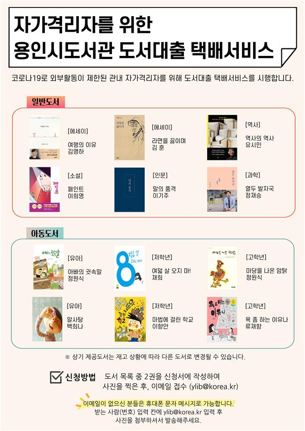 자가격리자 위한 무료 택배 도서대출 실시 - 용인시 도서관, 2일부터 12월31일까지 이메일 및 유선으로 접수 김경순 기자 2021-03-02 23:15 가 본문내용 확대/축소 본문 자가격리자 위한 무료 택배 도서대출 실시 용인시 도서관이 2일부터 코로나19 자가격리자를 위한 무료 택배 도서대출서비스를 진행한다. 오는 12월31일까지 진행되는 무료 택배 도서대출서비스는 코로나19로 외부활동이 제한된 자가격리자의 지친 몸과 마음을 위로하고자 마련했다. 도서 대출은 자가격리자가 이메일 및 유선을 통해 도서를 신청하면 택배로 보내주는 방식으로 진행되고, 반납은 발송일을 포함해 4주 이내에 가까운 공공도서관에서 하면 된다. 책은 역대 ‘올해의 책, 함께 읽기!’ 사업으로 선정된 일반도서 6권, 아동도서 6권 등 총 12권이 준비돼 있으며 대출은 1인당 2권씩 가능하다. 도서관 관계자는 "택배 도서 대출이 장기간의 격리로 몸과 마음이 지친 격리자분들에게 작은 위로가 되길 바란다”며 “앞으로도 시민 한분 한분을 위한 세심한 서비스를 진행하겠다”고 말했다. 한편‘올해의 책, 함께 읽기!’는 시민이 직접 읽고 싶은 도서를 선정하는 사업으로, 독서 문화를 조성하기 위해 지난 2009년부터 매년 진행하고 있다. 좋아요 0 싫어요 0 김경순 기자 기자의 다른기사 보기 목록 댓글목록 이전글 건축 인·허가 처리기간 단축 종합개선책 마련 21.03.02 다음글 처인구, 새봄 맞아 3월 한 달간 불법광고물 일제 정비 21.03.02