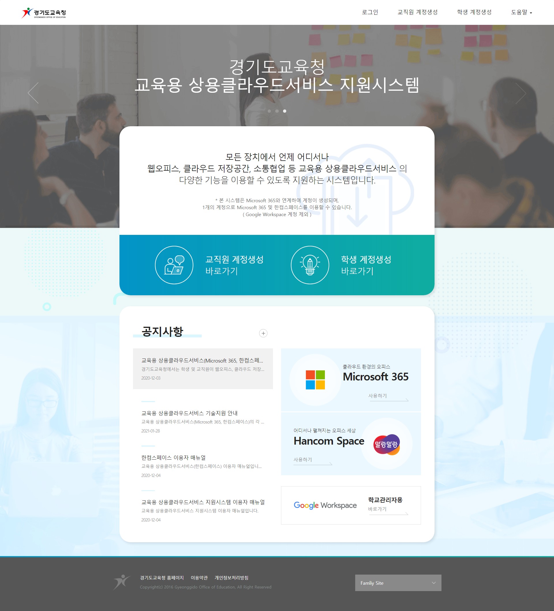 학습자료, 용량 걱정 없이 ‘교육용 상용클라우드서비스’에 담으세요! 경기도교육청, 도내 학생·교직원에 1TB 클라우드서비스 … 언제 어디서나 웹오피스 프로그램 사용 가능 김경순 기자 2021-03-11 16:55 가 본문내용 확대/축소 본문 학습자료, 용량 걱정 없이 ‘교육용 상용클라우드서비스’에 담으세요! 경기도교육청, 도내 학생·교직원에 1TB 클라우드서비스 제공학습자료, 용량 걱정 없이 ‘교육용 상용클라우드서비스’에 담으세요! 경기도교육청, 도내 학생·교직원에 1TB 클라우드서비스 제공 경기도교육청(교육감 이재정)은 도내 학생과 교직원이 언제 어디서나 온라인으로 교수학습자료를 활용할 수 있도록 최대 1TB 저장 가능한 ‘교육용 상용클라우드서비스’를 제공하고 있다고 밝혔다. 교육용 상용클라우드서비스는 ‘Microsoft 365’나 ‘한컴스페이스’등 웹오피스 프로그램과 PC 설치용 한컴오피스도 지원한다. 교육용 상용클라우드서비스는 인터넷으로 연결된 외부 서버에 각종 학습자료 저장공간과 웹오피스 프로그램을 제공하는 것으로 도교육청은 2016년부터 도내 학생과 교직원을 대상으로 서비스를 제공해 왔다. 도교육청은 특히 지난해 코로나19로 등교수업과 원격수업을 병행하는 교육환경 변화에 따라 학생 이용자 수가 2019년 10,092명에서 2020년 97,021명으로 한 해 동안 861%가량 급증했다고 밝혔다. 이용자 급증에 따라 도교육청은 최근 교육용 상용클라우드서비스 메인화면을 수요자 중심으로 개편해 이용자의 편의성과 접근성을 높였다. 해당 서비스를 이용하려면 교육용 상용클라우드서비스 지원시스템 홈페이지(https://cloud.goe.go.kr)에 접속해 계정을 만들면 된다. 계정을 만들 때 필요한 가입 인증키의 경우 학생·교직원은 소속 학교 담당자에게, 도교육청과 교육지원청·직속기관·단설유치원 교직원은 도교육청 교육정보담당관 담당자에게 요청하면 된다. 도교육청 안준상 교육정보담당관은 “코로나19 장기화로 올해도 등교수업과 원격수업을 당분간 병행해야 하는 상황”이라며, “도내 학생과 교직원이라면 언제 어디서나 교수학습에 즉시 활용할 수 있는 교육용 상용클라우드서비스를 적극 활용하길 바란다”고 말했다. 1. <사진> 교육용 상용클라우드서비스 지원시스템 메인화면(별첨) 2. <참고자료> 1부 - 교육용 상용클라우드서비스 이용 안내, 이용자 통계(별첨) 좋아요 0 싫어요 0 김경순 기자 기자의 다른기사 보기 목록 댓글목록 이전글 제13·14대 용인시새마을회장 이·취임식 열려 21.03.11 다음글 자녀문제‘부모또래상담자’와 함께 해결해요! 21.03.11