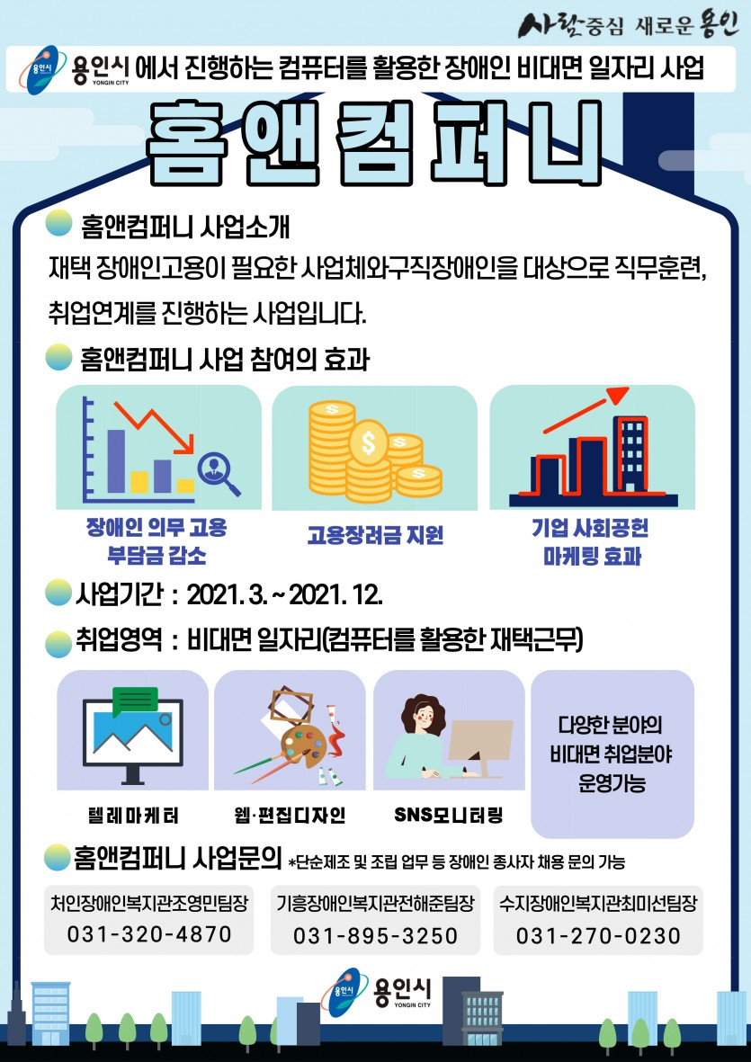 용인시, 장애인위한 비대면 일자리 창출 나서 - 재택근무 가능한 직종 발굴 및 직업 훈련, 기업체 연계 등 체계적 시스템 마련 - 김경순 기자 2021-03-23 08:26 가 본문내용 확대/축소 본문 용인시, 장애인위한 비대면 일자리 창출 나서 용인시가 장애인의 비대면 일자리 창출을 위해 ‘홈앤컴퍼니 사업’을 추진한다. 이번 사업은 코로나19 장기화와 포스트 코로나 시대에 대비해 장애인의 비대면 일자리를 창출하고 이들의 경제적, 정서적 안정을 도모하기 위해 마련했다. 사업은 텔레마케터, 웹·편집디자인, SNS모니터링 등 장애인이 재택에서 근무할 수 있는 일자리를 발굴하고 직업훈련을 진행한 뒤 고용이 필요한 기업체와 연계하는 방식이다. 3개구 장애인복지관에서 대상자를 찾아 직업훈련과 면접교육 등을 실시하고 시와 한국장애인고용공단 경기동부지사, 용인상공회의소가 기업체와 업무협약을 체결하는 등 실질적인 취업이 이뤄질 수 있도록 상호 협조할 계획이다. 특히 시는 고용된 장애인의 장기근속을 위해 꾸준히 모니터링하고 기업체를 위한 지원책을 강구할 방침이다. 앞서 지난해 10월 처인장애인복지관에서 취업 목표 인원을 10명으로 세우고 사업을 시범적으로 시작했다. 현재 총 14명의 장애인이 각각 교육반과 취업반에서 취업을 준비하고 있으며, 교육반에 있는 3명의 교육생들은 이달 말 직업교육이 끝나는대로 채용 면접을 볼 예정이다. 취업반에 있는 11명의 취업준비생들은 모리터링요원, 전산자료입력원, SNS업로드 등의 분야를 모집하고 있는 17개 업체에서 면접을 보고 있으며 이중 2명이 취업에 성공했다. 시는 사업이 안정적으로 자리 잡게 되면 장애인들이 자립할 수 있는 환경을 조성함과 동시에 관련법상 장애인을 의무적으로 고용해야 하는 기업체의 부담감도 줄어들 수 있을 것으로 기대하고 있다. 시 관계자는 “그동안 기업체들이 장애인을 고용하기 위해서는 적합한 근무환경을 조성해야 하는 등의 문제로 취업이 쉽게 연결되지 않았다”며 “비대면 일자리는 이런 문제를 해결하면서 포스트 코로나 시대를 대비할 수 있는 일석이조의 효과를 거둘 것으로 기대된다”고 말했다. 이어 “장애인들에게 양질의 일자리를 제공할 수 있도록 체계적인 시스템을 구축하고 관계기관과 꾸준히 협의해 나가겠다”고 덧붙였다. 직업훈련이나 취업 연계 등에 대한 자세한 문의는 처인장애인복지관(031-320-4870), 기흥장애인복지관(031-895-3250), 수지장애인복지관(031-270-0230)으로 하면 된다. 좋아요 0 싫어요 0 김경순 기자 기자의 다른기사 보기 목록 댓글목록 이전글 “개별주택가격 확인하고 의견제출 하세요” 21.03.23 다음글 양지면, 저소득 취약 계층 40가구에 밑반찬 지원 21.03.23
