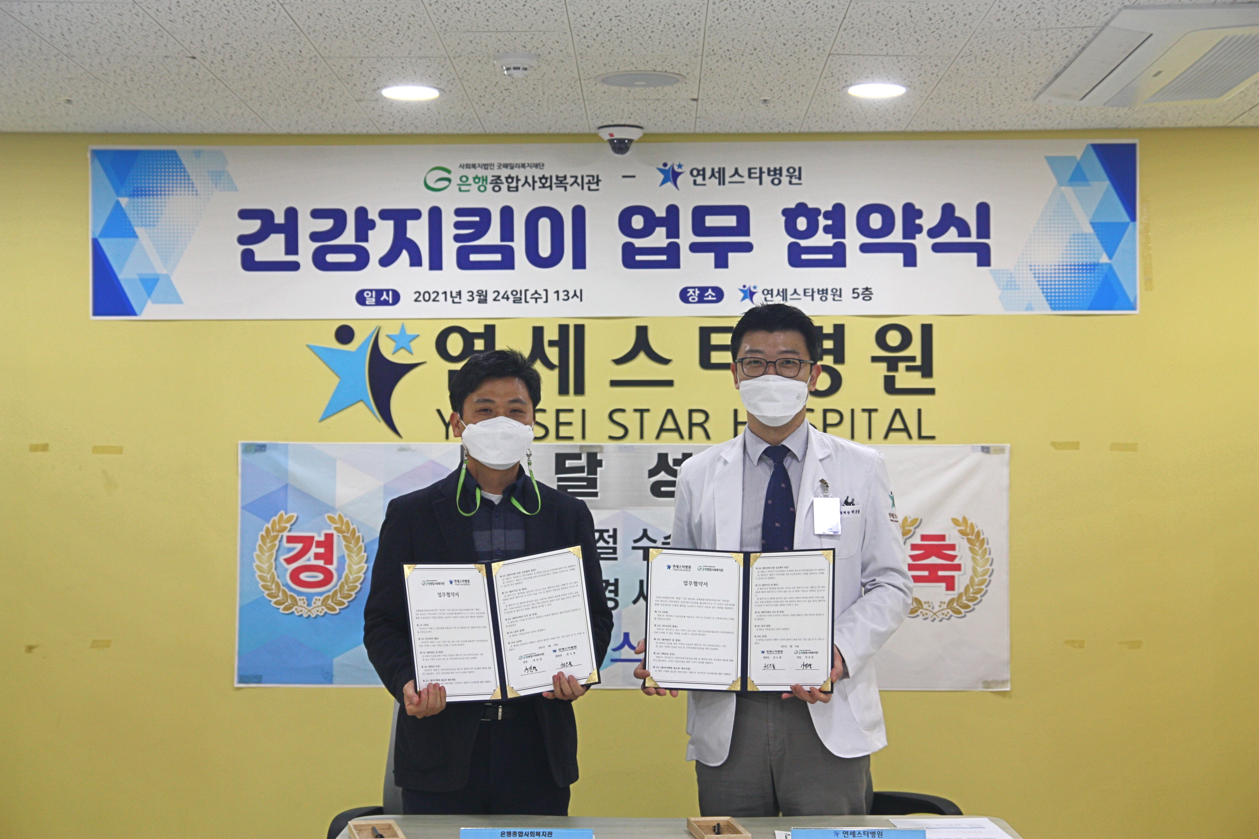 은행종합사회복지관 - 연세스타병원, ‘어르신 건강 지킴이’ MOU 협약 연세스타병원, 어르신 건강 봉사를 위해 복지관과 협약 체결.. 은행종합사회복지관에 의료진 파견해 촉탁의 등 의료서비스 지원.. 김경순 기자 2021-03-26 08:17 가 본문내용 확대/축소 본문 은행종합사회복지관 - 연세스타병원, ‘어르신 건강 지킴이’ MOU 협약 3월 24일 은행종합사회복지관(관장 박진영)은 연세스타병원(병원장 권오룡, 허동범)과 ‘어르신 건강 지킴이’ 협약을 맺었다. 은행종합사회복지관을 이용하는 어르신들을 위한 촉탁의 및 건강강좌 등이 포함된 의료서비스 지원에 관한 이번 협약(MOU)으로 관절·척추 질환을 앓고 있는 어르신들에게 다양한 의료혜택과 건강 정보를 드릴 수 있는 계기를 마련했다. 이날 협약식을 진행한 은행종합사회복지관 박진영 관장은 “지역사회와 주민의 행복한 삶을 위한 전문적이고 진정성 있는 사회복지 실천을 위해 최선을 다하는 저희 복지관과 연세스타병원이 협약식을 맺게 되어 기쁘다. 병원을 다니기 힘드신 어르신들을 위해 복지관 현장 문진을 진행하는 촉탁의 서비스와 건강 상식을 채워드릴 수 있는 건강 강좌에 연세스타병원의 유명한 의사들을 모시게 됐기 때문이다. 복지관을 이용하시는 우리 어르신들을 위해 최고의 진료와 치료를 부탁드린다”며 인사말과 함께 전했다. 연세스타병원의 허동범 병원장은 “협약식을 맺어 주신 은행종합사회복지관 박진영 관장님과 관계자 여러분께 진심으로 감사드린다. 지역사회 공헌을 위해 꾸준히 노력해 오던 중, 사회복지 최일선 창구인 복지관과의 협약을 맺을 수 있게 되어 큰 선물을 받은 듯하다. 관장님께서 당부해주신대로 최고의 진료와 치료로 은행종합사회복지관을 이용하시는 분들의 건강을 잘 돌보겠다”고 전하며, 이 날 협약식의 의미를 되새겼다. 이날 협약식은 신흥역 롯데시네마타워 5층 병원 앞에서 코로나19 방역 기준에 따라 소규모로 진행되었다. 참석자는 은행종합사회복지관 박진영 관장 및 복지관 관계자, 연세스타병원 권오룡, 허동범 병원장 및 병원 관계자로 간소하게 진행되었다. 은행종합사회복지관은 성남시 중원구 은행동에 위치해 있으며 은행다온주간센터, 굿패밀리상담센터, 장난감도서관, 꿈드림센터, 은행건강지원센터(물리치료실), 헬스UP센터 등 넓고 쾌적한 복지시설을 갖춰 아동부터 고령층에게 다양한 복지프로그램을 제공한다. 은행종합사회복지관의 이용은 복지관(031-743-7300)으로 문의하면 된다. 은행종합사회복지관 ‘어르신 건강 지킴이’ 연세스타병원의 이용이나 예약에 관한 내용은 병원(1670-7088)으로 문의하면 된다. 좋아요 0 싫어요 0 김경순 기자 기자의 다른기사 보기 목록 댓글목록 이전글 천주교 수원교구 보라동 성당, 이웃돕기 기탁 21.03.29 다음글 정찬민 의원, 국민 권익 보호 및 편의 증진을 위한 입법 활동 이어가!! 21.03.26