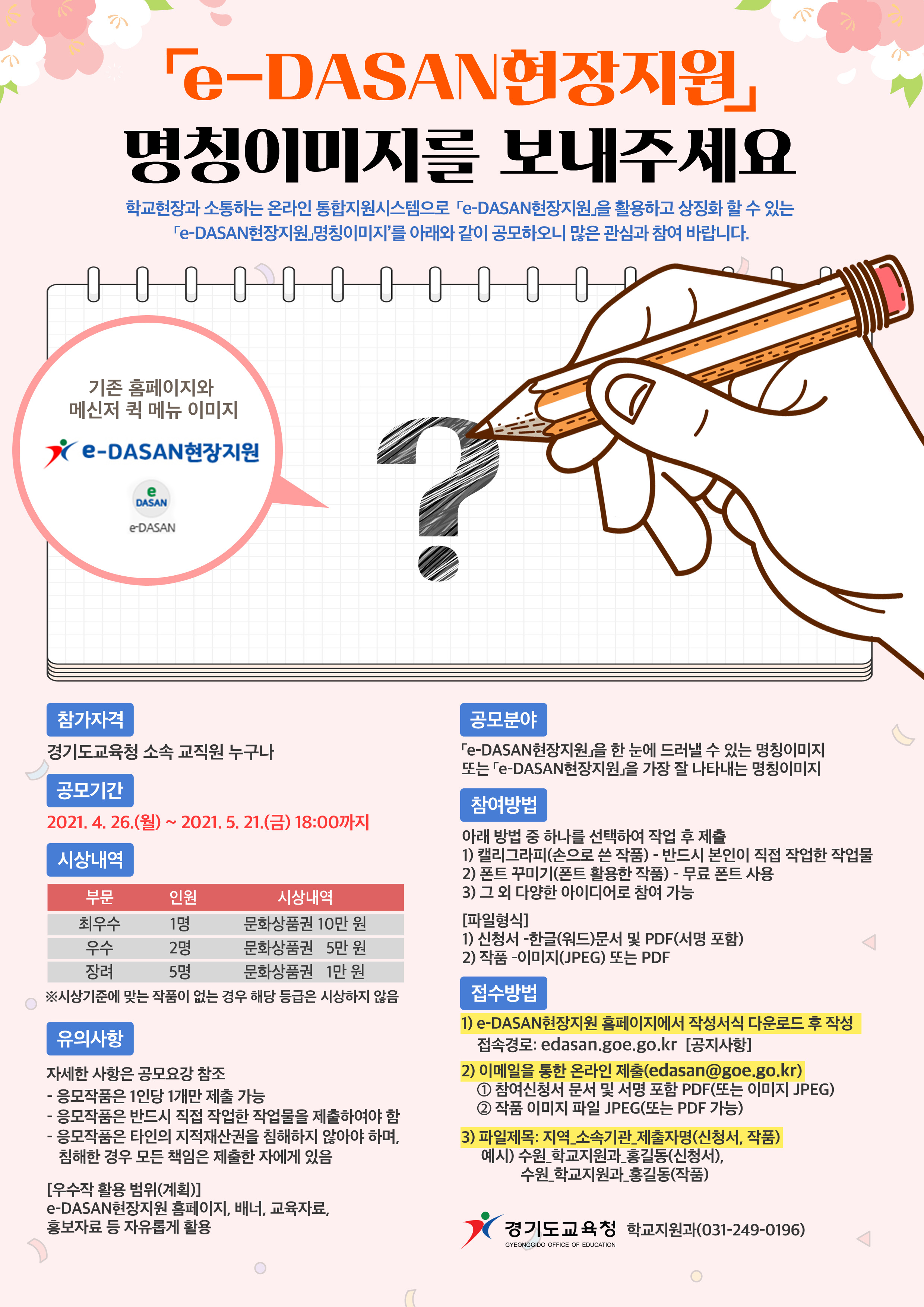 경기도교육청, ‘e-DASAN현장지원’상징(CI) 공모 4.26.~5.21.까지, 도내 교직원 누구나 참여 가능 김경순 기자 2021-04-26 10:27 가 본문내용 확대/축소 본문 경기도교육청, ‘e-DASAN현장지원’상징(CI) 공모 경기도교육청(교육감 이재정)은 26일부터 5월 21일까지 온라인 업무지원시스템 ‘e-DASAN현장지원’의 새로운 상징(CI)을 공모한다. ‘e-DASAN현장지원’은 도내 교직원에게 교무학사, 행정, 일반 업무관련 통합검색, 질문·답변, 신규길라잡이 서비스를 제공하는 온라인 업무지원시스템으로 도교육청이 지난 2017년부터 운영해왔다. 이번 공모는 교직원 참여로 ‘e-DASAN현장지원’을 대표하는 상징을 발굴하고, 교직원의 ‘e-DASAN현장지원’시스템 이용을 활성화하기 위한 목적으로 도내 교직원이라면 누구나 참여 가능하다. 공모에는 ▲멋글씨(캘리그라피), ▲폰트 꾸미기, ▲기타(포스터, 로고 등) 방법으로 참여할 수 있으며, 작품은 전자 형태로 가공·활용할 수 있어야 한다. 또 멋글씨는 참가자가 직접 작업한 것이어야 하고, 폰트 꾸미기의 경우 저작권 분쟁이 없는 무료 글꼴을 사용해야 한다. 공모 참가자는 기한 안에 작품과 신청서를 이메일(edasan@goe.go.kr)로 접수하면 된다. 공모 수상자는 최우수 1명, 우수 2명, 장려 5명 등 총 8명이며, 도교육청은 서면심사와 전 직원이 참여하는 온라인 투표를 통해 오는 6월 최종 수상자를 발표할 예정이다. 도교육청 김용호 학교지원과장은 “학교 현장의 다양한 아이디어가 모여 ‘e-DASAN현장지원’을 대표하는 상징이 선정 되길 기대한다”며 “앞으로도 ‘e-DASAN현장지원’이 학교 현장의 행정업무를 경감하고 학교 자율경영에 기여할 수 있도록 적극 지원해 나갈 것”이라고 말했다. 한편, 공모와 관련한 자세한 사항은 ‘e-DASAN현장지원’ 누리집(http://edasan.goe.go.kr)을 통해 확인할 수 있다. 좋아요 0 싫어요 0 김경순 기자 기자의 다른기사 보기 목록 댓글목록 이전글 연세 의대 용인세브란스병원 ‘우수내시경실 인증’ 획득 21.04.26 다음글 김민기 의원, 의무복무기간 중 사망한 군인 원칙적으로 21.04.26