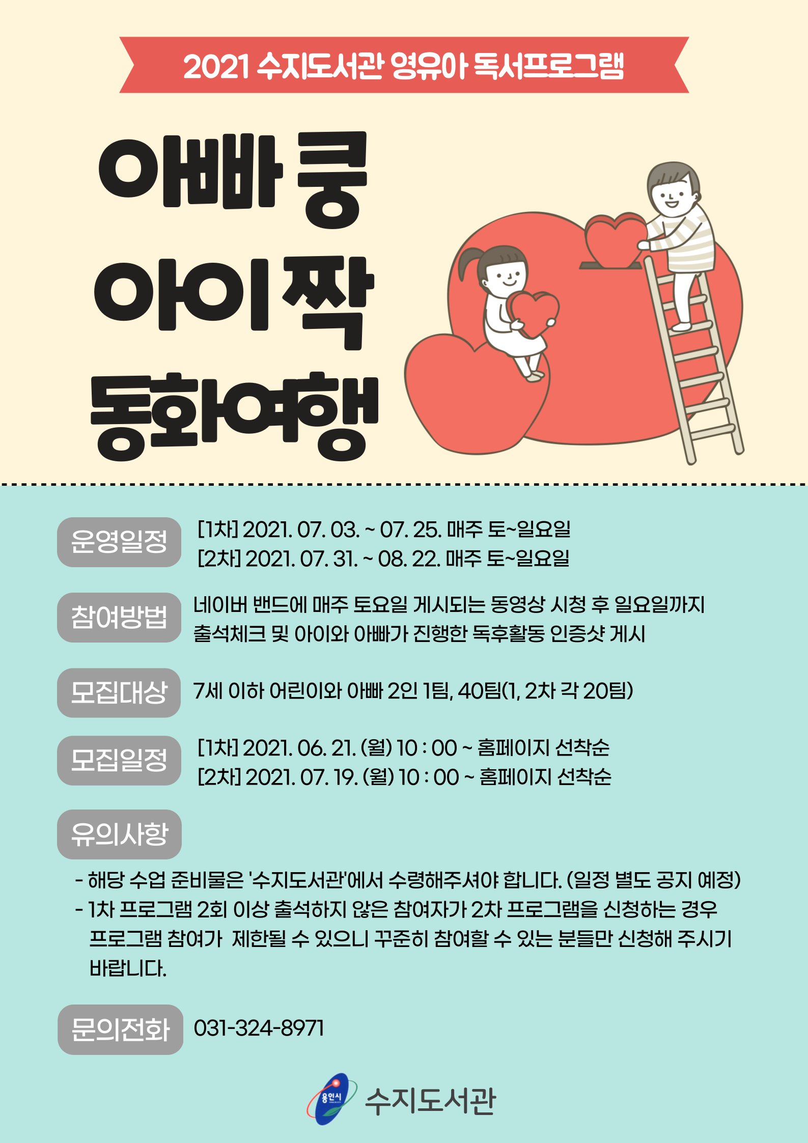 용인시 수지도서관, 아빠와 함께 하는 독서프로그램 운영 - 오는 21일부터 홈페이지서 선착순 20팀 모집 - 김경순 기자 2021-06-21 19:05 가 본문내용 확대/축소 본문 용인시 수지도서관, 아빠와 함께 하는 독서프로그램 운영 용인시 수지도서관이 아빠와 아이가 책을 매개로 유대감을 쌓을 수 있는 독서프로그램 ‘아빠 쿵 아이 짝 동화여행’을 운영한다고 21일 밝혔다. 프로그램은 1차(다음달 3~25일)와 2차(다음달 31일~8월 22일)로 나눠 진행되며 아빠와 함께 책을 읽고 얼굴 그리기, 전래놀이 등 다양한 체험활동을 진행한다. 책은 동화구연지도사가 어린이들의 흥미를 불러일으킬 수 있는 것들로 선정했다. 프로그램은 참여자가 활동하기 편한 시간에 자유롭게 동영상을 보고 활동할 수 있도록 네이버 밴드를 통해 영상을 게시하는 비대면 방식으로 운영한다. 7세 이하 유아와 아빠 2인 1팀으로 각 20팀(총 40명)씩 참여할 수 있으며 1차 참가자는 오는 21일부터, 2차 참가자는 다음달 19일부터 수지도서관 홈페이지(https://lib.yongin.go.kr/suji)에서 선착순으로 모집한다. 수지도서관 관계자는 “아빠와 함께하는 책 놀이를 통해 유아기 독서 습관을 형성하는 좋은 기회가 될 것”이라면서 “많은 시민의 관심과 참여를 바란다”고 말했다. 좋아요 0 싫어요 0 김경순 기자 기자의 다른기사 보기 목록 댓글목록 이전글 “절차탁마의 자세로 투명하고 공정한 공직사회 만들겠다” 21.06.21 다음글 용인시디지털산업진흥원 소공인특화지원센터, 21.06.21