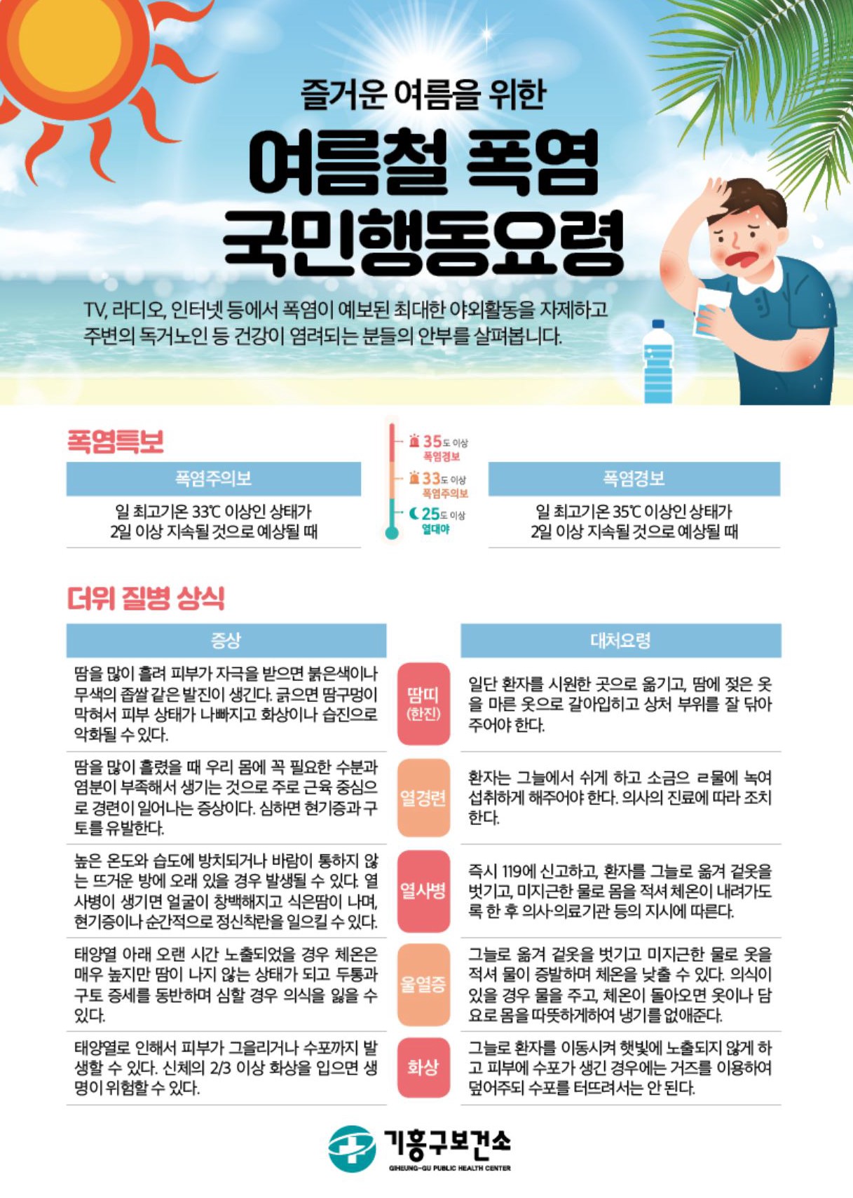용인시 보건소, 폭염대비 취약계층 건강관리 만전 1만2475가구 대상으로 찾아가는 서비스 제공 - 김경순 기자 2021-07-14 23:49 가 본문내용 확대/축소 본문 용인시 보건소, 폭염대비 취약계층 건강관리 만전용인시 보건소, 폭염대비 취약계층 건강관리 만전 용인시 보건소는 본격적인 여름철을 맞아 취약계층을 직접 방문하는 건강관리 서비스를 제공하고 있다고 14일 밝혔다. 시 보건소는 이달 초부터 폭염대응 재난도우미를 운영, 온열질환에 취약한 취약계층의 만 65세 이상 어르신 및 만성질환자 등 총 1만2475가구를 대상으로 가정방문 또는 전화로 건강 상태를 확인하고 폭염대응요령을 설명하고 있다. 또 손선풍기, 얼음찜질주머니 등을 배부해 일상 속 시원한 여름나기를 돕고 여름철 해충피해를 방지하기 위해 진드기 기피제 등 방역물품을 제공하고 있다. 더불어 시 보건소의 방문건강관리사업에 등록된 대상자에게 폭염 특보 문자를 보내는 등 코로나19 시대 건강한 여름을 보낼 수 있도록 다각적인 접근을 시도하고 있다. 시 보건소 관계자는 “여름이 끝나는 오는 9월까지 취약계층의 폭염피해를 방지하기 위해 예방활동에 만전을 기하겠다”며 “시민 여러분도 여름철 건강관리에 각별하게 신경 써 주시길 바란다”고 말했다. 한편 여름철에는 충분한 양의 물을 섭취해야 하며 가장 더운 시간대인 정오부터 오후 5시까지는 야외활동을 자제해야 한다. 또한 어지러움, 탈진, 두통, 구토, 근육경련 등 이상증세가 나타날 경우에는 즉시 119에 도움을 요청하거나, 가까운 의료기관에 내원해 처치를 받아야 한다. 이밖에 궁금한 내용은 용인시 보건소 건강증진팀(처인구 031-324-4956·기흥구 031-324-6921·수지구 031-324-8920)으로 문의하면 된다. 좋아요 0 싫어요 0 김경순 기자 기자의 다른기사 보기 목록 댓글목록 이전글 택시 269대에 비말 차단막 시범 설치 21.07.14 다음글 미래발전 방향 전문가 참여 정책 토론회 개최 21.07.14