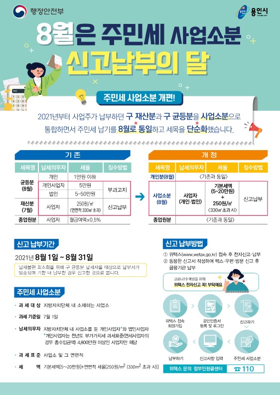 용인시는 26일 사업주가 내는 주민세 ‘재산분’과 ‘균등분’을 ‘사업소분’으로 통합해 8월에 한 번만 내도록 변경한다고 밝혔다.
