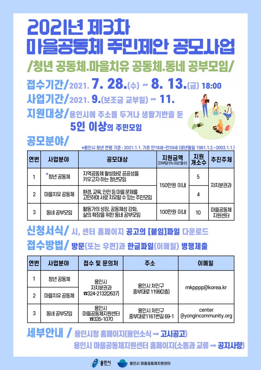 용인시, ‘제3차 마을공동체 주민제안 공모사업’ 접수 28일부터 다음달 13일까지 3개 분야 19팀 모집 김경순 기자 2021-07-28 23:38 가 본문내용 확대/축소 본문 용인시, ‘제3차 마을공동체 주민제안 공모사업’ 접수 용인시가 28일부터 다음달 13일까지 ‘2021년 제3차 마을공동체 주민제안 공모사업’의 접수를 진행한다. 공모는 ▲청년 활동 지원을 위한 청년 공동체 5개팀 ▲마을 문제 해결을 위한 마을치유 공동체 4개팀 ▲마을에 대해 함께 공부하는 동네 공부모임 10개팀 등 총 3가지 분야에 19팀을 모집하고, 용인에 주소를 두거나 직장이나 학교 등 생활기반을 둔 5인 이상의 모임이면 각 분야에 맞는 사업을 자유롭게 제안하면 된다. 선정된 청년 공동체와 마을치유 공동체는 150만 원 이내에서, 동네 공부모임은 100만 원 이내에서 각각 지원한다. 시청은 용인시나 용인시 마을공동체지원센터 홈페이지에서 양식을 내려받아 방문 또는 이메일로 접수하면 된다. 시 관계자는 “코로나19로 각종 분야에서 활동이 제한적인 것이 현실이지만, 그 속에서도 다양한 사업들이 내실 있게 운영되고 있다”며 “이번 3차 공모에도 많은 참여를 바란다”고 말했다. 한편 시는 지난 2015년부터 마을공동체를 통해 주민의 자발적 참여를 이끌고 마을 공통의 문제를 해결하기 위해 마을공동체 주민제안 공모사업을 진행하고 있으며, 올해는 앞서 지난 3~4월 1·2차 공모를 통해 선정된 마을공동체 74팀이 다양한 활동을 하고 있다. 공모에 대한 자세한 문의는 시 자치분권과(031-324-2132·2637) 또는 마을공동체지원센터(031-335-1070)로 하면 된다. 좋아요 0 싫어요 0 김경순 기자 기자의 다른기사 보기 목록 댓글목록 이전글 “탄소중립 실현 신재생에너지 활성화 적극 지원할 것” 21.07.28 다음글 용인시, 폭염 피해 예방 총력 대응 나서 21.07.28