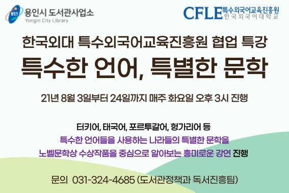 용인시 도서관, 인문학 강연‘특수한 언어, 특별한 문학’진행 한국외대 협업으로 마련…홈페이지서 선착순 접수 중 - 김경순 기자 2021-07-31 08:50 가 본문내용 확대/축소 본문 용인시 도서관, 인문학 강연‘특수한 언어, 특별한 문학’진행 용인시 도서관이 다음달 3일부터 28일까지 온라인 인문학 강연 ‘특수한 언어, 특별한 문학’을 운영한다. 한국외국어대학교 특수외국어교육진흥원과 협업해 마련한 이번 강연에서는 평소 쉽게 접할 수 없었던 터키어, 태국어, 포르투갈어, 헝가리어 등 특수외국어지역의 언어로 구현된 노벨문학상 수상 작품을 만날 수 있는 자리다. ▲이난아 한국외대 중앙아시아연구소 연구교수의 ‘터키어의 승리, 노벨문학상 수상자 오르한 파묵의 작가정신과 작품세계’ ▲신근혜 한국외대 태국어과 교수의 ‘태국어, 태국문학 그리고 태국의 사회문화’ ▲임소라 한국외대 포르투갈어과 부교수의 ‘포르투갈어권 노벨문학상 수상자 주제 사라마구의 문학 세계와 언어’ ▲유진일 한국외대 헝가리어과 교수의 ‘헝가리 노벨상 수상자 케르티스 임레의 작품세계’ 등 4개 강연이 매주 화요일 순차적으로 화상회의 앱인 줌(ZOOM)을 통해 진행된다. 접수는 현재 시 도서관 홈페이지에서 진행 중이며, 각 강연당 선착순 50명을 모집한다. 시 도서관 관계자는 “관내 대학인 한국외대 특수외국어교육진흥원과 협업해 평소에 쉽게 만나볼 수 없었던 특별한 온라인 강연을 기획했다”며 “다양한 외국어에 대해 시민들이 깊이 있게 알아볼 수 있는 좋은 기회가 되길 바란다”고 말했다. 좋아요 0 싫어요 0 김경순 기자 기자의 다른기사 보기 목록 댓글목록 이전글 “도시농부학교와 어린이 농부학교에 참가하세요” 21.07.31 다음글 소소한 불편 해결 홀로어르신 대상‘간단 집수리’인기 21.07.31