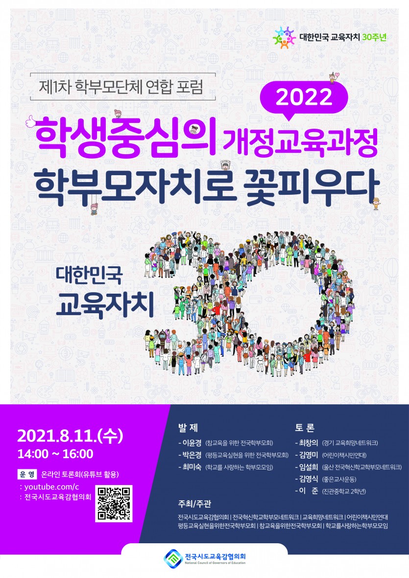 제1차 학부모단체 연합포럼 실시,‘학생중심 2022 개정교육과정, 학부모자치로 꽃 피우다’ 김경순 기자 2021-08-11 22:48 가 본문내용 확대/축소 본문 제1차 학부모단체 연합포럼 실시,‘학생중심 2022 개정교육과정, 학부모자치로 꽃 피우다’ 전국시도교육감협의회(회장 최교진, 이하 협의회)는 11일(수) 오후 ‘학생중심의 2022 개정교육과정, 학부모자치로 꽃 피우다’라는 슬로건으로 제1차 학부모단체 연합포럼을 온라인으로 실시했다. ▢ 이번 포럼은 협의회가 대한민국 교육자치 30주년 일환으로 「교육공동체 토론회」 중 학부모 분야로서 전국시도교육감협의회가 주최하고 6개 학부모단체(참교육을 위한 전국학부모회, 평등교육 실현을 위한 전국학부모회, 학교를 사랑하는 학부모모임, 경기 교육희망네트워크, 어린이책시민연대, 전국혁신학교학부모네트워크)가 공동으로 주관하며, 10월중 2차 포럼을 실시한다. ▢ 이날 포럼에서 3명의 학부모가 발제를 했다. 참교육을 위한 전국학부모회의 이윤경 대표는 ‘모든 학생은 특별하다’, 평등교육 실현을 위한 전국학부모회의 박은경 대표는 ‘고교학점제는 폐지가 답이다!’, 학교를 사랑하는 학부모모임의 최미숙 대표는 ‘고교학점제 문제점 및 지원’에 대해 발제를 했다. ▪ 참교육을 위한 전국학부모회의 이윤경 대표는 2022 개정 교육과정에 대해국가교육회의에서 실시한 ‘2022 개정 교육과정 대국민 설문조사’를 바탕으로“교육의 목표가 인재상이 아닌 인간상이어야 하고, 학생 스스로 계획하고 학습하는 학생 주도성 확대, 인문학적 소양과 인성교육 강화, 학생의 진로와 적성에 맞춘 책임교육으로서 고교학점제, 학교 및 지역 교육과정위원회로 교육과정 자율권 보장, 학습격차 해소를 위한 종합적인 지원 필요” 등에 대해 공감하고, “현장 기반 교육과정 수립의 주체로서 상호 신뢰와 책임 위에 완성되는 교육 개혁이기를 기대한다”고 했다. ▪ 평등교육 실현을 위한 전국학부모회의 박은경 대표는 ‘지방 고등학교의 교사 부족, 진로결정-과목선택에 따른 보편교육 부족, 절대평가를 표방하며 석차까지 명시하는 평가체제, 교육학을 미이수한 비정규직 교사, 이동수업에 따른 교우 문제와 쉬는 시간 부재’ 등의 문제를 들며 “고교학점제는 폐지가 답”이라고 했다. 또한, “고립과 소외, 차별과 혐오를 넘어 연대와 소통의 교육과정이 필요하다”고 말했다. ▪ 학교를 사랑하는 학부모모임의 최미숙 상임대표는 고교학점제에 대해 “현행 대학입시제도와의 연계 및 다양한 선택과목을 담당할 교원 수급의 어려움, 학교-지역간 격차 심화”가 우려되며, “진로-학업 전문가 및 멘토로서 교사 역할변화, 학생의 학업이수 보장, 공적인 지원책 도입, 평가시스템의 공정성 확보, 학령기 전반에 걸친 자기주도성 개발 기회 제공, 학습격차 해소를 위한 제도적 보완이 필요하다”고 했다. ▢ 이어 최창의 대표(경기 교육희망네트워크), 김영미 대표(어린이책 시민연대), 임설희 대표(전국혁신학교학부모네트워크 울산), 김영식 고문(좋은교사운동), 이준 학생(진관중)이 토론을 펼쳤다. ▪ 최창의 경기 교육희망네트워크 대표는 “학부모의 교육에 대한 올바른 인식과 조력없이 올바른 교육을 펼치기는 어려우며, 교육주체의 일원으로서 교육과정 편성과 운영에 적극 참여해야한다”고 하며, 고교학점제 시행에 대한 우려와 문제점을 개선하기 위해 “집중적인 예산 지원과 교육여건 조성, 학교공동체의 협력”이 뒤따라야하며, “고교학점제의 목적 달성과 성공적인 안착을 위해 수능중심 대학입시를 대폭 완화하는 제도적인 대책이 뒷받침되어야 한다”고 했다. ▪ 김영미 어린이책 시민연대 공동대표는 ‘교육의 패러다임을 바꾸는 고교학점제 시행을 위한 제언과 제도’로서 “학교 교육과정위원회에 학부모, 학생, 교사, 지역 시민이 참여하여 교육과정 자율권이 보장되고, 학교별로 고교학점제 담당 전담교사 배치, 교육지원청별 커리큘럼팀 상설화로 시민사회와 대학 등을 연계한 네트워크 활성화와 강사 수급 시스템 등 학생이 선택한 주제에 맞는 커리큘럼을 제공할수 있는 시스템이 구축되어, 학생의 자기주도성을 살릴 수 있도록 해야한다”고 했다. ▪ 임설희 전국혁신학교 학부모네트워크 울산대표는 “학생중심 교육과정이라하면 학생의 ‘배움’ 입장에서 쉽게 배울 수는 없는지 돌아볼 필요가 있고, ‘앎과 삶과 함’이 이어질 수 있도록 공교육만으로도 충분할 수 있어야 한다”고 했다. 또한 “민관학 거버넌스를 넘어 지역 산업과 연계한 교육과정 개발 등 적극적으로 잡무를 줄일 방법을 찾는 것이 더 중요하고, 진로탐색에서 진로를 직업으로 치환하고 너무 강조하여, 균형된 인간발달을 고려해야하는 교육에 적절하지 않을 수 있다”며 “자기 자녀만을 위한 이기적 학부모라는 꼬리표를 떼어내고, 함께 살아갈 세상에서 적정수준의 배움과 보람된 배움을 돕기위해 학부모 단체가 활약하자”고 했다. ▪ 김영식 좋은교사운동 공동대표는 “교육에서 소외되기 쉬운 학생들뿐만아니라 모든 학생들에게 자신의 잠재력을 최대한 끌어낼 