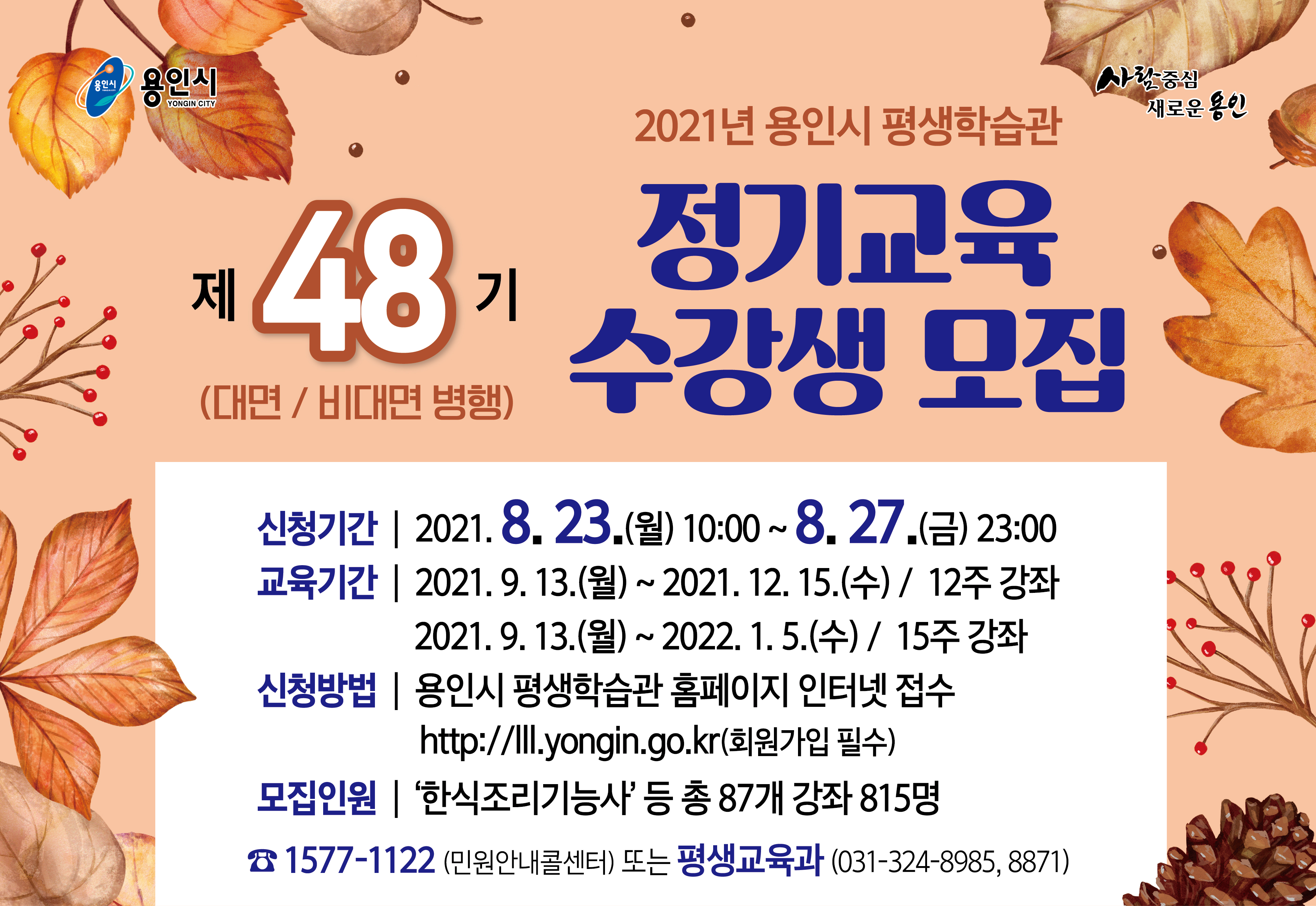 용인시 평생학습관 제48기 정기교육 수강생 모집 한식조리기능사 등 총 87개 강좌 운영…815명 신청 가능 - 김경순 기자 2021-08-17 15:56 가 본문내용 확대/축소 본문 용인시 평생학습관 제48기 정기교육 수강생 모집 용인시 평생학습관이 오는 23일부터 27일까지 ‘제48기 정기교육’ 수강생을 모집한다. 총 815명이 참여할 수 있는 정기교육은 다음 달 13일부터 내년 1월 5일까지 운영하며 사회적 거리두기 지침에 따라 대면과 비대면(온라인) 방식으로 운영한다. 강좌는 ▲한식조리기능사 등 조리분야 21개 ▲가정커트와 펌 등 헤어뷰티 분야 6개 ▲양장기능사 등 기술실용분야 11개 ▲ 컴퓨터활용2급 자격증 등 정보화분야 8개 ▲영어회화 등 인문교양분야 14개 ▲독서논술지도사 등 직업능력분야 10개 ▲수채화&데생 등 문화예술분야 17개 등 총 87개를 운영한다. 신청은 만 19세 이상 용인시민은 누구나 용인시 평생학습관 홈페이지(http://lll.yongin.go.kr)에서 하면 된다. 시에 소재한 회사에 다니고 있는 직장인 또는 시에 등록된 재외국민, 결혼이민자도 신청이 가능하다. 시 관계자는 “시민들이 안전하게 배움의 기회를 누리도록 거리두기 지침에 따라 대면과 비대면 과정을 병행해 운영할 계획”이라면서 “시민들의 많은 관심과 참여를 바란다”고 말했다. 좋아요 0 싫어요 0 김경순 기자 기자의 다른기사 보기 목록 댓글목록 이전글 용인시, 기흥구 공세동 주민참여형 어린이놀이터 조성 완료 21.08.17 다음글 청년에 가장 필요한 정책 분야‘일자리·주거’꼽아 21.08.17