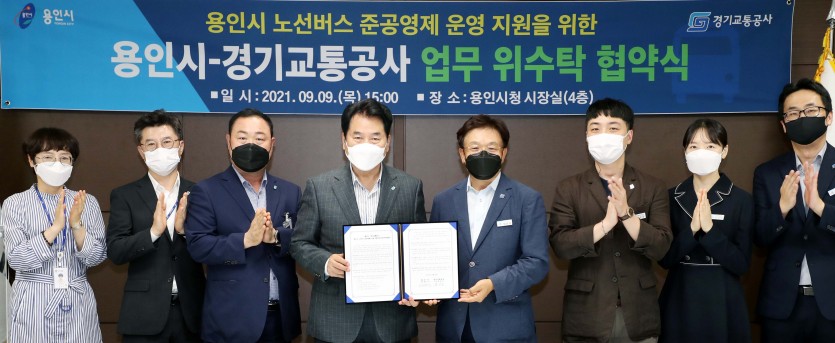 버스 준공영제 안착 위해 경기교통공사와 맞손 - 용인시, 오는 12월부터 시행되는 준공영제 앞서 업무 위·수탁 협약 - 김경순 기자 2021-09-09 22:12 가 본문내용 확대/축소 본문 버스 준공영제 안착 위해 경기교통공사와 맞손 용인시는 9일 경기교통공사와 버스 준공영제 운영 지원을 위한 업무 위·수탁 협약을 체결했다. 전문성과 기술력을 갖춘 교통 전문기관과 힘을 합해 오는 12월부터 시행되는 버스 준공영제가 성공적으로 안착할 수 있도록 하기 위해서다. 이날 협약식에는 백군기 용인시장, 정상균 경기교통공사 사장 등이 참석했다. 협약에 따라 시는 노선 신설·변경 등 큰 틀에서 관리․감독을 담당하고, 경기교통공사는 운송수입금 관리와 노선별 정산 등 운영 지원을 맡게 된다. 시는 경기도 공공버스·M버스 정산 업무를 수행 중인 공사의 업무 경험과 전문 인력을 활용해 순조롭게 준비할 수 있을 것으로 기대하고 있다. 기존 버스 운영 방식인 민영제는 업체의 운송수지와 경영상황에 따라 노선과 배차간격이 결정되어 교통이 취약한 지역에 거주하는 시민들의 불편이 있었다. 이를 보완하기 위해 시는 ‘용인형 버스 준공영제’ 도입을 추진해왔다. 시가 채택한 준공영제는 노선관리형으로 버스 운영의 공공성과 재정지원의 투명성을 확보하기 위해 시가 노선을 소유ㆍ관리하는 방식이다. 특히 일반 시내버스는 물론 마을버스까지 노선관리형 준공영제로 전환하는 것은 전국 기초자치단체 중 처음이다. 시는 운송사업자 모집 절차를 준비하고 있으며 오는 12월부터 마을버스 48개 노선, 일반형 시내버스 50개 노선 등 총 98개 노선이 준공영제로 운영된다. 백군기 용인시장은 “이번 협약은 버스 준공영제가 투명하고 합리적으로 운영될 수 있는 기반을 마련한 것”이라며 “시민 모두가 만족할 수 있는 대중교통 서비스 제공을 위해 지원을 아끼지 않겠다”고 말했다. 좋아요 0 싫어요 0 김경순 기자 기자의 다른기사 보기 목록 댓글목록 이전글 백군기 용인시장, 홀로 어르신 위한 담벼락 보수 현장 방문 21.09.09 다음글 용인시, 13개 환경단체와 환경교육도시 추진 공동선언 21.09.09