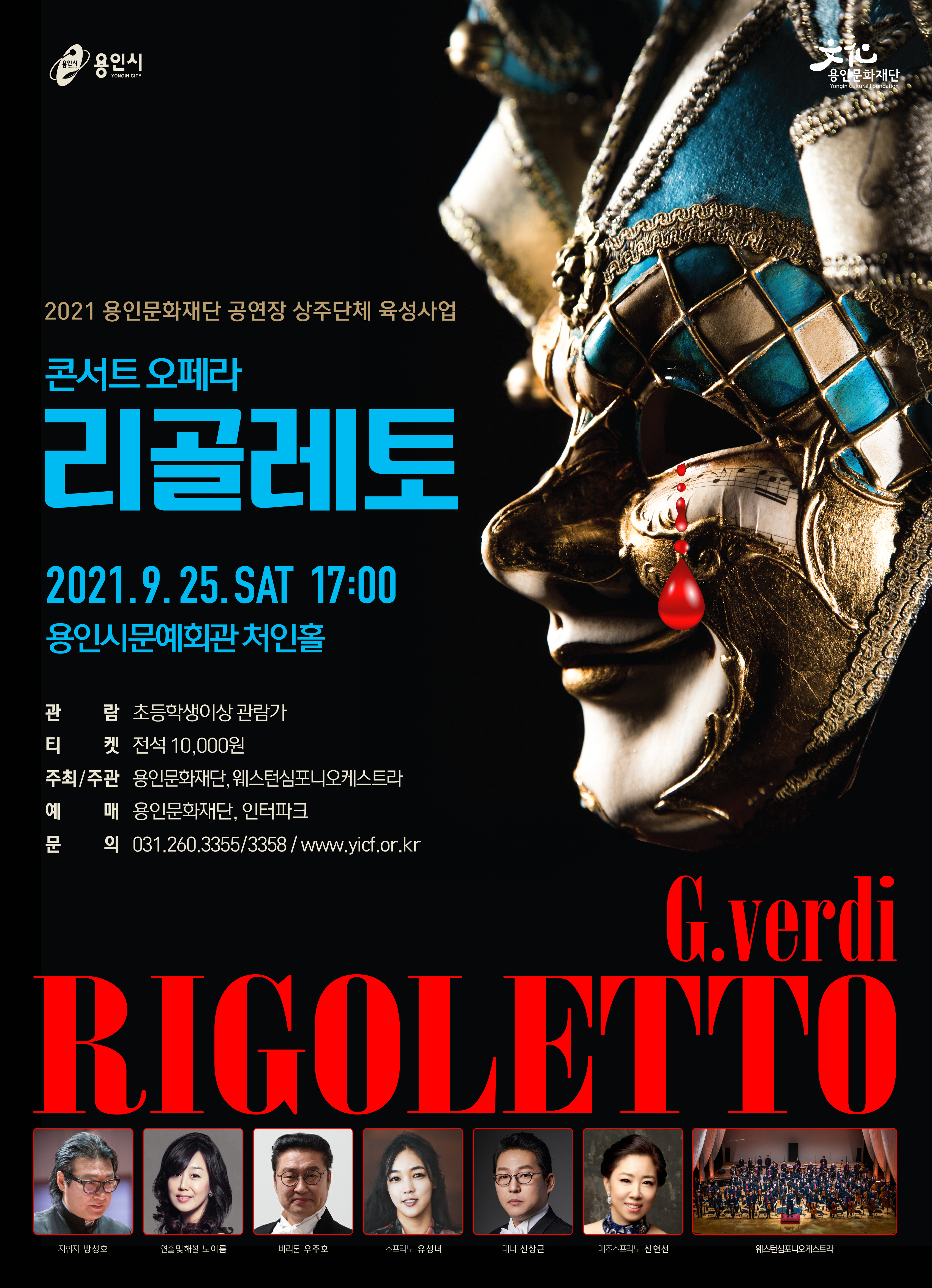 코로나19 장기화로 공연에 목마른 용인시민들에게 문화적 갈증 해소 기회를 제공할 이번 콘서트 오페라 <리골레토>는 전석 1만원으로 초등학생 이상부터 관람이 가능하며, 예매는 용인문화재단 홈페이지(www.yicf.or.kr)와 인터파크 티켓, 전화(031-260-3355)를 통해 가능하다.