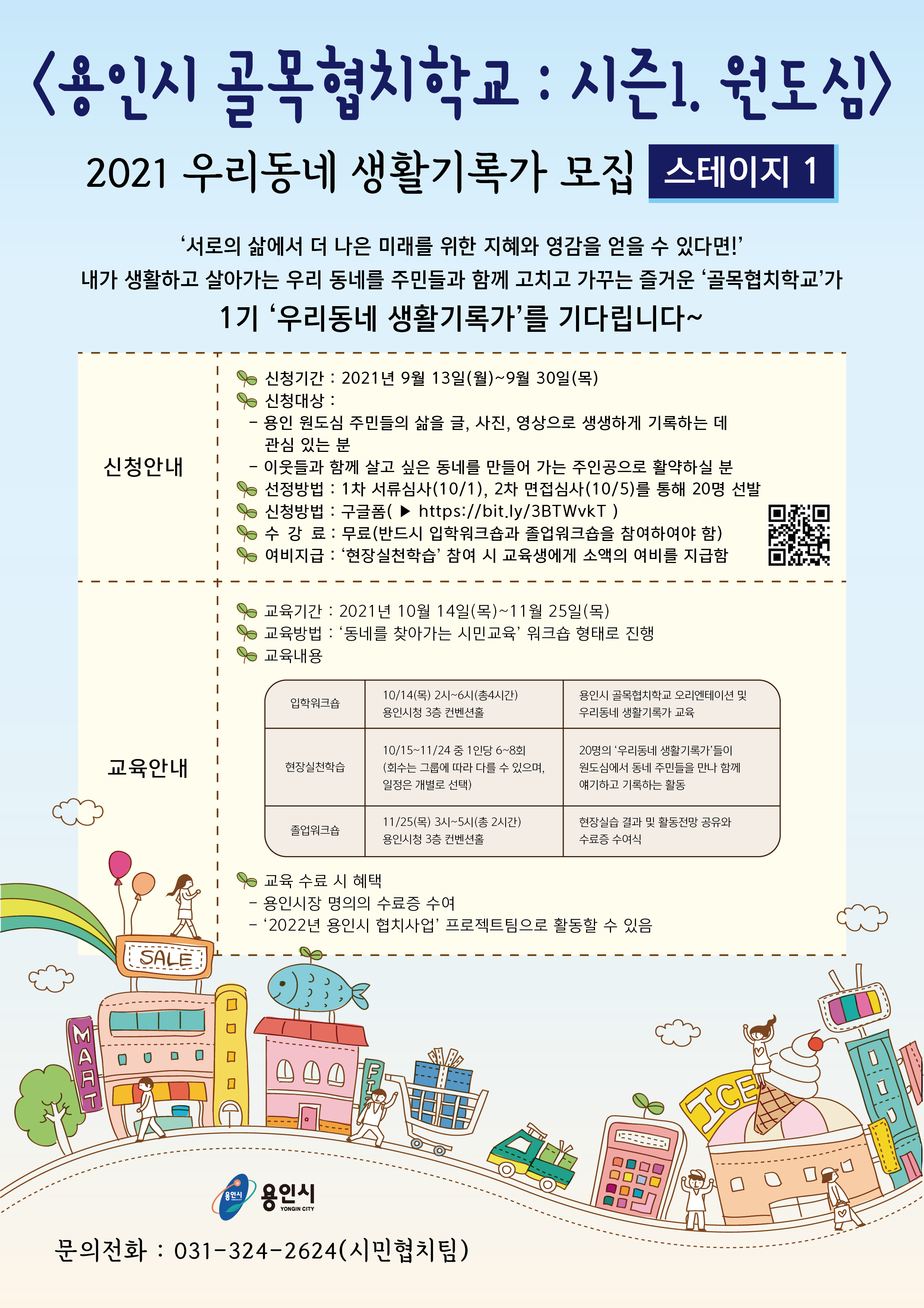 용인시, 오는 30일까지‘골목협치학교’ 참가자 모집 우리동네 생활기록가 양성 위해 다음달 14일부터 11월25일까지 운영 - 김경순 기자 2021-09-24 00:00 가 본문내용 확대/축소 본문 용인시, 오는 30일까지‘골목협치학교’ 참가자 모집 용인시가 오는 30일까지 ‘용인시 골목협치학교’에 참여할 시민들을 모집한다. 다음달 14일부터 11월25일까지 진행되는‘용인시 골목협치학교’는 지역의 문제에 관심을 갖고 활동할 ‘우리동네 생활기록가’양성을 위해 마련한 교육프로그램이다. 신청은 포스터 속 QR코드로 접속하거나 구글폼 URL(https://bit.ly/3BTWvkT)에 접속해 작성 후 제출하면 되고, 주민들의 삶을 글과 사진 영상으로 기록하는데 관심이 있는 시민이라면 누구나 참여할 수 있다. 단, 시는 소명 의식을 가지고 활동할 우리동네 생활기록가를 선발하기 위해 서류와 면접을 통해 20명을 선정할 방침이다. 교육은 ▲입학워크숍 ▲현장실천학습 ▲졸업위크숍 등 총 3단계로 구성됐으며 교육의 첫 단계인 입학워크숍에서는 교육의 목적과 생활을 기록하는 것에 대한 의미 등을 배우는 시간을 갖는다. 이어 현장실천학습에서는 직접 주민들을 만나 인터뷰를 진행하고 기록한 뒤 마지막 졸업워크숍에서 그동안의 활동을 돌아볼 계획이다. 시는 모든 과정을 수료한 교육생에게 수료증을 수여하고 ‘2022년 용인시 협치사업’의 프로젝트팀에서 시민들의 삶을 기록하는 우리동네 생활기록가로 활동할 수 있는 기회를 제공할 예정이다. 시 관계자는 “시민들이 참여하는 협치 모델을 만들기 위해 이번 우리동네 생활기록가 양성 교육을 진행하게 됐다”며 “이번 프로그램을 통해 시민 스스로가 지역의 문제에 관심을 갖고 해결 방법을 모색하는 시간이 되길 기대한다”고 말했다. 자세한 내용은 용인시 홈페이지 시정소식란에서 확인하면 된다. 좋아요 0 싫어요 0 김경순 기자 기자의 다른기사 보기 목록 댓글목록 이전글 은행나무 가로수 애물단지 21.09.24 다음글 용인시, 어린이보호구역 6곳 안전사고 예방시설 정비 21.09.23