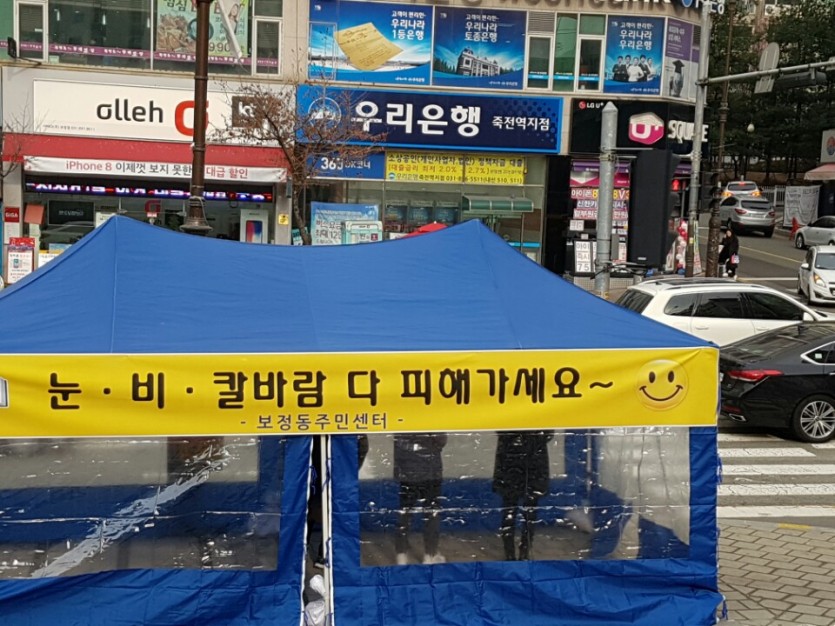 용인시 기흥구 보정동은 보행자 유동인구가 많은 주민센터앞과 카페거리 사거리 앞 등 횡단보도 2곳에 겨울철 차가운 바람을 피할 수 있는 바람막이 텐트를 설치했다고 밝혔다.