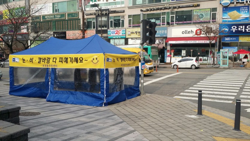 신호를 대기하는 시민들이 바람이나 눈, 비를 피할 수 있도록 동 주민센터의 공공비품인 텐트를 사용해 쉼터를 마련한 것이다.