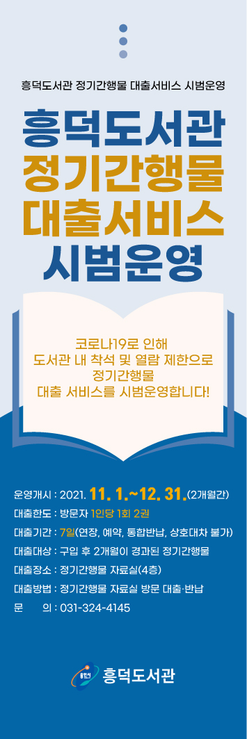 용인시 흥덕도서관, 정기간행물 대출 서비스 시작 - 다음달 1일부터 12월 31일까지 시범 운영 - 김경순 기자 2021-10-28 12:02 가 본문내용 확대/축소 본문 용인시 흥덕도서관, 정기간행물 대출 서비스 시작 용인시 흥덕도서관이 다음달부터 정기간행물 대출 시범 서비스를 시작한다. 그동안 정기간행물은 소장 기간이 1년으로 정해진데다 일정 기간 경과 시 이용률이 감소함에 따라 대출 도서에서 제외됐지만, 주민들에게 다양한 도서를 접할 기회를 제공하고자 정기간행물 대출 서비스를 시작하게 됐다. 대출 대상 도서는 지난 1월부터 구입한 86종 1335권의 월간지와 주간지로 1인당 2권씩 7일 동안 대출할 수 있다. 시범 서비스 기간은 다음달 1일부터 오는 12월 31일까지 2개월간이다. 흥덕도서관 관계자는 “코로나19로 가정 내 머무르는 시간이 많아진 주민들에게 보다 많은 혜택을 드리고 싶어 새로운 서비스를 도입하게 됐다”며 “독서 활동을 즐기는 데 불편함이 없도록 최선을 다하겠다”고 말했다. 한편 용인시 도서관사업소는 흥덕도서관의 시범 운영 결과에 따라 관내 도서관으로 확대할 계획이다. 좋아요 0 싫어요 0 김경순 기자 기자의 다른기사 보기 목록 댓글목록 이전글 정찬민 의원, 21년도 교육부 특별교부금 총 31억여 원 확보!! 21.10.28 다음글 용인시, 관외 거주 고액 체납자 추적해 4000만원 징수 성과 21.10.28