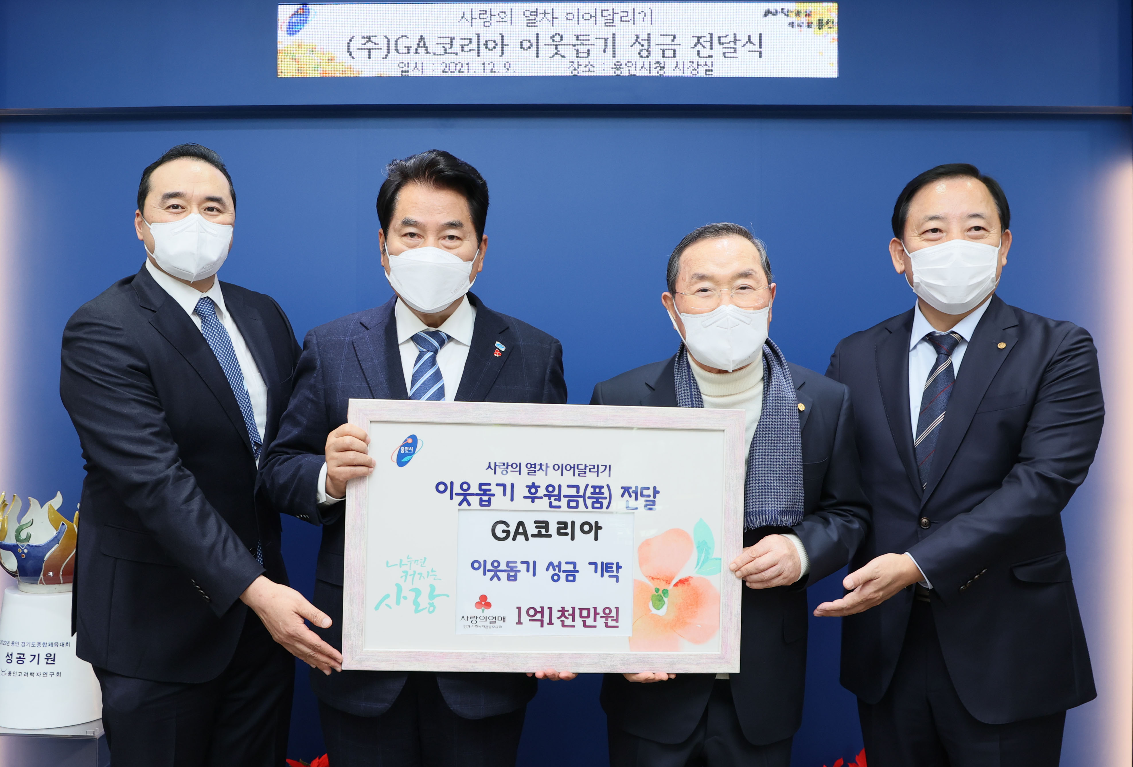 용인시, ‘사랑의 열차 이어달리기’ 성금·품 기탁 이어져 김경순 기자 2021-12-10 00:00 가 본문내용 확대/축소 본문 용인시, ‘사랑의 열차 이어달리기’ 성금·품 기탁 이어져 용인시의 대표적인 연말연시 이웃돕기 운동인 ‘사랑의 열차 이어달리기’에 어려운 이웃을 도우려는 단체들의 성금·품 기탁이 이어지고 있다. 용인시는 9일 ㈜GA코리아 이동준 회장 등 관계자 3명이 백군기 시장실을 방문해 성금 1억 1000만원을 기탁했다고 밝혔다. 이들은 지난해 코로나19 극복을 위한 이웃돕기 성금 7000만원을 기탁한 바 있다. 이동준 회장은 “코로나19로 더욱 추운 겨울을 지낼 이웃들을 위해 성금을 마련했다”며 “경제적 어려움을 겪는 분들께 도움이 되길 바란다”고 말했다. 백군기 용인시장은 “모두가 힘든 시기에도 나눔을 실천해 주신 GA코리아에 감사 드린다”며 “소중한 성금은 꼭 필요한 곳에 잘 전달하겠다”고 말했다. 이외에도 관내 기업과 단체들의 따뜻한 나눔이 잇따르고 있다. ▲만수정 장어구이(대표 김민수) 280만원 상당 담요 100세트(복지정책과 나눔복지팀) ▲용인노점상연합회(대표 이종문) 성금 200만원(기흥구 사회복지과 사회복지팀) ▲역북동 새마을부녀회(회장 안순월) 성금 100만원(처인구 역북동) ▲유림동 영락교회(목사 배덕환) 62만원 상당 백미 200kg 기탁(처인구 유림동) ▲대한한돈협회 용인시지부(지부장 서정용) 장학금 300만원(처인구 백암면) ▲박곡정미소(대표 오세홍) 300만원 상당 백미 100포(처인구 백암면) ▲대한한돈협회 용인시지부(지부장 서정용) 장학금 200만원(처인구 원삼면) ▲명석중기(대표 채명석) 성금 1000만원(처인구 포곡읍) ▲대한한돈협회 용인시지부(지부장 서정용) 장학금 100만원(처인구 포곡읍) ▲한원CC(대표 김인식) 280만원 상당 김치 400kg (처인구 남사읍) ▲영덕1동 새마을부녀회(회장 박순종) 92만원 상당 백미 10kg 23포(기흥구 영덕1동) ▲영덕1동 새마을지도자회(회장 최화식) 100만원 상당 백미 10kg 25포(기흥구 영덕1동) ▲상진건설기계(대표 박대근) 성금 100만원(기흥구 영덕2동) ▲하갈셀프주유소(대표 이종원) 성금 100만원(기흥구 영덕2동) ▲죽전패션타운 상가번영회(회장 박시복) 성금 50만원(수지구 죽전2동) ▲죽전2동 통장협의회(회장 홍현표) 성금 100만원(수지구 죽전2동) ▲죽전2동 통장 22명 성금 190만원(수지구 죽전2동) ▲상현3동 통장협의회(회장 전경옥) 성금 50만원(수지구 상현3동) ▲MG새마을금고 용인제일지점(지점장 이웅재) 성금 50만원(수지구 상현3동) 한편 시는 내년 2월 4일까지 총 10억원을 목표로 모금 운동을 추진하며, 기탁된 성금·품은 경기사회복지공동모금회를 통해 저소득 가정과 사회복지시설 등에 전달할 예정이다. 좋아요 0 싫어요 0 김경순 기자 기자의 다른기사 보기 목록 댓글목록 이전글 의원연구단체 「Sports-City 용인Ⅳ」, 21.12.10 다음글 용인시, ‘사랑의 열차 이어달리기’ 성금·품 기탁 이어져 21.12.10