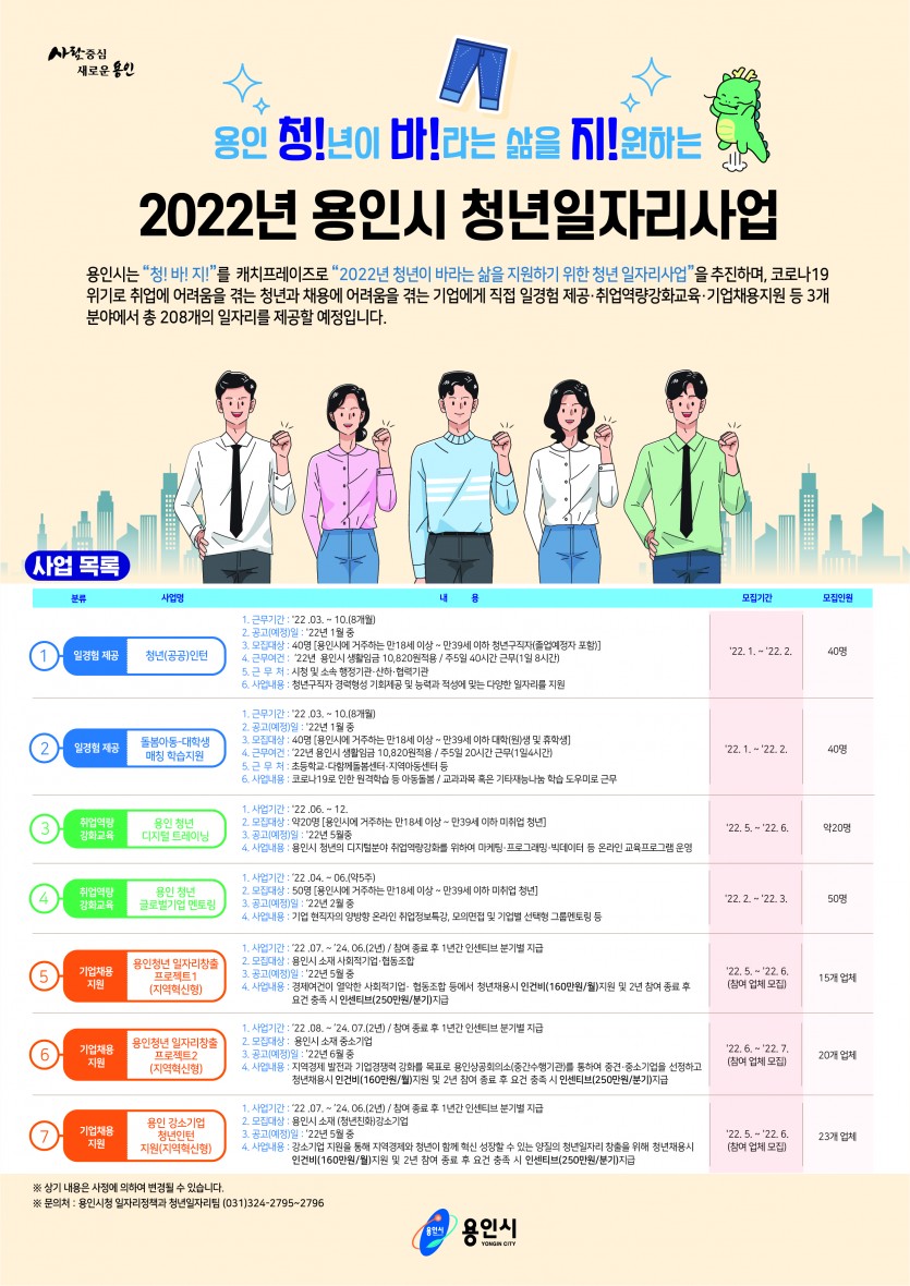 용인시,‘청년 취업난 해소’5개 사업서 일자리 138개 창출 김경순 기자 2021-12-22 08:38 가 본문내용 확대/축소 본문 용인시,‘청년 취업난 해소’5개 사업서 일자리 138개 창출 용인시가 청년 취업난 해소를 위해 내년에‘청!바!지!(용인 청년들이 바라는 삶을 지원하는)’일자리 사업을 본격 추진한다. 시는 22일 코로나19로 취업에 어려움을 겪는 청년들을 위해 내년에 2개 분야 5개 세부 사업에서 일자리 138개를 제공한다고 밝혔다. 또 취업역량 강화 프로그램 2개를 별도 운영해 청년 구직자들에게 맞춤형 교육도 제공한다. 우선, 일자리 제공은 ‘일 경험 제공’과 ‘기업채용 지원’등 2개 분야 5개 세부사업으로 나뉜다. 시에서 직접 제공하는 ‘일 경험 제공’ 일자리는 청년(공공)인턴과 돌봄아동-대학생 매칭 학습지원 등 2개 사업으로 각각 40명씩 모집한다. 청년(공공)인턴은 청년들이 공공기관 근무 경력을 바탕으로 취업 역량을 키울 수 있도록 시청이나 시청 산하 협력기관 등에서 8개월간 일할 기회를 제공한다. 돌봄아동-대학생 매칭 학습 지원은 코로나19로 인한 돌봄 공백을 해소할 수 있도록 대학(원)생들을 초등학교나 다함께돌봄센터, 지역아동센터 등의 학습도우미로 채용한다. 기업채용 지원은 청년 구직자를 채용하는 기업에 시가 인건비(160만원/월)와 일정 요건 충족 시 인센티브(250만원/분기별)를 지급하는 사업이다. 채용기업의 종류에 따라 지역혁신형 용인청년 일자리창출 프로젝트 1‧2와 용인 강소기업 청년인턴 지원 등 3개로 나뉜다. 용인청년 일자리창출 프로젝트1(15명)은 관내 사회적기업‧협동조합을 대상으로 프로젝트2(20명)는 용인상공회의소를 통해 선정된 관내 소재 중소(중견)기업을 대상으로 진행된다. 강소기업 청년인턴 지원(23명)은 강소기업(청년친화)이 대상이다. 이를 통해 창출되는 일자리는 58개다. 일자리 제공사업과는 별도로 취업역량 강화 프로그램을 통해 70명의 청년 구직자들에게 맞춤형 교육을 제공한다. 마케팅‧프로그래밍‧빅데이터 등의 온라인 교육프로그램을 제공하는‘용인 청년 디지털 트레이닝’과 기업 현직 근무자로부터 취업 정보를 얻고 그룹멘토링을 받을 수 있는‘용인 청년 글로벌기업 멘토링’등 2개 프로그램이다. 사업 참여 대상은 시에 주민등록을 둔 만 18세 이상 39세 이하 미취업 청년이며 각 사업 별 모집 기간과 요강은 시 홈페이지 고시 공고란을 참고하면 된다. 시 관계자는 “청년들이 보다 나은 삶을 꿈꾸고 어엿한 사회 구성원으로 성장할 수 있도록 취업 지원 프로그램을 강화하고 민관이 협력해 다양한 일자리를 발굴해 나가겠다”고 말했다. 좋아요 0 싫어요 0 김경순 기자 기자의 다른기사 보기 목록 댓글목록 이전글 용인시,‘청년 취업난 해소’5개 사업서 일자리 138개 창출 21.12.22 다음글 용인시,‘청년 취업난 해소’5개 사업서 일자리 138개 창출 21.12.22