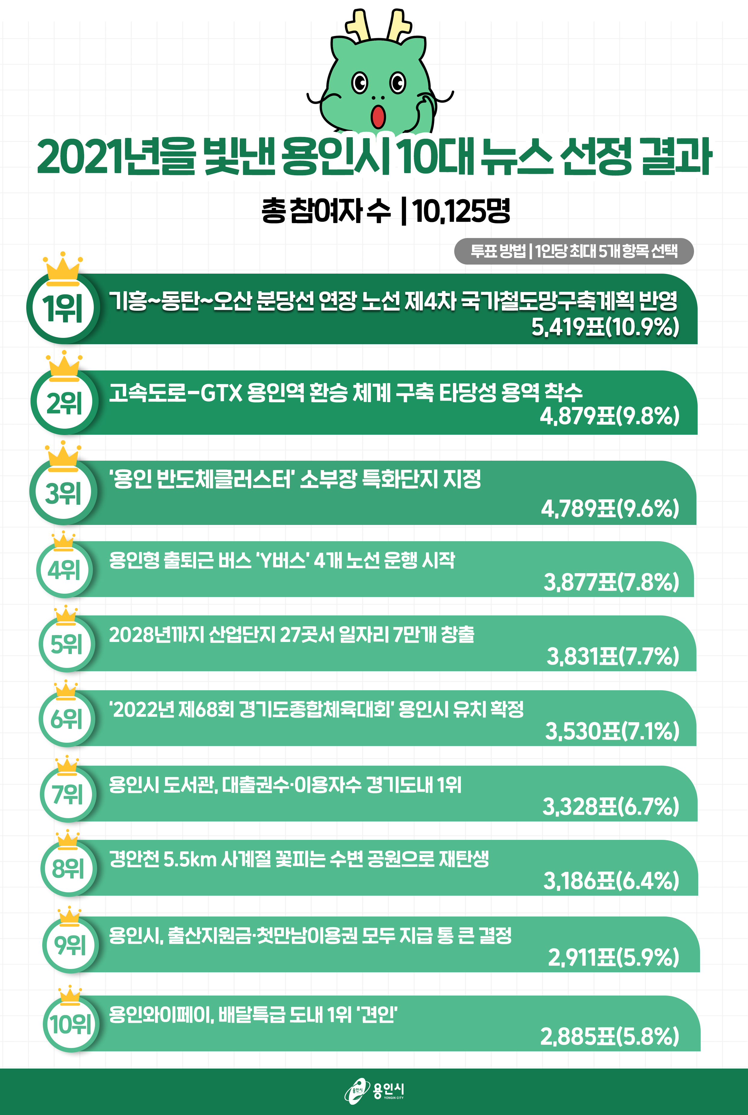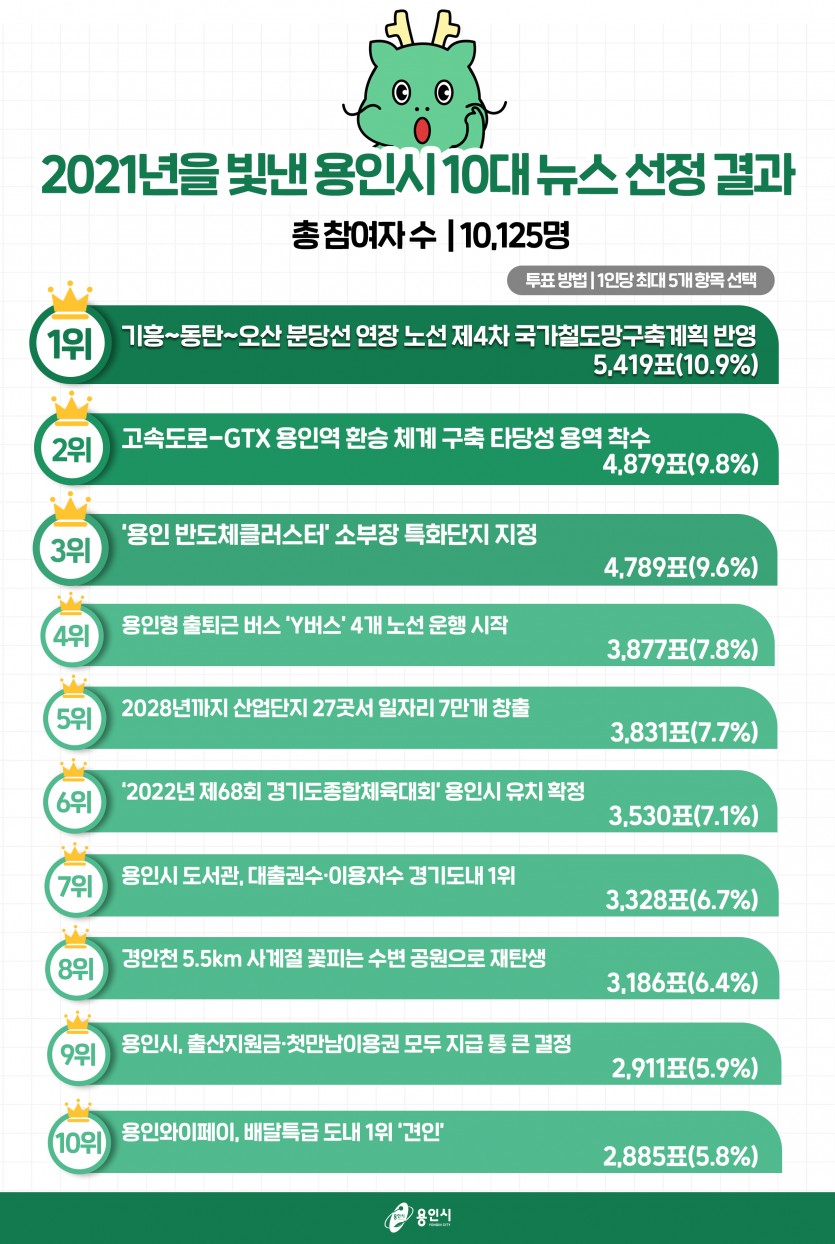 용인시민이 뽑은 2021년 용인시 10대 뉴스는? 1위로‘기흥~오산 분당선 연장 제4차 국가철도망계획 반영’꼽아 - - 온·오프라인으로 진행된 설문조사에 1만 125명의 시민 참여 - 김경순 기자 2021-12-23 09:39 가 본문내용 확대/축소 본문 용인시민이 뽑은 2021년 용인시 10대 뉴스는? 용인시민들은 ‘기흥~동탄~오산 분당선 연장노선 제4차 국가철도망계획 반영’을 2021년 용인시 관련 최대 이슈로 꼽았다. ‘고속도로-GTX 용인역 환승 체계 구축 타당성 용역 착수’, ‘용인 반도체클러스터 소부장 특화단지 지정’ 등도 굵직한 용인시 관련 뉴스로 꼽았다. 용인시는 23일 이같은 내용이 담긴 ‘2021 용인시 10대 뉴스’설문조사 결과를 발표했다. 설문은 지난 1일부터 20일까지 용인시민을 대상으로 온·오프라인으로 이뤄졌으며, 올해 보도된 주요 뉴스 15개를 선공개하고 순위에 상관없이 1인당 최대 5개의 뉴스를 선택하도록 하는 방식으로 진행했다. 설문 참가자는 1만 125명(총투표수 4만 9659표)이다. 설문 결과, ‘기흥~동탄~오산 분당선 연장노선 제4차 국가철도망계획 반영’은 총 5419표(10.9%)를 받아 1위를 차지했다. ‘고속도로-GTX 용인역 환승 체계 구축 타당성 용역 착수’는 4879표(9.8%)를 받아 두 번째를 차지했고 ‘용인 반도체클러스터 소부장 특화단지 지정’이 4789표(9.6%)를 받아 그 뒤를 이었다. 이어 ▲용인형 출퇴근 버스‘Y버스’ 4개 노선 운행 시작(3877표,7.8%) ▲2028년까지 산업단지 27곳서 일자리 7만개 창출(3831표,7.7%) ▲‘2022년 제68회 경기도종합체육대회’용인시 유치 확정(3530표,7.1%) ▲ 용인시 도서관, 대출권수·이용자수 경기도내 1위(3328표,6.7%) ▲경안천 5.5㎞ 사계절 꽃피는 수변 공원 재탄생(3186표,6.4%) ▲용인시, 출산지원금·첫만남이용권 모두 지급 통 큰 결정(2911표,5.9%) ▲용인와이페이, 배달특급 도내 1위 ‘견인’(2885표,5.8%) 등의 순으로 득표했다. 기흥~동탄~오산을 잇는 분당선 연장노선은 지난 6월 29일 국토교통부가 최종 발표한 ‘제4차 국가철도망 구축계획(221~2030)’에 신규 사업으로 반영됐다. 대통령 공약사항 중 하나로 교통 수요가 많은 한국민속촌과 공세동 기흥호수공원 등을 지나 동탄2신도시, 오산대역으로 연결돼 SRT(동탄역)나 경부선 전철 연계·환승에 큰 도움이 될 것으로 기대되고 있다. 특히 최근 대규모 쇼핑몰 개점으로 국지도 23호선, 지방도 317호선과 기흥IC 일대의 극심한 정체로 고통을 받는 인근 시민들의 교통편의를 크게 높이는 효과도 예상된다. ‘고속도로-GTX용인역 환승 체계 구축 타당성 검토 용역 착수’는 국내 처음으로 고속도로와 GTX 역사를 연계해 ‘상공형 환승정류장’을 구축하기 위해 진행중이다.앞서 시는 지난해 11월 국토교통부 주관 ‘수도권광역급행철도(GTX) 역사 환승센터 시범사업’에 선정돼 기본계획비 1억 5000만원을 확보했다. 3위를 차지한 ‘용인 반도체클러스터 소부장 특화단지 지정’은 처인구 원삼면 일대 일대 416만㎡에 조성되는 ‘용인 반도체클러스터’가 지난 1월 산업통상자원부의 소재·부품·장비 특화단지로 지정된 것을 말한다. 산업통상부도 ‘소부장 특화단지 추진단’을 출범시키고, 소재·부품·장비 특화단지 육성을 위해 2조 6000억원을 투입하기로 했다. 특히, SK하이닉스를 앵커 기업으로 선정하고 1조 7000억원을 투입해 연구개발, 테스트베드 구축, 전문인력 양성 등을 지원하겠다는 전략을 세웠다. 10대 뉴스에 들지는 않았지만 ‘용인시, 공약 이행 평가에서 처음으로 A등급’, ‘글로벌기업 에어프로덕츠와 1억5000만달러 규모 투자 협약’, ‘사라질 위기였던 신봉3근린공원 시민 품으로’등도 시민들이 꼽은 주요 뉴스였다. 한편, 시는 일반시민과는 별도로 출입기자와 시 공직자 등을 대상으로 같은 내용의 설문을 진행했다. 출입기자들은 ‘용인 반도체클러스터 소부장 특화단지 지정’을 올해 10대 뉴스의 첫 번째로 꼽았으며 ‘기흥~동탄~오산 분당선 연장노선 제4차 국가철도망구축계획 반영’을 두 번째로 꼽았다. 시 공직자들도 ‘용인 반도체클러스터 소부장 특화단지 지정’을 첫 번째로, ‘2022년 제68회 경기도종합체육대회 용인시 유치 확정’을 두 번째로 선정했다. 좋아요 0 싫어요 0 김경순 기자 기자의 다른기사 보기 목록 댓글목록 이전글 용인시, 4년 연속 잔류농약 분석 능력 세계적 수준 입증 21.12.23 다음글 용인시, 어린이보호구역 13곳 안전사고 예방시설 정비 21.12.22