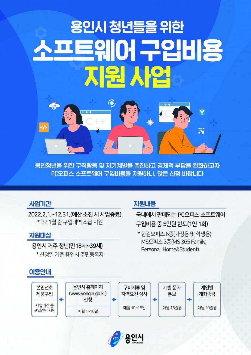 전국 최초 관내 청년에 소프트웨어 구입 비용 지원 용인시, 내년 2월1일부터 신청…가정용 오피스 프로그램 구입비 5만원 김경순 기자 2021-12-23 09:48 가 본문내용 확대/축소 본문 전국 최초 관내 청년에 소프트웨어 구입 비용 지원 용인시가 관내 청년들의 경제적 부담을 덜어주기 위해 전국 지자체 최초로 소프트웨어 구입 비용을 지원한다. 시는 내년부터 시에 주소를 둔 만18세 이상 39세 이하의 청년들에게 가정용 오피스 프로그램(한컴오피스, MS 오피스 퍼스널) 구입 비용의 일부를 지원하기로 했다고 23일 밝혔다. 취업준비생을 비롯한 사회초년생들의 경제적 부담을 완화해 자기 계발과 안정적인 구직활동을 돕고, 정품 소프트웨어 사용을 권장하기 위한 지원이다. 대부분의 대학이 소프트웨어 기업들과 협약을 맺고 재학생에게 할인 혜택을 제공하거나 프로그램을 무료로 사용할 수 있도록 지원하지만, 청년들은 졸업 이후 직접 라이센스를 구입해야 한다. 가정용 오피스 프로그램 구입 비용은 회사와 사용기간에 따라 최저 6만원에서 18만원에 달해 많은 청년들이 부담을 느끼고 있다. 이에 시는 관내 청년 1000명을 대상으로 국내에서 판매되는 가정용 오피스 프로그램을 직접 구입해 영수증을 제출하면 현금 5만원을 지원하기로 했다. 신청은 내년 2월 1일부터 시 홈페이지를 통해 온라인으로 할 수 있다. 1월에 구입한 건도 소급해 지원한다. 신청 시 주민등록초본과 구입 영수증(2022년 1월 1일 이후 구입분)과 소프트웨어 제조사 홈페이지 내 제품 등록 화면 캡처본 등을 제출하면 된다. 시 관계자는 “많은 청년들이 정품 소프트웨어 구입에 경제적 부담을 느끼고 있어 구입비 일부를 지원하게 됐다”며 “관내 청년들이 안정적으로 자기 계발을 하고 구직활동을 하는 데 보탬이 되길 바란다”고 말했다. 좋아요 0 싫어요 0 김경순 기자 기자의 다른기사 보기 목록 댓글목록 이전글 용인시, 2022년 경기도종합체육대회 홈페이지 개설 21.12.23 다음글 용인시, 4년 연속 잔류농약 분석 능력 세계적 수준 입증 21.12.23