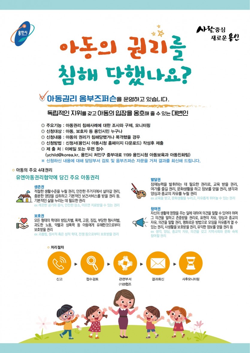“아동의 권리침해가 우려된다면 상담 신청해 주세요!” 용인시, 아동권리 옴부즈퍼슨 상담 서비스 운영 김경순 기자 2021-12-28 07:18 가 본문내용 확대/축소 본문 “아동의 권리침해가 우려된다면 상담 신청해 주세요!” 용인시가 아동의 권리 증진을 위해 ‘아동권리 옴부즈퍼슨 상담 서비스’ 운영에 나섰다. 아동권리 옴부즈퍼슨은 아동권리 침해사례에 대한 조사와 구제, 아동권리에 입각한 관련 정책, 제도의 개선안을 제시하기 위해 시가 지난 2019년부터 운영하고 있는 명예직 아동권리 지킴이다. 변호사, 청소년상담복지센터장, 교수 등 총 3명이 활동하고 있다. 관계 부서나 기관과 연계해 아동권리 침해사례 발생 시 이에 대한 조사와 모니터링을 수행하며 아동의 입장을 옹호해주는 대변인 역할을 하고 있다. 이번 상담 서비스는 권리를 침해당하고 있는 아동을 적극 발굴하고 지원하기 위해 도입, ‘용인시 아동시청 홈페이지’에서 상시 접수해 시민 누구나 이용할 수 있도록 했다. 아동의 권리가 침해당한 상황을 목격했거나, 상담이 필요한 아동은 누구나 용인시 아동시청 홈페이지에서 상담신청서를 내려받아 메일 또는 우편을 통해 제출하면 된다. 시 관계자는 “아동은 단순히 보호의 대상이 아닌 시민으로서 권리의 주체이다. 아동들이 목소리를 내고 권리를 행사할 수 있도록 아동권리 옴부즈퍼슨과 함께 상담 서비스를 제공하겠다”며 “아동권리 모니터링 체계 구축을 통해‘배움과 육아가 즐거운 아동친화도시’가 조성될 수 있도록 하겠다”고 말했다. 한편 아동권리는 유엔아동권리협약에 담긴 아동의 ‘생존권’, ‘발달권’, ‘보호권’, ‘참여권’ 등 총 4가지 권리를 말한다. 시는 아동권리에 대한 이해를 돕기 위해‘아동권리 홍보 동영상’을 제작해 지난 17일 용인시 공식 유튜브 채널에 게시하는 등 시민 인식 개선과 아동권리 증진을 위해 노력하고 있다. 좋아요 0 싫어요 0 김경순 기자 기자의 다른기사 보기 목록 댓글목록 이전글 용인시, 양성평등기금 지원단체 모집 21.12.28 다음글 용인시, 공사장 미세먼지 줄이기 위해 건설사 14곳과 맞손 21.12.28