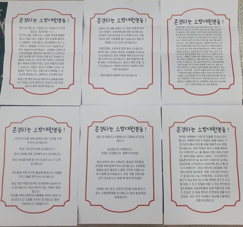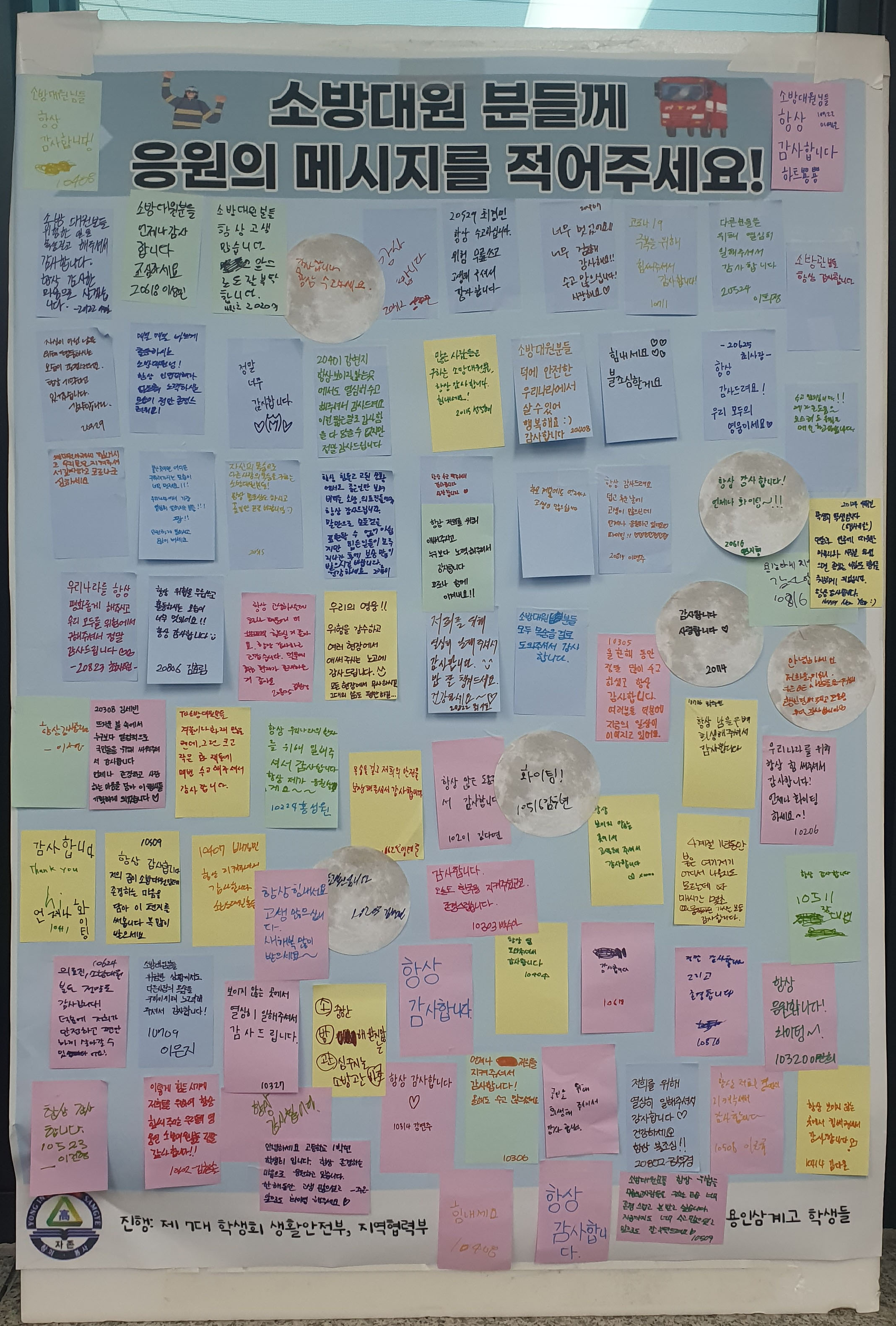 용인소방서, 학생들의 따뜻한 편지에“가슴 뭉클” “소방관님들 덕분에 안전한 나라에서 살 수 있어 행복해요” 김경순 기자 2022-01-04 18:15 가 본문내용 확대/축소 본문 용인소방서, 학생들의 따뜻한 편지에“가슴 뭉클”용인소방서, 학생들의 따뜻한 편지에“가슴 뭉클” 용인소방서(서장 임국빈)에 따르면 지난 12월 31일 15시경 용인 삼계고등학교 학생회 대표 4명은 소방공무원에게 전하는 응원의 메시지가 담긴 편지와 롤링페이퍼를 전달하기 위하여 포곡119안전센터를 방문했다. 편지와 롤링페이퍼에는 삼계고등학교 학생 100여명이 화재현장에서 몸을 사리지 않는 화재진압대원, 구조의 손길이 필요한 곳이면 어떤 상황이든 달려가는 구조대원, 코로나19라는 힘든 상황 속에서도 응급환자 처치에 최선을 다하는 구급대원들에게 학생들 각자의 마음을 담은 응원의 메시지가 적혀있다. 임국빈 용인소방서장은“삼계고등학교 학생들의 진심이 담긴 응원으로 추운 날씨에도 헌신하는 용인소방서 직원들 모두 큰 힘이 되었다”라며“앞으로도 시민들께서 항상 우리를 응원한다는 사실을 잊지 않고, 안전한 용인을 만들기 위해 최선을 다하겠다”라고 전했다. 좋아요 0 싫어요 0 김경순 기자 기자의 다른기사 보기 목록 댓글목록 이전글 다세대·아파트 등 공동주택 보조금 지원 신청·접수 22.01.06 다음글 용인시립합창단 2022 신년음악회 ‘카르미나 부라나 Carmina Burana’ 22.01.04