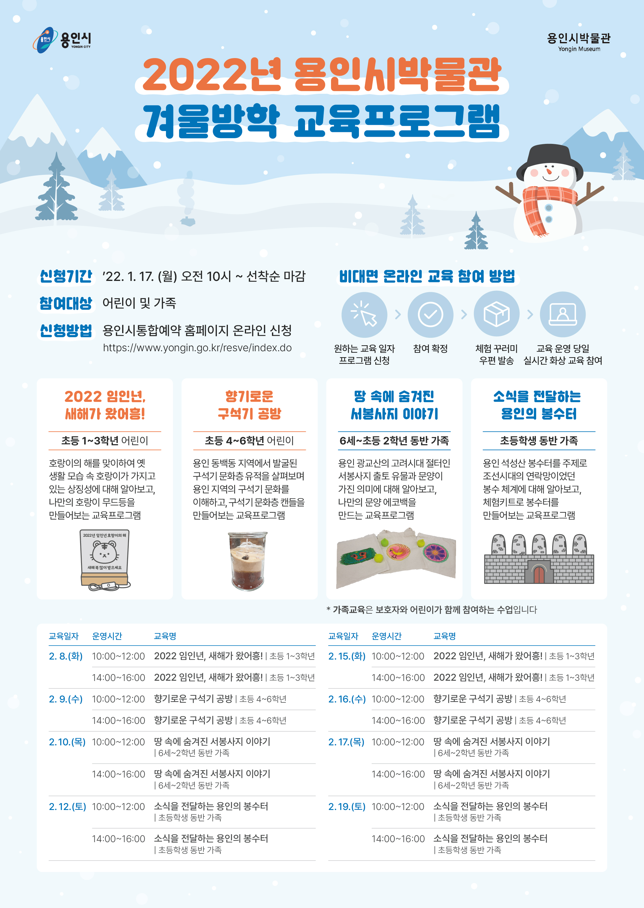 “이번 겨울방학은 용인시박물관과 함께해요” 오는 17일부터 겨울방학 교육프로그램 참가자 선착순 모집 김경순 기자 2022-01-10 07:32 가 본문내용 확대/축소 본문 “이번 겨울방학은 용인시박물관과 함께해요” 용인시박물관이 겨울방학을 맞아 아이들을 위한 다채로운 교육프로그램을 준비했다. 다음달 8일부터 19일까지 화상회의 앱인 줌(ZOOM)으로 진행되는 ‘2022년 용인시박물관 겨울방학 교육프로그램’은 새해를 맞아 십이지신과 용인의 역사를 쉽고 재밌게 만날 수 있는 시간으로 꾸며진다. 올해의 동물인 호랑이와 열두 띠 동물의 유래를 살펴보는 ‘2022 임인년, 새해가 왔어흥!’을 비롯해 용인 동백 지역의 구석기 문화에 대해 알아보는 ‘향기로운 구석기 공방’, 서봉사지 출토 유물과 연계한 ‘땅속에 숨겨진 서봉사지 이야기’, 용인 석성산 봉수터 유적지와 봉수 전달 체계를 알아보는 ‘소식을 전달하는 용인의 봉수터’가 차례로 진행된다. 6세 이상부터 초등학교에 재학 중인 어린이와 그 가족이라면 누구나 참여할 수 있으며, 참가자는 오는 17일부터 용인시 통합예약 홈페이지(https://www.yongin.go.kr/resve/index.do)에서 선착순으로 모집한다. 용인시박물관 관계자는 “이번 프로그램을 통해 어린이들이 즐겁고 알찬 겨울방학을 보낼 수 있길 바란다”며 “많은 관심과 신청 바란다”고 말했다. 좋아요 0 싫어요 0 김경순 기자 기자의 다른기사 보기 목록 댓글목록 이전글 용인시, 다자녀 가정 도서대출 확대 서비스 시행 22.01.10 다음글 "노후 보일러, 저녹스 보일러로 교체하세요" 22.01.10