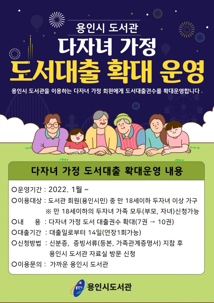 용인시, 다자녀 가정 도서대출 확대 서비스 시행 - 두 자녀 이상 가족 대상 기존 7권에서 10권으로 늘려 - 김경순 기자 2022-01-10 07:34 가 본문내용 확대/축소 본문 용인시, 다자녀 가정 도서대출 확대 서비스 시행 용인시 도서관사업소가 다자녀 가정을 대상으로 도서대출 확대 서비스를 시행한다고 10일 밝혔다. 이번 도서대출 확대는 다자녀 가정 지원을 위해 추진, 시에 거주하고 있는 두 자녀 이상의 다자녀 가정은 기존 7권에서 10권까지 책을 빌릴 수 있게 됐다. 도서대출을 위해서는 신분증과 주민등록등본 등 증빙서류를 지참하고 관내 17개 공공 도서관 자료실에 방문해 다자녀 회원으로 신청하면 된다. 다자녀 가정의 가족 구성원 모두 다자녀 회원으로 가입할 수 있으며, 대출 권수도 각기 적용된다. 다자녀 가정의 회원자격은 마지막 자녀가 만 18세에 도래할 때까지 유지된다. 시 도서관사업소 관계자는 “시민들이 다양한 도서를 접하는데 도움이 되길 바란다”면서 “앞으로도 시민들을 위한 폭넓은 서비스를 운영해 나가겠다”고 말했다. 자세한 내용은 시 도서관사업소 홈페이지에서 확인하거나, 각 도서관 자료실로 문의하면 안내받을 수 있다. 좋아요 0 싫어요 0 김경순 기자 기자의 다른기사 보기 목록 댓글목록 이전글 미세먼지 농도 ‘매우 나쁨’ 용인시, 저감조치 등 즉각 대응 22.01.10 다음글 “이번 겨울방학은 용인시박물관과 함께해요” 22.01.10