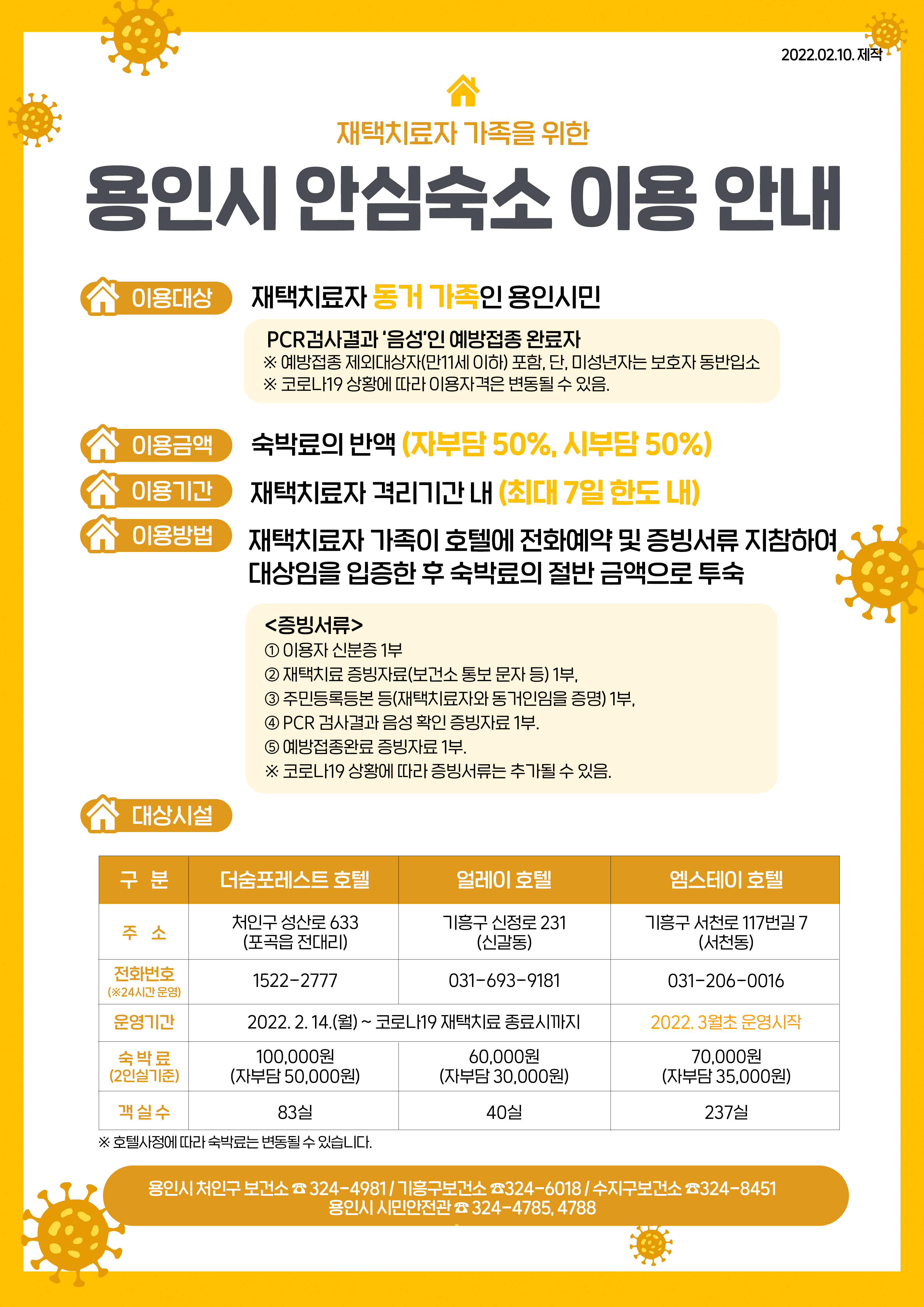 관내 3곳 호텔 재택치료 가족에‘안심숙소’로 제공 - 용인시, 14일부터 운영 시작…확진 재택치료자 위한‘생활시설’도 운영 - 김경순 기자 2022-02-11 08:13 가 본문내용 확대/축소 본문 관내 3곳 호텔 재택치료 가족에‘안심숙소’로 제공 용인시가 오는 14일부터 재택치료를 받는 확진자들의 동거 가족의 안전을 위해 관내 호텔 3곳과 협력해 ‘안심숙소’를 운영한다. 시는 11일 관내 호텔 3곳(엠스테이, 얼레이, 더숨포레스트 호텔)과 협력식을 갖고 재택치료자 동거 가족에게 기존 숙박료의 반값으로 호텔을 이용할 수 있도록 하는 ‘안심숙소’를 운영하기로 했다. 코로나19 오미크론 변이 바이러스 확산으로 재택치료자가 급증, 이들 동거가족의 2차 감염을 막으려는 취지다. 이날 협력식엔 백군기 용인시장, 문필영 엠스테이 호텔 대표, 전승근 얼레이 호텔 대표, 박용수 더숨포레스트 호텔 대표 등 관계자 8명이 참석했다. 안심숙소는 오는 14일부터 이용할 수 있다. 이용 대상은 용인시민이면서 코로나19 확진 판정을 받고 재택치료를 받는 사람의 동거가족이다. 단, PCR 검사 결과 음성이면서 예방접종을 완료해야 한다. 예방접종 제외 대상인 만 11세 이하 아동들도 PCR 검사 결과 음성이 나왔다면 보호자 동반 입소를 원칙으로 안심숙소를 이용할 수 있다. 이용료는 기존 숙박료의 50%다. 나머지 50%는 시에서 직접 숙박업소에 지급한다. 이용을 원하는 가족은 신분증 등 관련 서류를 이용하고자 하는 호텔에 제출하면 된다. 안심숙소 이용과 관련된 자세한 내용은 시 홈페이지 공지사항을 통해 확인할 수 있다. 시는 또 코로나19 확진 판정을 받은 후 감염에 취약한 주거 환경 거주 등의 사유로 가족과 분리를 원하는 재택치료자를 위한 ‘생활시설’도 별도로 마련했다. 생활시설은 기존 자가격리자 편의시설로 이용하던 처인구 모현읍 초부리 용인자연휴양림 내 ‘용인산림교육센터’다. 1인 1실 사용을 원칙으로 하되, 가족에 한해 동반 입소가 가능하다. 입소를 원하는 사람이 보건소 재택치료TF팀에 신청을 하면 적합자를 선정해 입소 기회를 부여한다. 백군기 시장은 “코로나19 극복을 위해 안심숙소 운영에 적극 협력해 주신 호텔 관계자들께 진심으로 감사드린다”며 “안심숙소가 코로나19 확진자 폭증으로 재택치료가 불가피한 상황에서 동거가족들의 2차 감염을 막는데 큰 도움이 될 것으로 기대한다”고 말했다. 좋아요 0 싫어요 0 김경순 기자 기자의 다른기사 보기 목록 댓글목록 이전글 “달라지는 행정제도, 리플릿으로 알기 쉽게 확인하세요” 22.02.11 다음글 용인시, 지방분권법 행안위 통과로 특례권한 확보에 청신호 22.02.11
