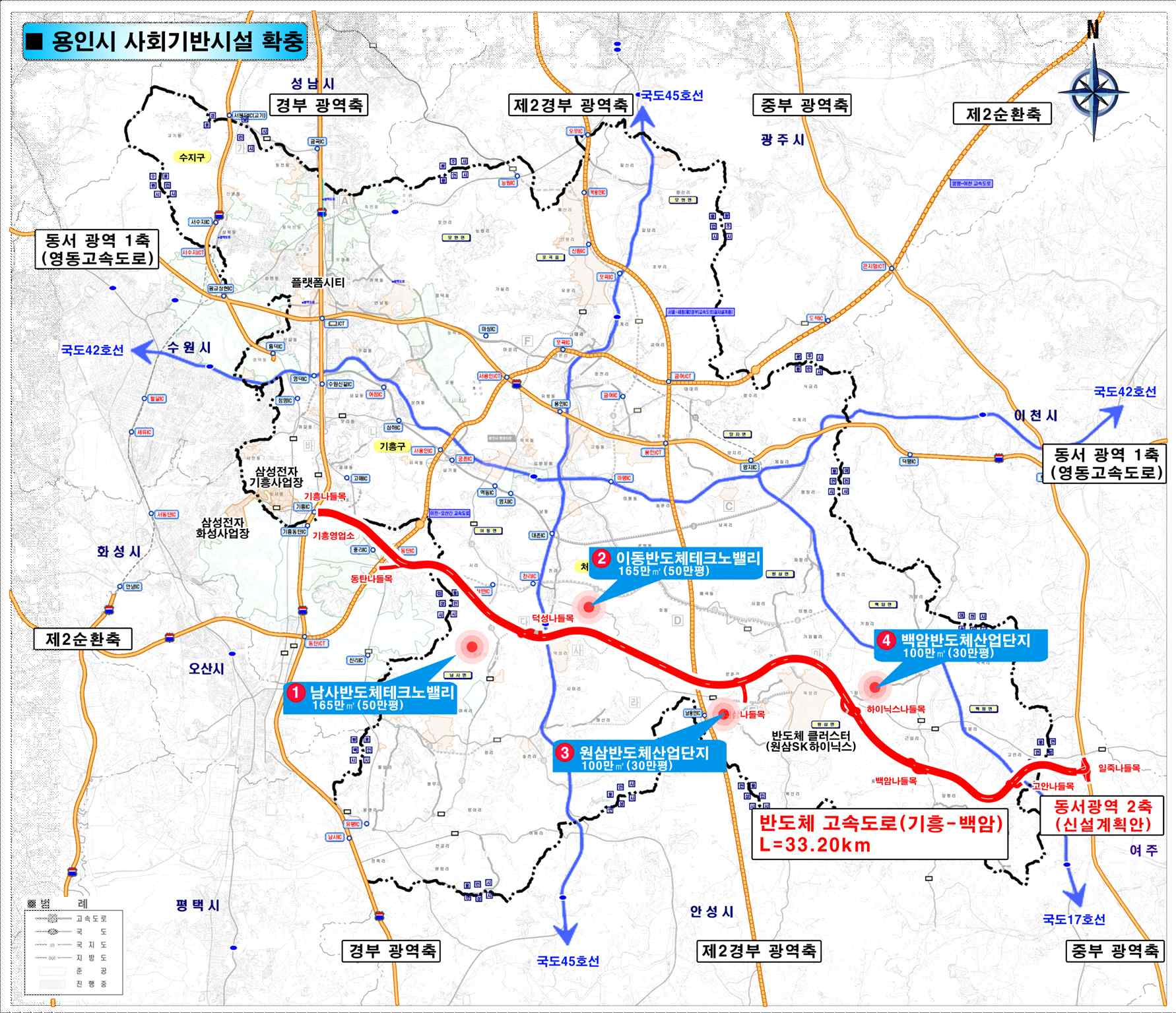 <국민의힘 이상일용인시장 후보 민자고속도로 및 반도체 클러스터조성> 김경순 기자 2022-05-02 20:37 가 본문내용 확대/축소 본문 <국민의힘 이상일용인시장 후보 민자고속도로 및 반도체 클러스터조성><국민의힘 이상일용인시장 후보 민자고속도로 및 반도체 클러스터조성><국민의힘 이상일용인시장 후보 민자고속도로 및 반도체 클러스터조성> 국민의힘 이상일 용인특례시장 후보 공약 이상일 의원님, [2022-05-02 오전 10:37] 국민의힘 이상일 용인특례시장 후보 공약 <용인시 반도체 고속도로 신설 및 반도체 산업 클러스터 조성> 안녕하십니까? 국민의 힘 용인특례시장후보 이상일 인사드리겠습니다. 지난 4월 28일에 “용인철도망 확충공약” 발표에 이어 오늘은 “용인반도체 고속도로 및 반도체 클러스터 조성”공약을 발표하겠습니다. 반도체 도로 등의 공약 설명에 앞서 철도공약에 대한 제 생각을 다시한번 분명히 밝혀드립니다. 저는 대통령 당선인 공약인 지하철 3호선 수지ㆍ광교 연장, 그리고 용인시가 기존에 검토해 온 동백~신봉 도시철도 사업을 그대로 계속, 그리고 적극적으로 추진 하겠다는 입장을 4월 28일 기자회견 서두에서 분명히 강조했습니다. 그리고 이의 추진과 함께 새로운 대안 노선인 지하철 3호선 수지~구성~동백~김량장동~양지~원삼 연장도 검토하겠다고 발표했습니다. 지하철 3호선 수지ㆍ광교 연장이 차량기지 확보 문제로 제대로 추진되지 못할 경우, 그리고 동백~신봉 노선도 원할하게 추진되지 못할 경우에 대안인 플랜B(지하철 3호선 수지~원삼 연장)를 미리부터 검토해서 중앙정부와의 협의에 들어가겠다는 뜻을 기자회견에서 몇차례나 강조했습니다. 3호선 수지ㆍ광교 연장이나 동백~신봉 도시철도 사업이 어려워질 경우 뒤늦게 대안을 찾기보다 두 가지 사업을 추진하면서 잘 안될 경우에도 대비하겠다는 것입니다. 그럼 반도체 고속도로 건설과 반도체 육성공약에 대해 말씀 드리겠습니다. 제가 시장으로 선출된다면 용인 처인구 남부지역을 동서로 관통하는 민자 고속도로를 신설하고 반도체 클러스터 조성을 최대한 빨리 완성하겠습니다. 반도체 관련 업체가 밀집된 기흥과 새로 조성될 처인구 원삼 SK하이닉스 산업단지를 잇는 민자고속도로를 만들고, 그 고속도로 백암을 거쳐 안성 일죽 중부고속도로까지 연결하겠습니다. 그리고 고속도로 인근 지역을 반도체 산업 벨트로 조성해 용인 전체가 반도체 산업 클러스터로 조성하겠습니다. 고속도로는 전액 민간자본으로 건설이 추진되며 총 길이는 약33.2㎞입니다. 출입 IC 6곳, JCT 3곳을 설치할 계획입니다. 수도권 남부지역의 동서를 횡단하는 영동고속도로와 평택∼음성 고속도로의 떨어진 거리가 약 27㎞인데, 반도체 고속도로가 이 중간지대에 건설되면 삼성반도체가 있는 기흥에서 일죽까지(약 50㎞) 자동차로 통상 90분 걸리던 소요 시간이 약 20분으로 크게단축될 것으로 보입니다. 또한 용인 남부지역 간선도로인 42번, 17번, 45번 국도의 차량정체 해소에도 큰 도움을 줄 것입니다. 저는 이 고속도로를 축으로 판교형 반도체 테크노밸리 2개와 반도체 관련 생산시설이 입지할 산업단지 2개 등 총 528만㎡ 규모의 반도체 산업 입지를 조성해 좋은 일자리를 창출하고 지역 경제를 활성화시키겠습니다. 용인이 대한민국 반도체의 중심도시, 국가경제성장동력의 핵심도시라는 브랜드 이미지를 갖도록 하겠습니다. 구체적으로 처인구 이동·남사지역에는 반도체 관련 R&D 시설과 연구ㆍ교육 등의 시설을 유치하고, SK하이닉스가 입주하는 처인구 원삼과 인근 백암지역에는 반도체 소부장(소재, 부품, 장비) 기업들이 입주해서 양질의 일자리를 만들고 지역을 발전시키는 데 크게 기여하도록 하겠습니다. 현재 용인시에는 총 29개의 산업단지가 조성됐거나 추진되고 있으나 16만5,000㎡ 이상의 산업단지는 3개에 불과합니다. 소규모 산업단지로 반도체 관련 소부장(소재, 부품, 장비) 기업들의 연구 및 생산시설을 수용하기 어려운만큼 충분한 인프라와 자족기능을 갖춘 대규모 산업단지를 조성해서 용인을 미국 실리콘밸리를 능가하는 세계최고의 반도체 클러스터가 되도록 키우겠습니다. 윤석열 대통령 당선인도 반도체를 국가의 전략산업으로 집중 육성하겠다는 의지를 갖고 있는 만큼 윤 당선인이 대선을 치를 때 캠프 공보실장과 대통령 후보 상근보좌역을 지낸 제가 시장이 되면 윤석열 대통령과 중앙정부의 지원을 최대한 이끌어 내서 용인을 세계에서 가장 앞서가는 반도체 도시로 변모시킬 수 있도록 하겠습니다. 제가 시장에 선출되면 윤석열 대통령을 처인구 원삼 반도체 클러스터 지역으로 모셔서 반도체 산업 육성과 도로ㆍ철도 등 교통망 확충, 그리고 전력 및 용수 지원 등 반도체 산업 발전을 위한 모든 인프라가 제대로 갖춰질 수 있도록 윤 대통령의 특별한 관심과 지원을 요청하겠습니다. SK 하이닉스에는 원삼과 백암 지역에 대한 적극 지원을 요청하겠습니다. SK하이닉스에는 반도체 클러스터 조성을 위한 보다 적극적인 투자, 클러스터 지역 시민들에 대한 적극 지원과 배려를 요청하겠습니다 또 원삼ㆍ백암 지역 취약계층