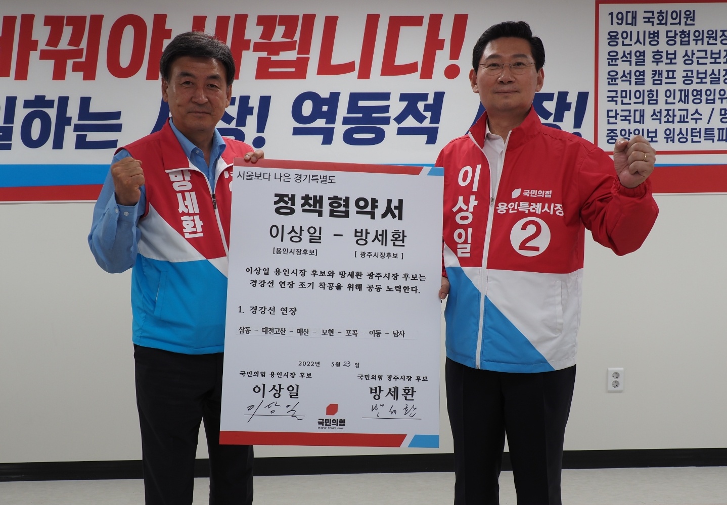 경강선 전철 광주~남사 연장 성사 위해 함께 노력 이상일 용인시장 후보·방세환 광주시장 후보 정책협약서 교환 - - 신 개발지 인구 급증에 대응 연장노선 조기착공 공동 노력 약속 - 김경순 기자 2022-05-24 17:10 가 본문내용 확대/축소 본문 경강선 전철 광주~남사 연장 성사 위해 함께 노력 “경강선 전철을 광주에서 남사까지 연장할 수 있도록 국민의힘 용인특례시장 후보와 광주시장 후보가 한마음으로 힘을 모아 추진할 것이다.” 국민의힘 이상일 용인특례시장 후보와 방세환 광주시장 후보는 23일 기흥구 소재 이 후보의 선거사무소에서 경강선 전철 조기착공을 위해 공동으로 노력한다는 내용의 정책협약을 맺었다. 이는 최근 급속한 개발로 인구가 급증하고 있는 광주시 태전동과 오포읍, 용인시 모현·포곡·이동·남사읍 일대의 통행수요를 충족하려면 경강선 연장이 필수적이란 판단에 따른 것이다. 이와 관련해 정부는 지난해 7월 고시한 ‘제4차 국가철도망 구축계획’에 경강선 연장 노선을 ‘추가검토’ 대상으로 분류한 바 있다. 추가검토 대상 노선은 대안 노선 등을 찾아 타당성을 입증하면 사업이 추진될 수 있다. 이상일 후보는 “용인시 처인구와 광주시 오포읍 일대는 최근 개발이 급속도로 진행되면서 빠른 속도로 인구가 유입되고 있다”며 “경강선 전철 연장을 서둘러야 교통혼잡을 완화할 수 있을 것”이라고 강조했다. 한편 두 후보가 공조를 협정한 노선안은 광주 삼동역을 기점으로 태전·고산~매산~모현~포곡~이동~남사로 이어지게 된다. 좋아요 0 싫어요 0 김경순 기자 기자의 다른기사 보기 목록 댓글목록 이전글 경강선 전철 광주~남사 연장 성사 위해 함께 노력 22.05.24 다음글 용인시청소년수련관 청소년방과후아카데미 22.05.24