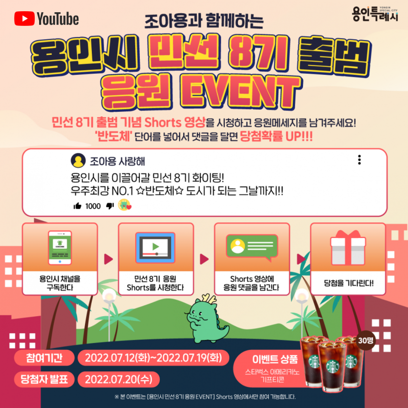 용인시 유튜브에 댓글 달고 시원한 커피 한 잔 할래요? - 용인시, 채널 구독 후 민선 8기 응원 댓글 작성한 30명에 모바일 상품권 제공 - 김경순 기자 2022-07-13 11:09 가 본문내용 확대/축소 본문 용인시 유튜브에 댓글 달고 시원한 커피 한 잔 할래요? 무더운 여름, 용인시 유튜브 채널에서 귀여운 '조아용' 영상을 본 후 댓글을 달아 시원한 커피로 더위를 식히는 것은 어떨까? 용인시는 민선 8기 출범을 맞아 오는 19일까지 채널 구독 후 민선 8기 응원 댓글을 작성한 30명을 추첨해 커피 모바일 상품권을 제공한다. 참여를 원하는 사람은 유튜브 채널을 구독하고, 민선 8기 응원 Shorts 영상을 시청한 후 댓글을 작성하면 된다. 이 영상에는 제4회 우리동네캐릭터 대상에 빛나는 용인시 캐릭터 '조아용'이 출연해 약 1분간 귀여움을 뽐낸다. 글로벌 반도체 도시로의 도약을 꿈꾸는 용인에 맞게 '반도체' 단어를 활용해 응원 댓글을 달면 당첨 가능성이 높아진다. 당첨자는 오는 20일 유튜브 커뮤니티 게시판을 통해 공개된다. 시 관계자는 "많은 시민들이 참여해 민선 8기 출범을 응원하는 멋진 댓글을 달아주시길 기대한다"며 "시민들과 함께하는 다양한 이벤트를 마련해 시의 정책을 시민들께 전하는 일에 최선을 다하겠다"고 말했다. 좋아요 0 싫어요 0 김경순 기자 기자의 다른기사 보기 목록 댓글목록 이전글 ‘스몸비 꼼짝마’신갈초 스쿨존 스마트폰 사용 제한 22.07.13 다음글 "대한민국에서 폭염에 가장 안전한 도시, 용인특례시" 22.07.13