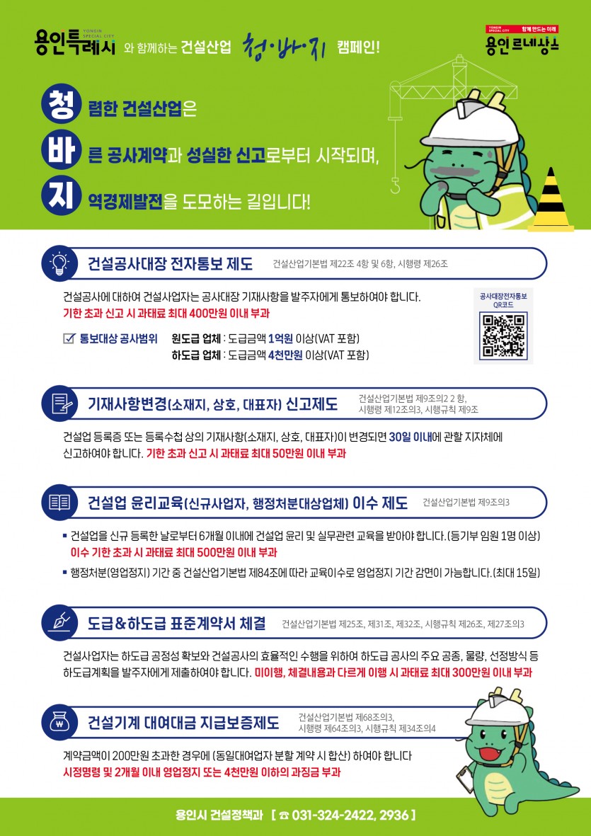 용인특례시, 건설공사 신고ㆍ계약제도 안내문 배포 - 건설기업에 사전소통 서비스...청바지(청렴+바름+지역발전) 캠페인 일환 김경순 기자 2023-01-30 06:44 가 본문내용 확대/축소 본문 용인특례시, 건설공사 신고ㆍ계약제도 안내문 배포 용인특례시(시장 이상일)는 건전한 건설산업 환경을 조성하기 위해 각종 신고와 계약 제도에 대한 내용을 담은 안내문을 제작해 건설사업자에게 배포한다고 29일 밝혔다. 흔히 실수하는 신고나 계약 관련 제도와 법률 정보를 미리 알려줘 과태료나 영업정지 등 행정처분의 불이익을 당하지 않도록 돕기 위해서다. 안내문에는 건설공사대장 전자통보제도를 비롯해 기재사항변경 신고제도, 건설업 윤리교육 이수제도, 도급‧하도급 표준계약서 체결제도, 건설기계 대여대금 지급보증제도 등에 대한 설명이 담겼다. 모두 건설산업기본법에 따라 건설사업자가 건설사업을 시행하면서 의무적으로 시행해야 하는 제도로 기한 내 신고하지 않으면 40~500만원의 과태료가 부과된다. 시는 대한전문건설협회 경기도회 용인시지회와 함께 협력해 관내 건설사업자를 대상으로 배포할 방침이다. 이와 함께 시는 건설산업의 청렴한 분위기 조성을 위해 ‘청바지 캠페인’을 벌인다. ‘청렴한 건설산업은, 바른 공사계약과 성실한 신고로부터 시작되며, 지역경제발전을 도모하는 길입니다’ 라는 문구의 앞 글자를 딴 것이다. 시 관계자는 “건설사업자가 관련 규정을 숙지하도록 돕기 위해 안내문을 제작 배포했다”며 “앞으로도 청바지 캠페인 문구를 다양한 홍보물에 활용해 건설산업의 청렴 분위기를 조성하도록 노력하겠다”고 말했다. 좋아요 0 싫어요 0 김경순 기자 기자의 다른기사 보기 목록 댓글목록 이전글 용인특례시, 6월까지 무료 공공와이파이 30대 추가 23.01.30 다음글 65세이상 노인, 4년새 29.1% 증가…‘고령자 삶의 질’촘촘한 정책 역점 23.01.30