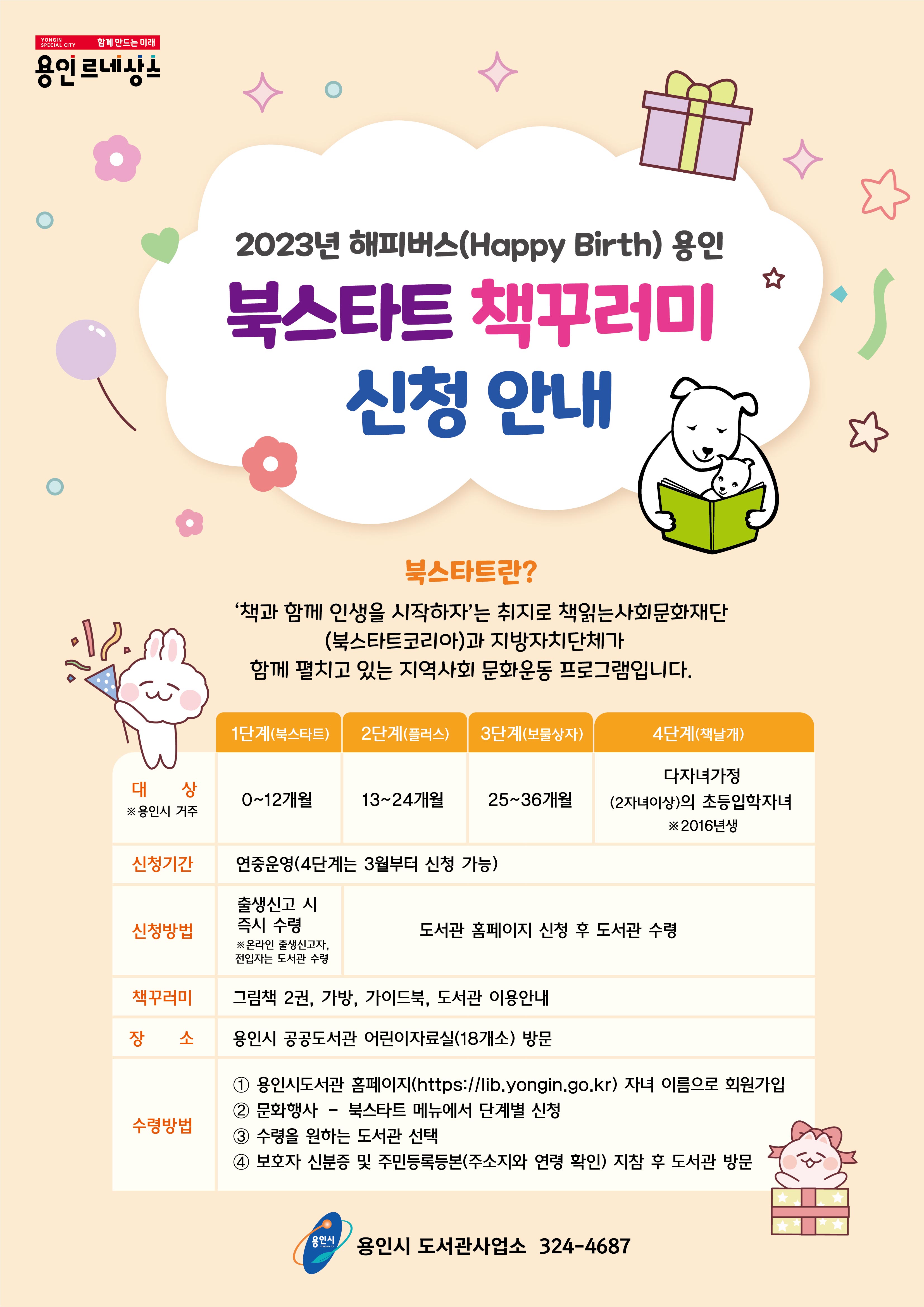 용인특례시, 출생신고 아기에게 첫 책 선물합니다 - 독서운동‘북스타트’동참...영유아와 다자녀 가정 초등입학생에 그림책 2권 김경순 기자 2023-02-08 07:45 가 본문내용 확대/축소 본문 용인특례시, 출생신고 아기에게 첫 책 선물합니다 용인특례시가 0~36개월 아기에게 생애 첫 책 꾸러미를 선물한다. 용인특례시(시장 이상일)는 책과 함께 인생을 시작하자는 취지의 지역사회 독서운동인 ‘북스타트’에 동참, 관내 영유아에게 책 꾸러미를 선물한다고 8일 밝혔다. 지원 대상은 0~36개월 영유아다. 지난해부턴 2자녀 이상의 다자녀 가정의 초등 입학생도 대상에 포함됐다. 올해는 2016년생에게 지원한다. 책 꾸러미에는 그림책 2권과 도서관 이용안내 책자가 들어있다. 0~12개월 아기는 출생신고를 할 때 구청이나 행정복지센터에서 책 꾸러미를 바로 받을 수 있다. 이미 출생신고를 했거나 다른 지역에서 전입한 13~36개월 아이와 다자녀 가정 초등 입학생은 시 도서관 홈페이지(lib.yongin.go.kr)에서 꾸러미를 신청한 뒤 가까운 도서관을 방문하면 된다. 방문을 할 땐 보호자의 신분증과 주민등록등본을 소지해야 한다. 시 관계자는 “영유아 단계에서부터 책 읽는 습관을 기르면 인지력 향상과 인성 발달에 긍정적인 도움을 주는 것으로 알려져있다”며 “북스타트 책 꾸러미를 통해 어린이들이 책과 친해질 수 있는 계기가 되기 바란다”고 말했다. 좋아요 0 싫어요 0 김경순 기자 기자의 다른기사 보기 목록 댓글목록 이전글 용인특례시, ‘치유 원예 교육’수강할 시민 모집 23.02.08 다음글 용인시 처인구, 터미널사거리 상습정체 구간 교통개선 23.02.08