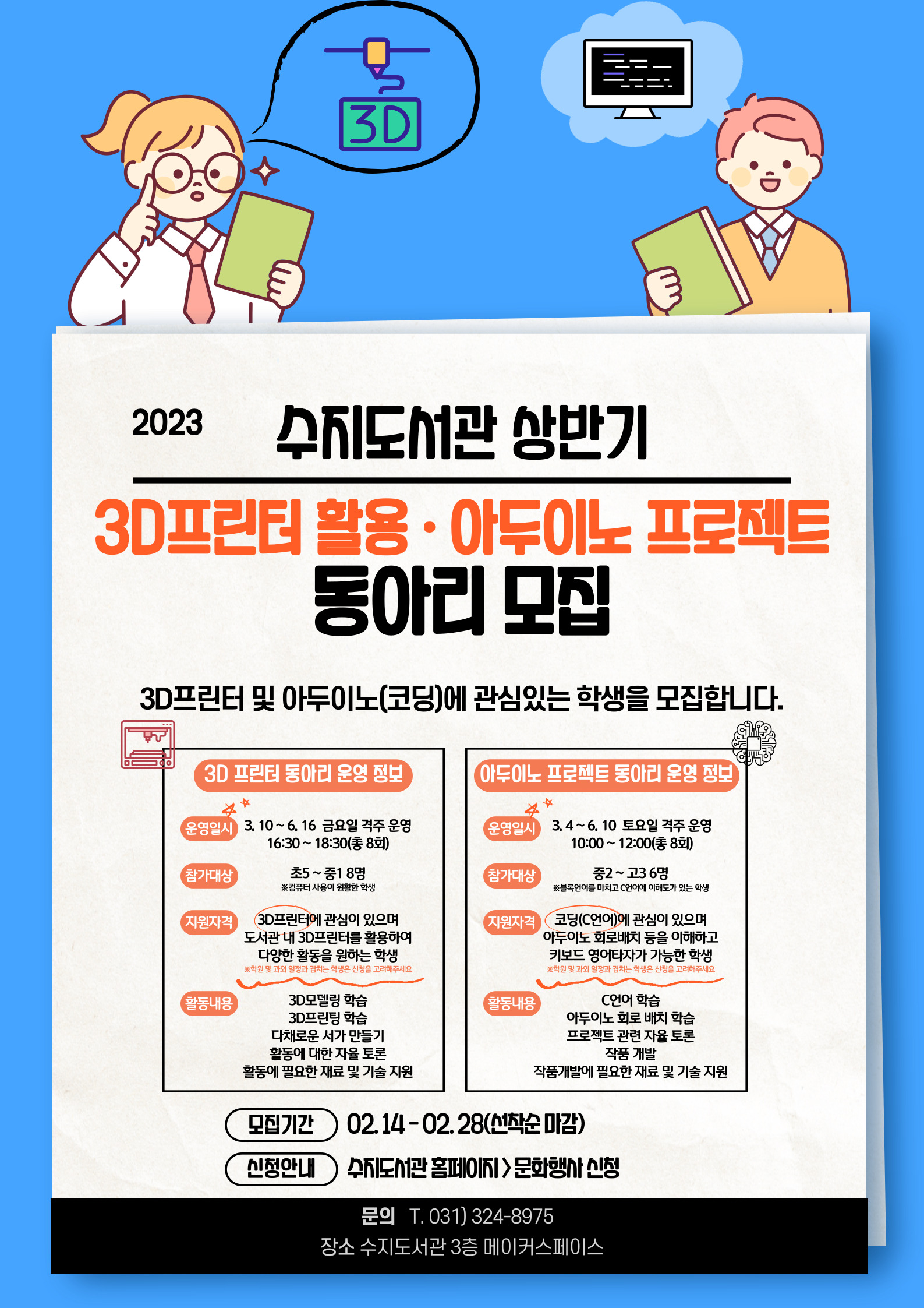 용인특례시, 수지도서관 디지털 창작동아리 회원 모집 - 14일부터…청소년 대상 3D 프린터·코딩, 성인 대상 2D 디자인 등 24명 김경순 기자 2023-02-12 19:08 가 본문내용 확대/축소 본문 용인특례시, 수지도서관 디지털 창작동아리 회원 모집용인특례시, 수지도서관 디지털 창작동아리 회원 모집 용인특례시(시장 이상일)는 4차 산업혁명 특성화 도서관인 수지도서관에서 디지털과 미디어 창착 활동을 할 시민 24명을 모집한다고 12일 밝혔다. 지난해 4월 리모델링 후 재개관한 수지도서관은 4차 산업혁명 특성화 주제의 다양한 디지털 창작 프로그램을 진행해 시민들의 큰 호응을 얻고 있다. 올 상반기에는 어린이와 청소년 대상의 창의력 향상을 위한 디지털 창작동아리와 성인 대상의 디자인 및 미디어 기술 공유를 위한 창작동아리로 나눠 운영한다. 디지털 창작동아리는 초등학교 5학년생부터 중학교 1학년생을 위한 ‘3D 프린터 동아리’와 중학교 2학년생부터 고등학교 3학년생을 위한 ‘아두이노(코딩) 프로젝트’ 등 두 가지 동아리로 구성됐다. 미디어 창작동아리는 다양한 2D 소프트웨어를 활용해 시각디자인과 그래픽디자인 작품활동을 하는 ‘2D 디자이너 동아리’와 영상을 주제로 자율적인 토론을 하고 촬영, 편집까지 실습하는 ‘미디어 창작동아리’로 나뉜다. 참여를 하려면 오는 14일부터 수지도서관 홈페이지를 통해 신청하면 된다. 동아리 회원으로 선정되면 창작활동에 필요한 운영재료를 비롯해 2D‧3D 디자인 실력을 갖춘 메이커 스페이스 전문 담당자의 기술 코칭 등을 받을 수 있다. 시 관계자는 “디지털 창작에 대한 시민들의 관심과 수요를 반영하기 다양한 동아리를 마련했다”며 “진로 탐색과 취미 활동을 위한 창의적 활동을 하길 원하는 시민들이 많이 참여하기 바란다”고 말했다. 좋아요 0 싫어요 0 김경순 기자 기자의 다른기사 보기 목록 댓글목록 이전글 용인특례시, 단독·다가구주택 등에 상세주소 직권 부여해 시민불편 해소 23.02.13 다음글 용인특례시,‘신성장사업 발굴’혁신주축 머리 맞댔다 23.02.12