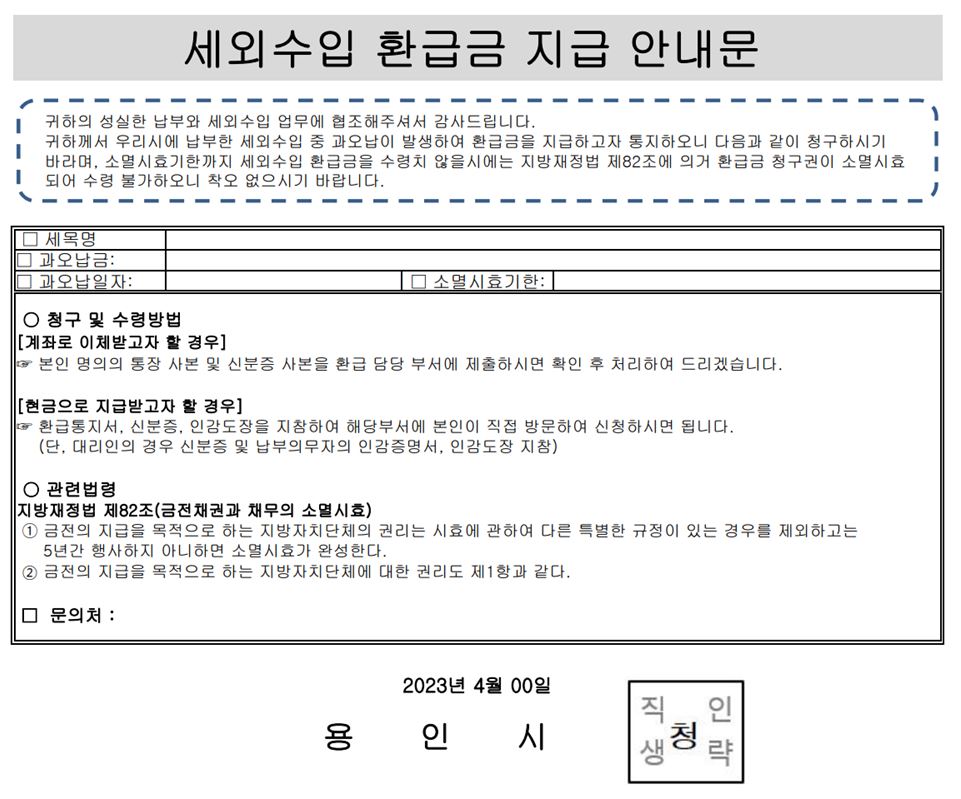 용인특례시, 몰라서 못받은 세외수입 환급 내달28일까지 지급해요