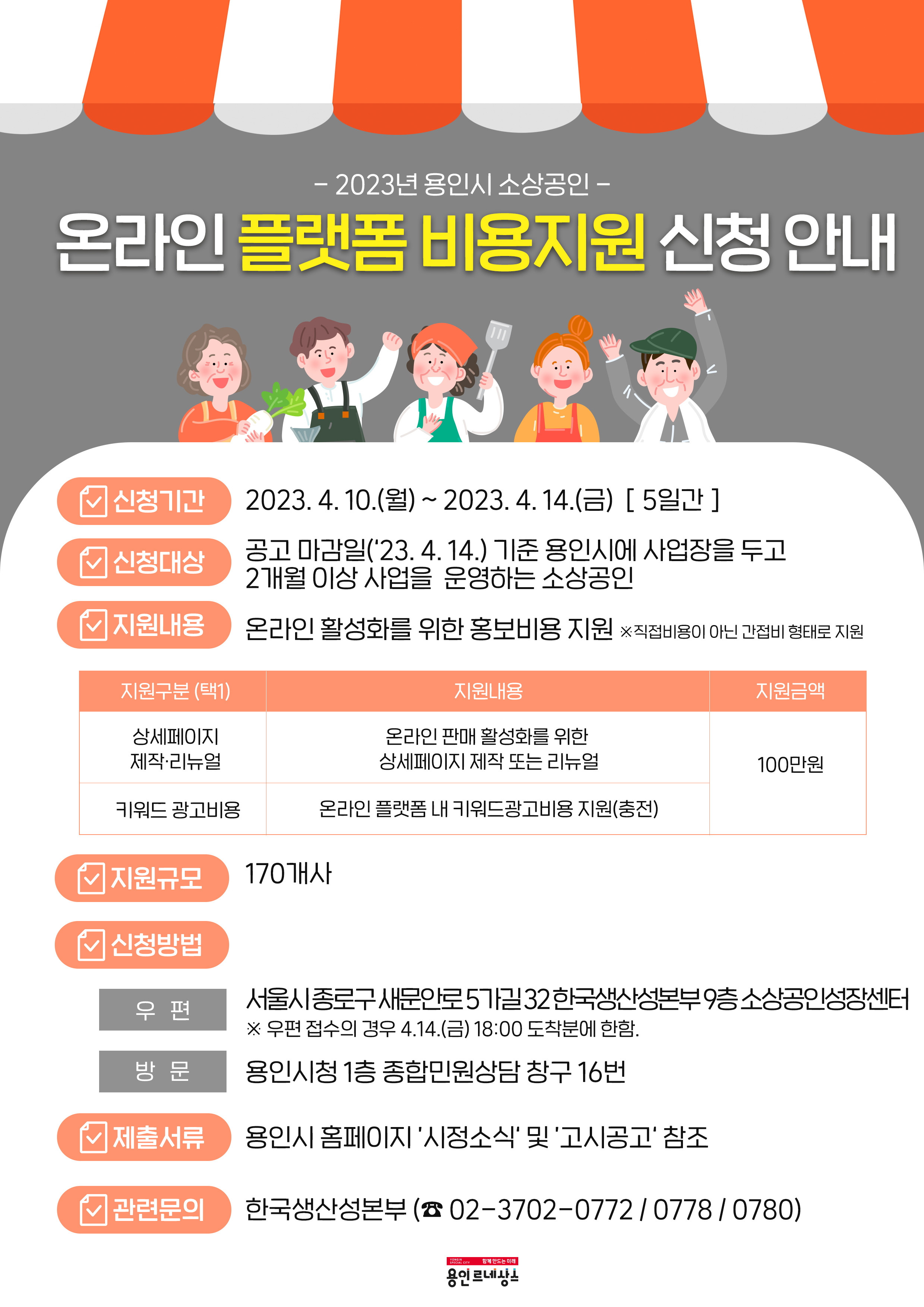 용인특례시, 온라인 홍보비 지원받을 용인 소상공인 모집 - 10~14일 170명 대상…상품 소개 이미지 제작·키워드 광고비 등 100만원 지원 - 김경순 기자 2023-04-03 21:55 가 본문내용 확대/축소 본문 용인특례시, 온라인 홍보비 지원받을 용인 소상공인 모집 용인특례시(시장 이상일)가 최대 100만원의 온라인 홍보비를 지원받을 관내 소상공인 170명을 10일부터 14일까지 모집한다. 시는 소상공인의 온라인 시장 경쟁력을 강화해 신규 판로를 개척하도록 돕기 위해 올해 처음으로 ‘소상공인 온라인 플랫폼 비용 지원사업’을 마련했다. 지원 분야는 상품 소개 이미지 제작‧개편과 키워드 광고비 등 두 가지로 나뉜다. 대상자로 선정되면 둘 중 한 가지를 선택해 지원받을 수 있다. 대상자들은 시가 지정한 홍보대행사를 통해 상품 소개 이미지를 제작‧개편하거나 키워드 광고를 집행한 뒤 관련 증빙자료를 위탁기관인 한국생산성본부에 제출하면 된다. 신청 대상은 시에 사업장을 두고 2개월 이상 사업체를 운영하는 소상공인이다. 다만 올해 시의 재도약 환경개선 지원사업 대상자로 선정됐거나 휴‧폐업 중인 사업자, 지방세 체납 사업자는 제외된다. 신청을 하려면 시 홈페이지에서 신청서를 내려받아 시청 1층 종합민원상담실의 16번 창구에서 접수하거나 한국생산성본부 소상공인성장센터(서울시 종로구 새문안로 5가길32,9층)로 우편을 보내면 된다. 시는 사업기간과 매출 현황, 사업의 타당성 등을 심사해 오는 28일 최종 대상자를 발표할 예정이다. 시 관계자는 “관내 소상공인이 온라인 시장에서 자생력을 갖추도록 돕기 위해 이번 사업을 마련했다”며 “많은 소상공인이 신청해 실질적인 도움을 얻기 바란다”고 말했다. 좋아요 0 싫어요 0 김경순 기자 기자의 다른기사 보기 목록 댓글목록 이전글 용인특례시, 청년 김대건길 험준했던 2km 구간 정비 23.04.03 다음글 용인어린이상상의숲 <모여라! 상상해 ‘봄’ 놀이터> 성료 23.04.03