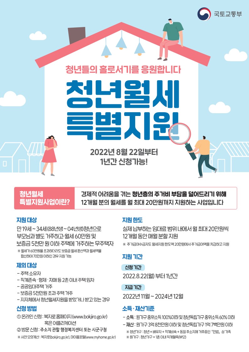 용인특례시, '청년월세 특별지원사업' 신청하세요 - 8월 21일 신청자 모집 종료…국토부 사업으로 연간 최대 240만원 지원 김경순 기자 2023-04-18 07:56 가 본문내용 확대/축소 본문 용인특례시, '청년월세 특별지원사업' 신청하세요 용인특례시(시장 이상일)가 청년의 주거비 부담을 완화하기 위해 ‘청년월세 한시 특별지원사업’ 신청자를 오는 8월 21일까지 모집한다고 18일 밝혔다. 청년월세 한시 특별 지원 사업은 1년 동안 최대 12번에 걸쳐 월 20만원 범위 내에서 주택 임차료를 지원하는 국토교통부 사업이다. 지원 자격은 만19세부터 34세까지 독립 세대 무주택 청년으로 보증금 5000만원, 월세 60만원 이하 월세 거주자다. 월세가 60만원을 초과해도 보증금의 월세 환산액(보증금*2.5%/12)과 월세 합계액이 70만원 이하면 지원 대상에 포함된다. 대상자의 소득 및 재산 요건도 충족해야한다. 청년 본인 가구 소득평가액은 기준 중위소득 60%(1인 가구 기준 124만원)이하, 재산가액은 1억 700만원 이하다. 아울러 부모를 포함한 원가구 소득평가액은 기준 중위소득 100%(3인 가구 기준 443만원) 이하, 재산가액은 3억 8000만원 이하다. 다만 청년이 ▲혼인 ▲30세 이상 ▲미혼부ㆍ모 또는 20대가 중위소득 50%(1인 가구 기준 103만원 이상) 이상 독립 생계 유지 등 지방자치단체장이 인정하는 경우 부모를 포함한 원가구 소득은 평가하지 않는다. 신청은 복지로(www.bokjiro.go.kr) 홈페이지나 주소지 행정복지센터에서 가능하다. 자세한 내용은 마이홈 콜센터(1600-0777), 용인시 콜센터(1577-1122), 용인시 청년담당관(031-324-2762)으로 문의하면 안내받을 수 있다. 시 관계자는 "청년을 위한 특별지원 사업이 올해 8월에 신청 종료된다“며 ”지원 대상에 해당하는 많은 청년들이 서둘러 신청하여 혜택을 받기 바란다“고 말했다. 좋아요 0 싫어요 0 김경순 기자 기자의 다른기사 보기 목록 댓글목록 이전글 용인특례시,‘범죄예방 생활안전디자인 도입’ 주민설명회 열었다 23.04.18 다음글 용인특례시, 오·폐수 배출업체 순찰점검 강화 23.04.18