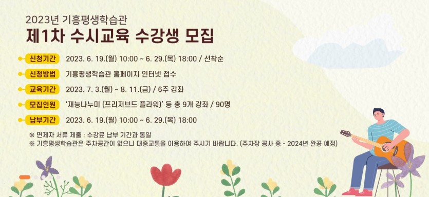 기흥평생학습관, ‘제1차 수시교육 수강생’ 모집 -‘재능나누미(프리저브드 플라워), 셀프스타일링’등 총 9개 강좌 마련 - 김경순 기자 2023-06-09 10:45 가 본문내용 확대/축소 본문 기흥평생학습관, ‘제1차 수시교육 수강생’ 모집 용인특례시 기흥평생학습관이 오는 19일부터 29일까지 ‘제1차 수시교육 수강생’을 모집한다고 8일 밝혔다. 다음 달 3일부터 8월 11일까지 총 6주 과정으로 마련된 교육 프로그램은 9개 강좌 90명을 선착순 모집한다. 교육은 ▲기술실용 분야 ‘재능나누미’(프리저브드 플라워) ▲직업능력 분야 ‘에코힐링 2급 걷기지도자’ ▲뷰티 분야 ‘셀프스타일링’(메이크업, 헤어) ▲인문교양 분야 ‘현지에서 활용하는 실전 여행영어’, ‘자신감 UP! 사람을 바꾸는 스피치’, ‘웰라이프의 삶’ ▲문화예술 분야의 ‘우드릴리프(목판부조) 초급반’, 라탄공예(감성소품 만들기)‘, ’내 삶의 활력을 위한 통기타 배우기‘ 등 총 9개 강좌다. 이 중 ’평생교육 재능나누미‘ 강좌는 수업 종료 후 수요처에 성과물을 기탁하면 봉사 시간을 인정받는 배움과 나눔, 성장 선순환 프로그램이다. 강좌 신청 대상은 만 19세 이상의 용인시민이다. 또 지역 내 직장인과 시에 등록된 재외국민, 결혼이민자도 신청할 수 있다. 수강료는 강좌 기간 및 시간에 따라 1만5000원부터 3만원이며, 재료비는 별도 자부담으로 운영한다. 접수 방법은 기흥평생학습관 홈페이지(https://lll.yongin.go.kr/giheung)에서 온라인으로 신청하면 된다. 좋아요 0 싫어요 0 김경순 기자 기자의 다른기사 보기 목록 댓글목록 이전글 이상일 용인특례시장,“5차 국가철도망 구축 계획에 경강선 연장과 경기남부 3호선 연장 포함돼야” 23.06.09 다음글 이상일 용인특례시장“북한은 주적, 강한 안보태세 가져야” 23.06.09
