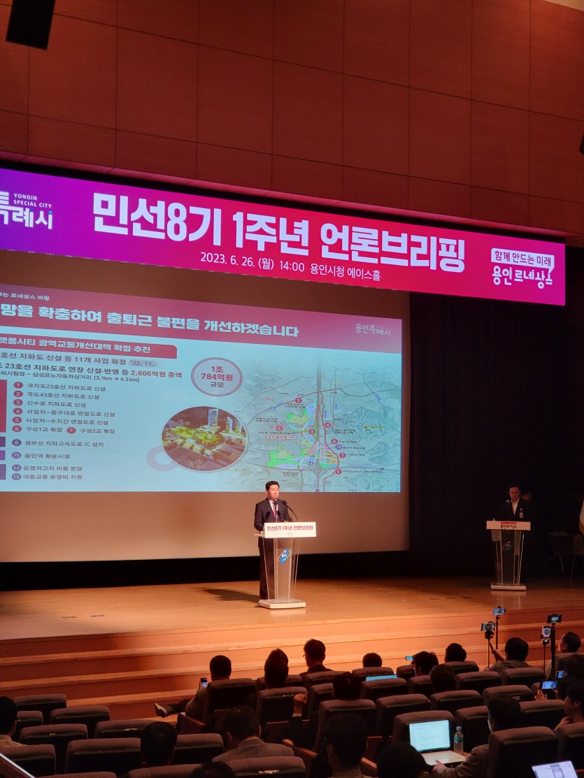 이상일 용인특례시장,“‘용인 르네상스’혁신 향해 시동 건 첫 해”평가 - 26일 시청 에이스홀서 언론간담회 열고 지난 1년 시정 성과와 과제 등 설명 - - “남사·이동 국가산업단지 후보 지정은 1년 성과‘금자탑’ ” - - “민선 7기 숙원사업, 민선 8기에서 돌파구 마련, 생활밀착형 정책에 시민 만족” - - 시의 과제…‘도시 역사와 정체성 살리기’, ‘철도·도로망 확충’ ,‘인프라 확충 통한 도시품격 높이기’ - 김경순 기자 2023-06-26 16:50 가 본문내용 확대/축소 본문 이상일 용인특례시장,“‘용인 르네상스’혁신 향해 시동 건 첫 해”평가 “지난 1년은 각 부문에서 변화와 혁신의 시동을 걸고 상당한 성과를 낸 한 해였다. 많은 시민께서 ‘용인 르네상스’가 실감 난다고 말씀하신다. 휴일에도 쉼 없이 일하느라 피로가 많이 쌓였지만 보람을 느낀다. 남은 임기 동안 초심을 지키며 최선을 다하겠다.” 이상일 용인특례시장은 민선 8기 용인특례시장 취임 1주년을 맞아 26일 시청 에이스홀에서 언론 브리핑을 열어 지난 1년간의 시정 성과를 보고하고, 앞으로의 시정 비전과 할 일을 발표했다. 이 시장은 1년간의 성과 중 ‘용인 남사·이동 시스템반도체 국가산업단지 후보지 지정’을 ‘금자탑’으로 꼽았다. 이와 함께 ‘민선 7기에 해결 안 된 각종 숙원사업 해법 마련’, ‘생활밀착형 정책과 시민 만족’ 등을 성과로 꼽았다. 또 앞으로의 과제로 ’도시의 역사와 정체성 살리기‘, ‘철도·도로망 확충’, ‘인프라 확충 등을 통한 도시품격 높이기’ 등을 제시했다. 이 시장은 첨단 시스템반도체 국가산단의 용인 유치를 성과의 금자탑이라고 자평했다. 이 시장은 지난해 7월1일 취임하자마자 ‘글로벌 반도체 중심도시 추진 전략’을 가장 먼저 결재했다. 전국 최초 ’반도체 산업 육성·지원 조례‘ 제정, 실질적·전문적 정책 자문을 위한 ’용인 반도체 산업 경쟁력 강화 위원회‘ 구성해 운영하는 반도체 생태계 구축을 위한 정책을 마련했다. 이 시장은 ’용인 국가산단조성지원추진단‘을 구성, 성공적인 국가산단 조성을 위해 범정부 추진지원단과 유기적으로 소통하고 있다. 용인시는 27일 국토교통부, 경기도, 삼성전자, 한국토지주택공사와 국가산단 조성협약을 맺는다. 이 시장은 “전 세계가 반도체 기술 경쟁력 확보에 사활을 걸고 있고 산업 초격차 유지를 위해 클러스터 가동 시기를 최대한 앞당겨야 하는 만큼 유관기관들이 각종 인허가 절차를 최대한 단축해서 착공 시기를 2025년 말로, 1년 앞당길 수 있도록 노력하겠다”고 말했다. 이 시장은 앞으로 제2용인테크노밸리와 원삼 반도체협력단지 추가 조성, 반도체 인력과 가족들을 위한 정주환경을 갖춘 배후도시 건설, 맞춤형 인재 양성을 위한 AI·반도체 마이스터고등학교 신설, 석·박사급 인재 양성을 위한 지역 내 대학 계약학과 및 반도체특성화 교육 과정 운영 등을 추진한다. 반도체 기업을 위한 신속한 인허가와 사전컨설팅 등 적극적인 행정지원과 함께 반도체민자 고속도로, 경강선 연장(광주 삼동~용인 남사), 국도 45호선과 국지도 57호선·82호선의 확장과 신설 등 반도체 교통 인프라 확충을 위해 자신과 시의 모든 에너지를 투입하겠다고 밝혔다. 민선 7기에 해결되지 않았던 용인의 각종 숙원사업에 대한 해법을 마련한 것도 이 시장이 꼽은 민선 8기 용인특례시의 성과다. 이 시장은 취임 직후 두 달여 만에 고기교 확장과 주변 도로 확충과 관련해 경기도·성남시와 업무협약을 맺는 성과를 이끌어 냈다. 올 하반기 경기도가 주변 교통영향분석 연구용역을 진행해 내년 하반기에는 고기교를 다시 건설할 수 있게 된다. 이 시장은 경기용인 플랫폼시티 개발 이익금을 온전히 용인에 재투자한다는 사실을 명문화했다. 진·출입로가 없어 아파트를 짓고도 2년이 넘도록 입주하지 못한 ’삼가2지구 민간임대주택 대체도로‘ 개설방안을 마련하고, 16년간 답보상태에 있던 보라동 지방도 315호선은 국토교통부를 설득해서 지하도로로 건설하기로 했고, 다음 달 공사에 들어간다. 이 시장은 한강수계법과 군시시설보호법 등으로 중첩 규제를 받고 있던 포곡읍 일대 규제 해제를 위해 환경부 등과 소통해 왔음을 밝히고 좋은 결과가 나올 것이라고 했다. 처인구민들의 숙원인 경강선 연장은 남사·이동 시스템반도체 국가산단 지정으로 탄력을 받고 있고, 지하철 3호선 경기 남부 연장은 이 시장이 화성시의 동참을 이끌어내면서 가능성을 키웠다. 이 시장은 “무엇이 문제인지 분석하고 문제를 해결할 전략을 세운 뒤 제가 가진 다양한 인적 네트워크를 전방위로 활용해 시정 운영에 적극 활용하고 있다. 앞으로도 좋은 결과를 내기 위해 분주히 움직이겠다”고 말했다. 이 시장은 생활밀착형 정책을 발굴, 시민의 일상생활의 불편을 덜어낸 것도 큰 성과로 꼽았다. 상습 정체 구간이던 용인대입구 삼거리에 가변차로를 도입하고, 마평교차로 회전램프 구간은 차로를 확장하는 등 교통체계 개선을 통해 주민 교통 불편을 덜었다. 대형차량이 진입하지 못하는 골목길에 친환경 소형 전기노면 청소차 3대를 도입해 큰 호응을 얻었고, 소형 보도 제
