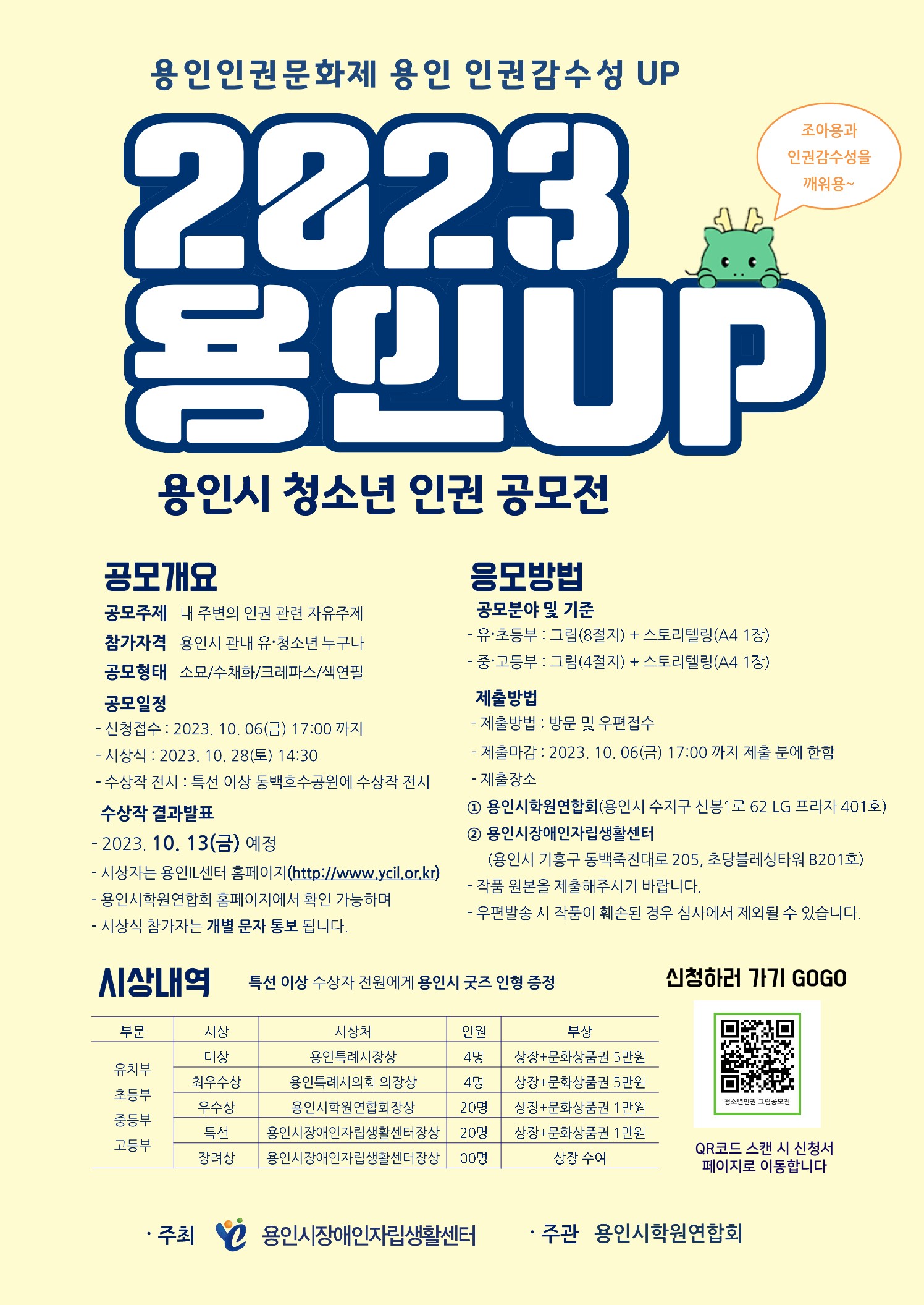 [2023년 용인UP - 용인시 청소년 인권 그림 공모전 진행] 김경순 기자 2023-08-29 21:37 가 본문내용 확대/축소 본문 [2023년 용인UP - 용인시 청소년 인권 그림 공모전 진행] 용인시장애인자림생활센터(소장 김정태)는 용인시의 인권감수성을 높이고 인권은 어렵지 않고 우리 주변에서 쉽게 지킬 수 있는 것임을 알리고자 용인시장애인자립생활센터 주최, 용인시학원연합회(회장 이경호) 주관으로 청소년의 올바른 인권문화 참여와 인권 친화적인 문화 확산을 위해 유치원, 초 중 고등학생을 대상으로 인권 포스터를 공모한다고 밝혔다 김정태소장은 이번 인권 문화제 인권포스터 공모전을 준비하면서 장애 당사자가 주체가 되어 운영하는 센터지만 장애인의 인권이 중요하듯 나와 우리 모두의 인권이 함께 중요함을 알리고자 공모주제를 『내 주변의 인권 관련 자유주제』로 선정하였다고 밝혔다. 또한 인권에 대해 많은 사람이 어렵고 무거운 주제로 받아들이고 있어 인권은 어렵지 않고 우리 주변에 작은 문제들에서부터 시작되는 것임을 알리고자, 포스트 공모전도 아이들과 용인시민들에게 친숙한 용인시의 조아용 캐릭터로 『조아용과 인권감수성을 깨워용』을 접목함으로 시민들에게 인권이 무겁거나 어렵지 않고 상대를 배려하는 작은 마음부터 시작하는 것임을 알리고 싶다고 말했다.이번 공모전은 2023년 10월 06일까지 접수하며 접수는 용인시장애인자립생활센터나 용인시학원연합회로 작품과 함께 작품 설명서를 함께 제출하면 된다, 심사를 통해 선정된 작품은 각 분야별로 용인특례시장상과 용인특례시의회 의장상을 수여하며 용인시 조아용 인형을 함께 부상으로 수여한다.또한 선정된 작품은 10월 28일 용인동백호수공원에서 진행되는 [2023 용인UP 용인인권 문화제]에서 시상 및 작품전시회를 진행한다.공모전 응시는 용인시장애인자립생활센터 홈페이지(ycil.or.kr) 또는 용인시학원연합회(blog.naver.com/yonginhakwon1) 블로그를 참고하면 자세한 사항을 확인할 수 있다 좋아요 0 싫어요 0 김경순 기자 기자의 다른기사 보기 목록 댓글목록 이전글 기술과 예술 기반의 시민 문화예술 소통 공간 ‘용인문화도시플랫폼 : 공생광장’ 개관 23.08.29 다음글 용인특례시의회 의원연구단체 「용인특례시 관광발전을 위한 의원연구단체」, 전라남도 여수시 관광산업 벤치마킹 23.08.29