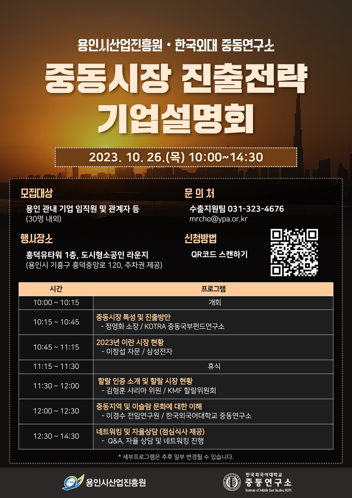 용인시산업진흥원(이사장 이상일, 이하 진흥원)이 다가오는 10월 26일 목요일에 한국외국어대학교 중동연구소와 ‘2023년 중동시장 진출전략 기업설명회’를 공동 개최한다고 밝혔다.