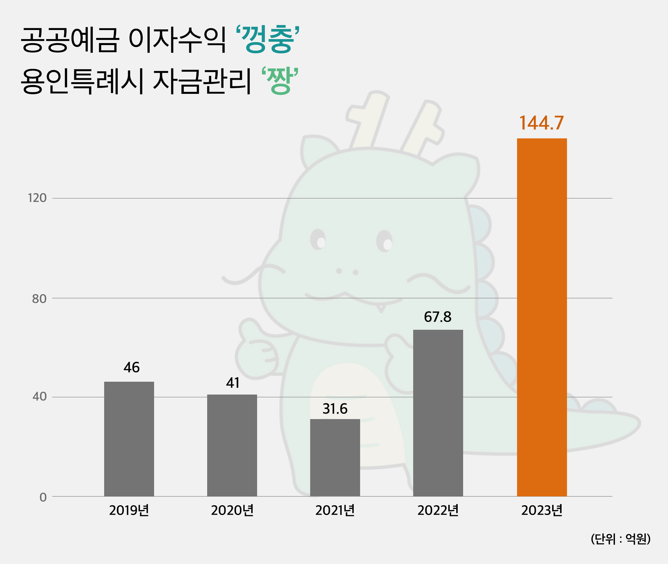 용인특례시, 공공예금 이자수입 145억원…최근 5년 내 최고치 - 지난해 68억원 대비 112% 증가…대기성 자금 최소화한 정기예금 적극 활용 김경순 기자 2023-11-28 07:58 가 본문내용 확대/축소 본문 용인특례시, 공공예금 이자수입 145억원…최근 5년 내 최고치 용인특례시(시장 이상일)가 올해 최근 5년 동안 가장 많은 이자 수입을 얻어 주목된다. 용인특례시는 2023년 공공예금 이자수입이 지난해 연간 이자수입인 68억원 보다도 112% 증가한 145억원에 달한다고 28일 밝혔다. 대기성 자금을 최소화하고 금리가 높은 정기예금으로 자금을 효율적으로 운영한 것이 크게 작용했다. 시가 이처럼 많은 이자 수입을 거둘 수 있었던 것은 지난 3월 자금지출 종합계획을 수립해 월별 자금 수요와 예금 이율 변동 현황을 수시로 분석하면서 고액 지출이 필요할 경우 담당 부서와 사전에 조율하면서 대기 자금을 줄이도록 했다. 특히 예금 이자율이 높은 장·단기 정기예금에 최대한 자금을 예치하고 단기 지출에 필요한 자금은 이자율은 다소 낮지만 입출금이 자유로운 MMDA(수시입출식 예금)을 활용했다. 지출 전 필요한 액수만큼 MMDA를 해지해 사용하고 지출 후 잔액을 다시 최대한 예치할 수 있도록 해 대기성 자금을 최소화 한 것도 이자 수입을 높이는 데 톡톡한 역할을 했다는 분석이다. 시는 내년에도 자금지출 종합계획을 별도 수립해 일일 예금 운용 현황을 점검하는 등 다양한 방법으로 효과적으로 자금을 관리해 나갈 방침이다. 이상일 용인특례시장은 “직원들이 적극적으로 아이디어를 내 시민의 세금으로 조성된 공공예금을 효율적으로 관리해 많은 이자 수입을 거뒀다”며 “앞으로도 세출예산을 안정적으로 집행하고 낭비 요소를 없애는 등 재정 건전성을 높일 수 있는 다양한 정책을 강구해 나가겠다”고 말했다. 좋아요 0 싫어요 0 김경순 기자 기자의 다른기사 보기 목록 댓글목록 이전글 용인특례시, 공공예금 이자수입 145억원…최근 5년 내 최고치 23.11.28 다음글 용인특례시, 내년부터 시민안전보험 운용…사회 안전망 확대 노력 23.11.28
