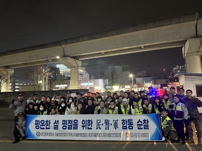 용인동부경찰서, 민・군 참여 평온한 설명절 분위기 조성 합동 순찰 실시 민・경・군 합동 순찰 시민 호응 커 - - 軍, 합동 순찰 동참, 지속 합동 순찰 참여 예정 - 김경순 기자 2024-02-08 21:17 가 본문내용 확대/축소 본문 용인동부경찰서, 민・군 참여 평온한 설명절 분위기 조성 합동 순찰 실시 용인동부경찰서(서장 김성구)는 지난 7일 민・군과 함께 평온한 설명절 분위기 조성을 위해 용인전통시장 주변을 비롯해 군인아파트, 주택가 등 다중 운집 지역 중심으로 합동순찰을 실시했다고 밝혔다. ◦ 이번 합동 순찰에는 용인동부경찰서 자율방범대, 어머니방범대, 생활안전협의회 회원, 55사단 군사경찰대 등 50여명이 범죄예방을 위한 합동순찰을 실시 하였으며, 시민 대상으로 보이스피싱, 안전운전 등 예방 홍보 활동도 전개하여 시민들로부터 큰 호응을 받았다. ◦ 용인동부경찰서(김성구 서장)는 “설 명절 특별방범 활동으로 시민들이 설 연휴 기간 평온하게 보낼 수 있도록 최선의 노력을 다할 것이다”고 밝혔다 좋아요 0 싫어요 0 김경순 기자 기자의 다른기사 보기 목록 댓글목록 이전글 용인문화재단, 유·아동을 위한 상설 클래식 공연 ‘키즈인비또’개최 24.02.08 다음글 김영민 도의원, 국지도 84호선 화성 중리-용인 천리 도로개설공사 관련 민원 대책회의 가져 24.02.08