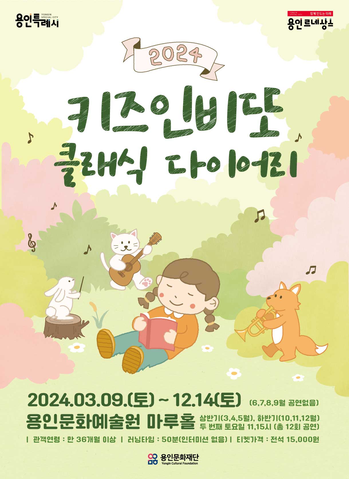 용인문화재단, 유·아동을 위한 상설 클래식 공연 ‘키즈인비또’개최 2월 13일 재단 홈페이지 및 인터파크 티켓에서 상반기(3~5월) 티켓 오픈 김경순 기자 2024-02-08 21:18 가 본문내용 확대/축소 본문 용인문화재단, 유·아동을 위한 상설 클래식 공연 ‘키즈인비또’개최 (재)용인문화재단(이사장 이상일)은 상반기(3~5월), 하반기(10~12월) 두 번째 토요일마다 용인문화예술원 3층 마루홀에서 유·아동을 위한 클래식 상설공연 <2024 ‘키즈인비또’ 클래식 다이어리>를 개최한다. 2024년 상반기 화사한 봄을 여는 <2024 ‘키즈인비또’ 클래식 다이어리>의 3월의 첫 공연은 어린이들에게 꾸준히 사랑받고 있는 디즈니와 지브리 만화 OST로 가득 채운 [키즈 시네마 콘서트]로 인어공주, 알라딘, 센과 치히로의 행방불명, 이웃집 토토로 등으로 친숙하고도 생동감 넘치는 클래식 공연으로 관객들의 기대를 모을 예정이고, 4월은 클래식 코믹 음악극 <엄마, 아빠 새는 음치왕!> 주제로 하여 피아노와 현악기, 성악으로 구성된 공연을 선보일 예정이며, 5월에는 르로이 앤더슨의 ‘고장 난 시계’, 모차르트의 ‘터키행진곡’ 등으로 타악기 앙상블을 감상하는 시간을 마련했다. 하반기의 시작 10월에는 스페인 문학 <돈키호테>를 중심으로 ‘알함브라하 궁전의 추억’, ‘사랑의 로망스’ 등을 통해 클래식 음악과 문학이 어우러져 찬란하고 아름다운 가을의 선율을 선보일 예정이며, 11월에는 <바게뜨 음악상자>로 피아노와 현악기, 관악기, 성악으로 지휘에 따라 섬세하고도 다채롭게 변화하는 클래식의 매력을 한껏 돋보이는 무대를 통해 초겨울의 정취를 선물할 예정이다. 이어 2024년의 마지막을 장식하는 12월 공연에서는 모두에게 사랑받는 차이콥스키 <호두까기 인형 하이라이트>로 아름답고 따듯한 멜로디와 화려한 무대로 관객의 귀와 눈을 사로잡을 예정이다. 본 공연은 36개월 이상 관람가로 티켓 가격은 전석 1만 5천 원이며, 2월 13일 오후 2시부터 용인문화재단 홈페이지 또는 인터파크 티켓에서 예매할 수 있다. 공연에 대한 자세한 사항은 용인문화재단 홈페이지 또는 CS센터(031-260-3355, 3358)를 통해 문의 가능하다. 좋아요 0 싫어요 0 김경순 기자 기자의 다른기사 보기 목록 댓글목록 이전글 용인세브란스병원, 인공관절 수술 로봇 ‘ROSA’ 도입 24.02.08 다음글 용인동부경찰서, 민・군 참여 평온한 설명절 분위기 조성 합동 순찰 실시 24.02.08